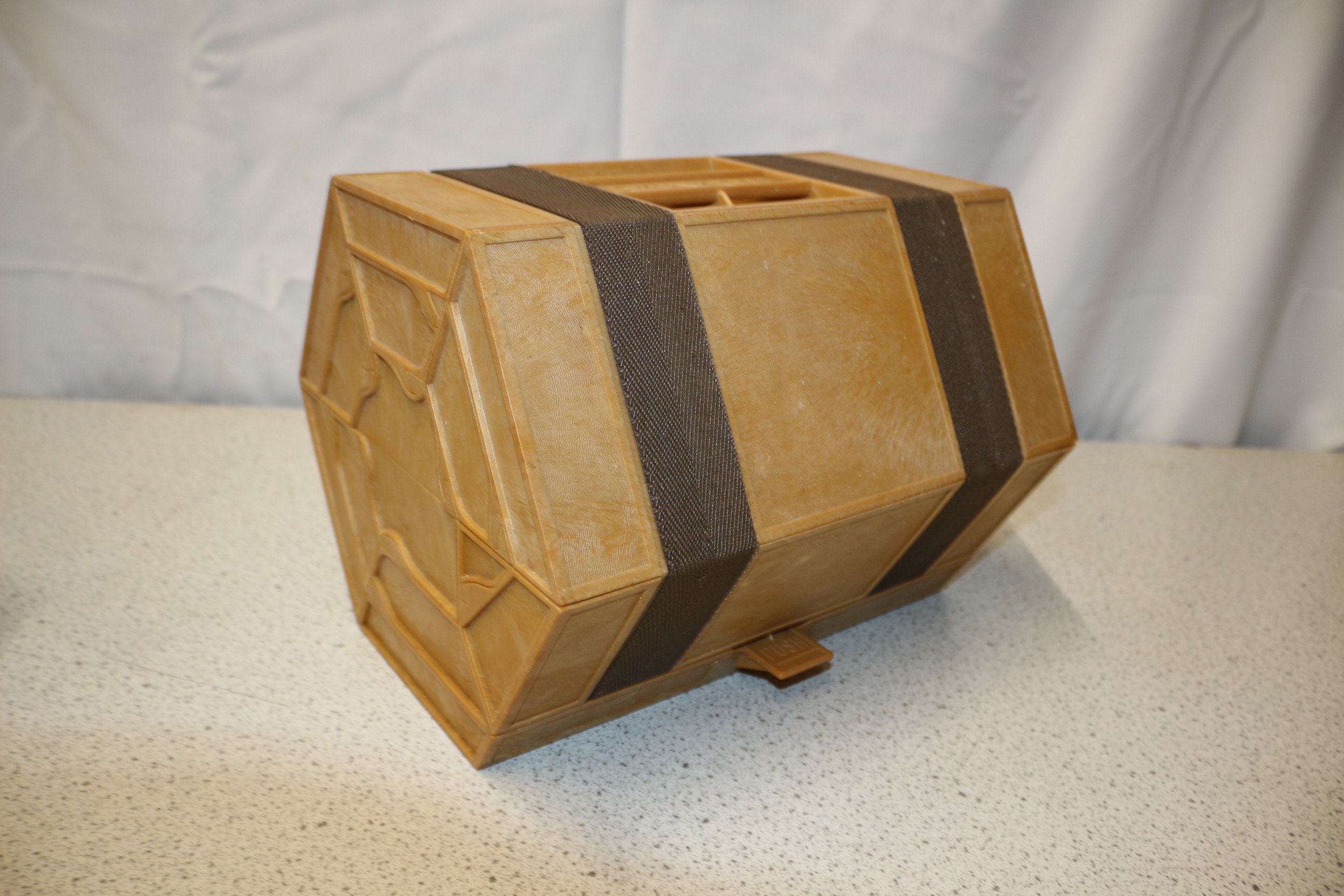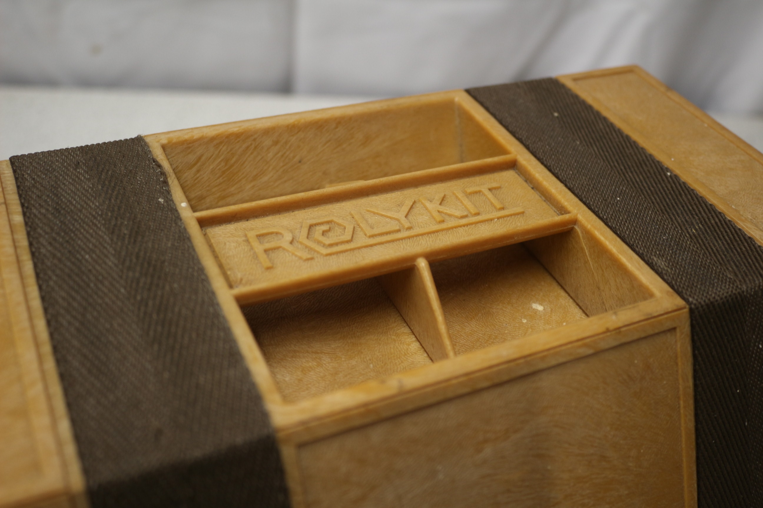 A light brown/tan Rolykit expanding roll-up storage case with multiple compartments and dark brown straps, featuring “PUSH” on a side tab. Invented in 1973 by Dutch film maker Samuel Meijering