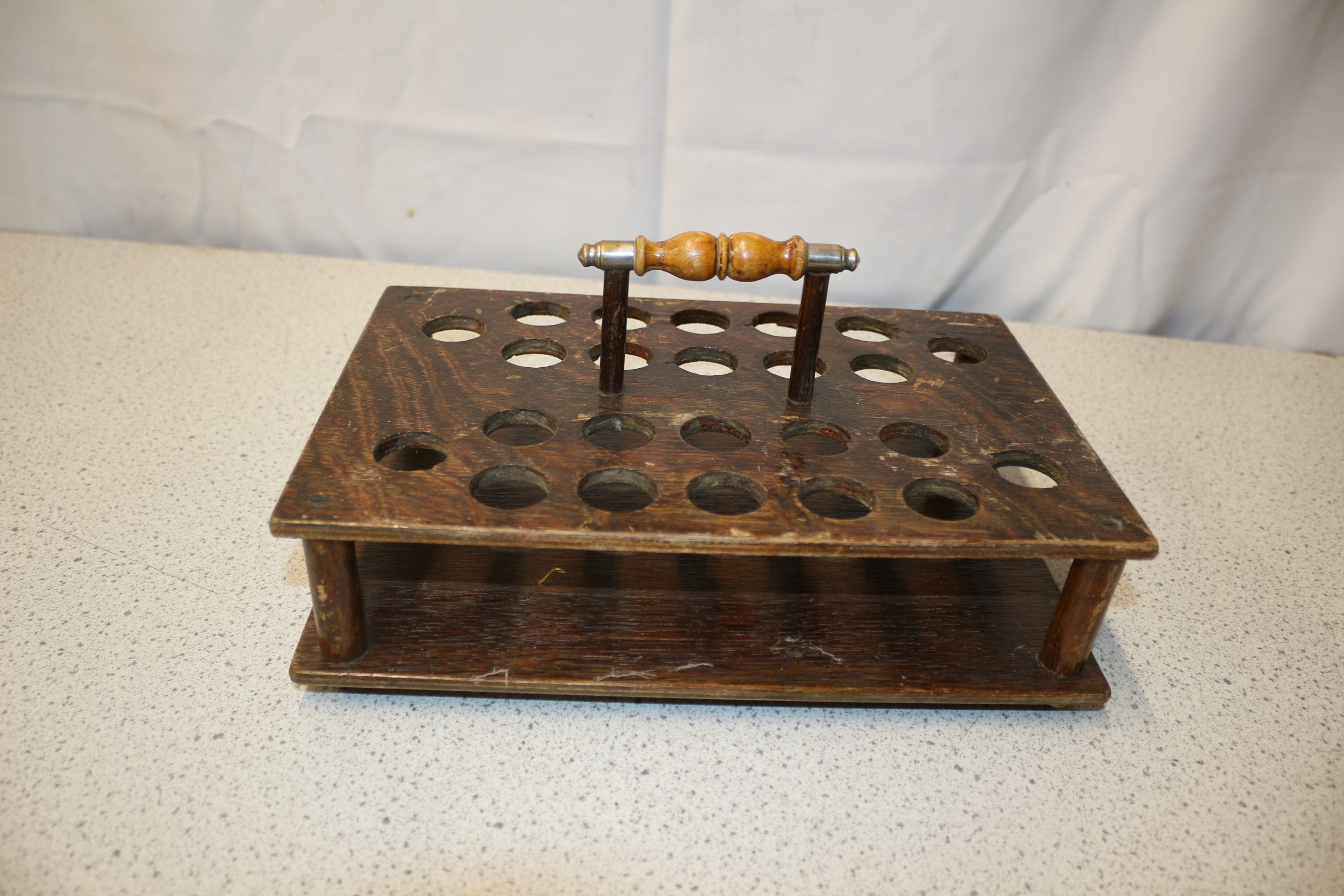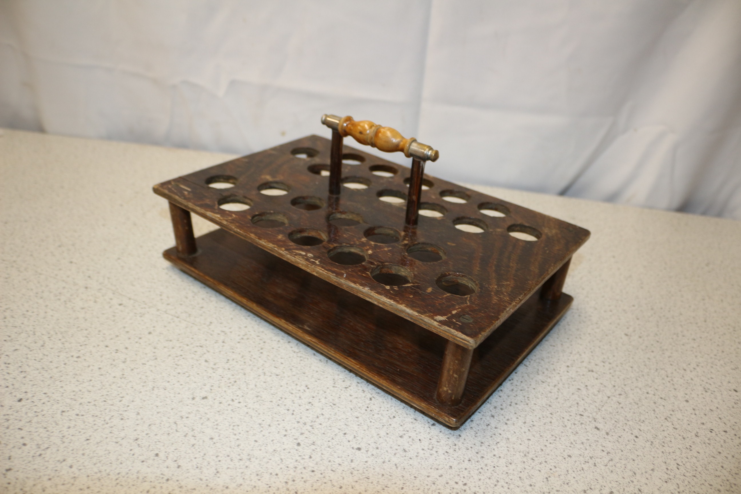 A Vintage Dark Brown Wooden Communion Tray or Test Tube Rack with Handle