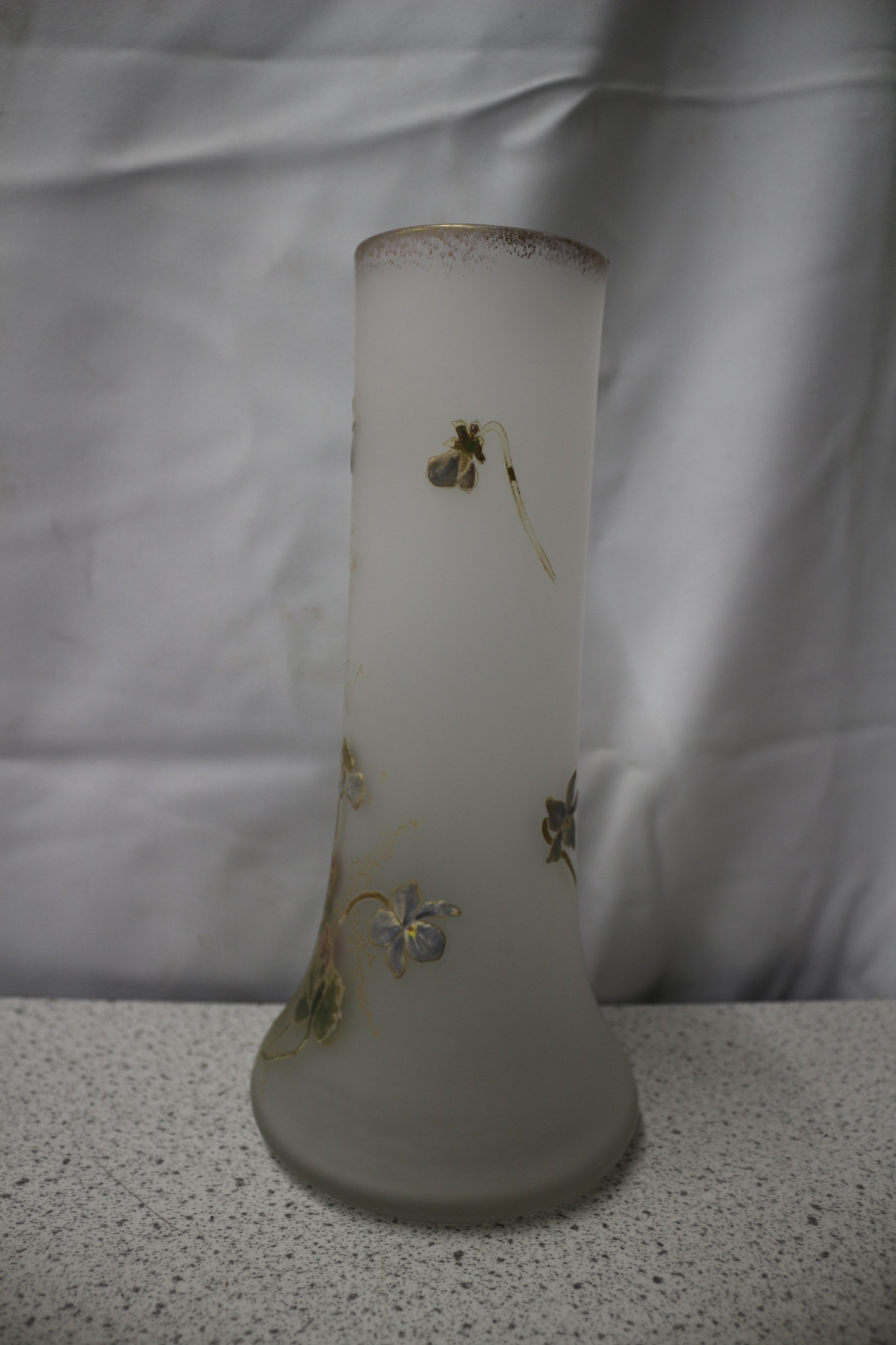 A satin glass Legras Art Nouveau white vase features purple-grey, green, pinkish-brown, and gold floral decoration, with no visible labels or inscriptions. 25cm tall