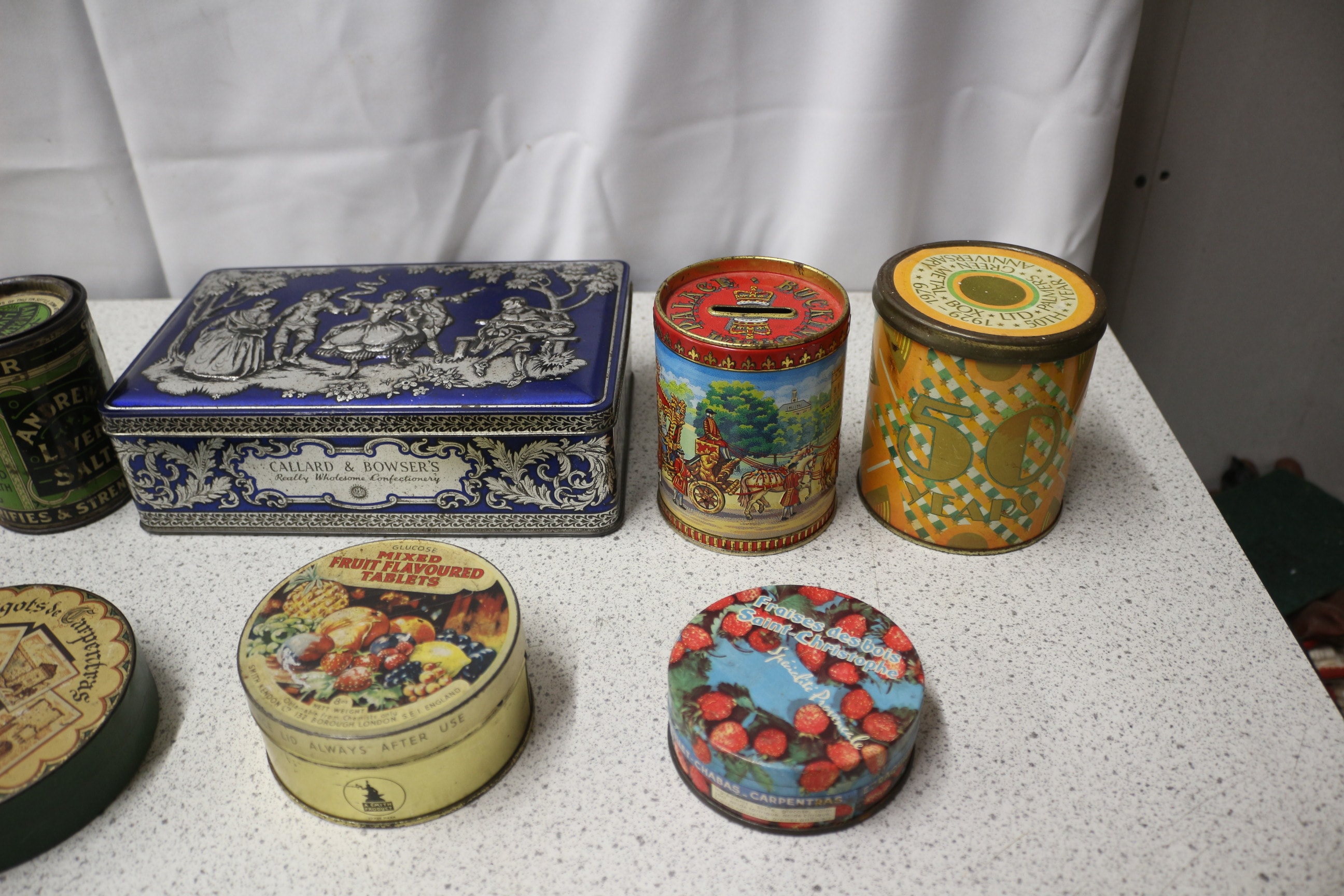 A collection of eight assorted vintage decorative tins, including a blue Callard & Bowsers tin with a dancing scene, a red Victoria tin, and a green Liver Salt tin.