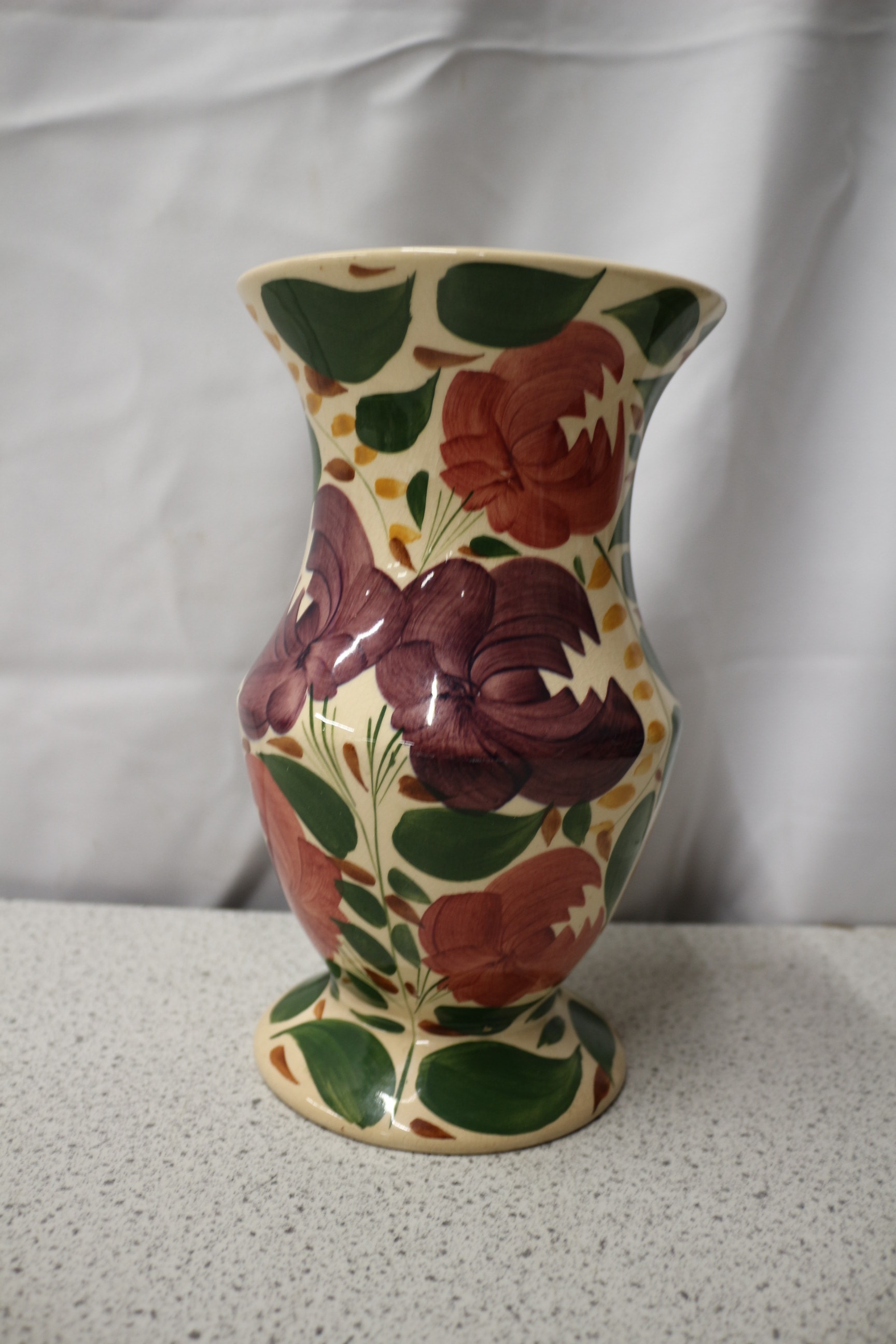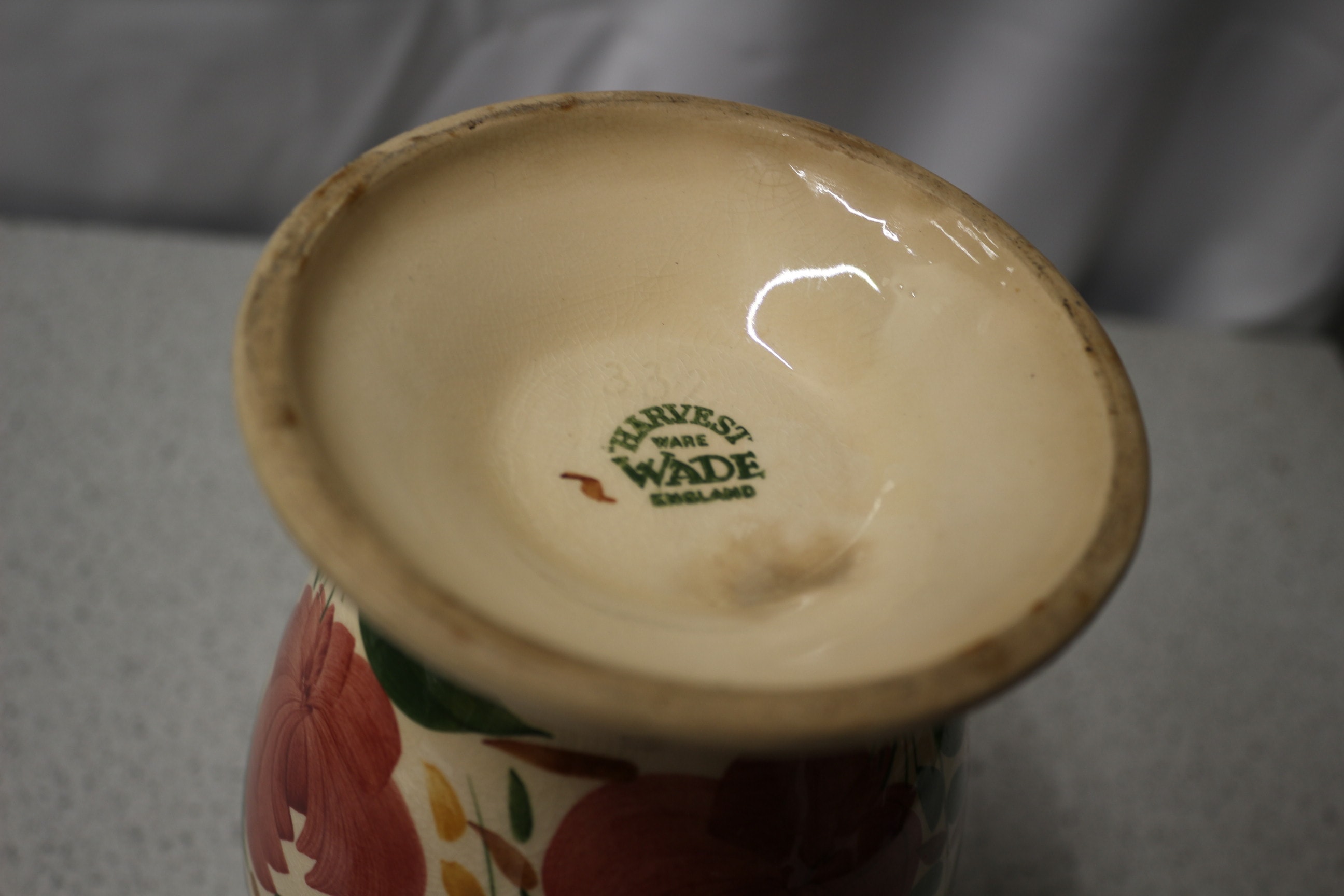 A ceramic vase, off-white with red, purple, green floral patterns and yellow accents, marked “HARVEST WARE WADE ENGLAND”. 22cm tall