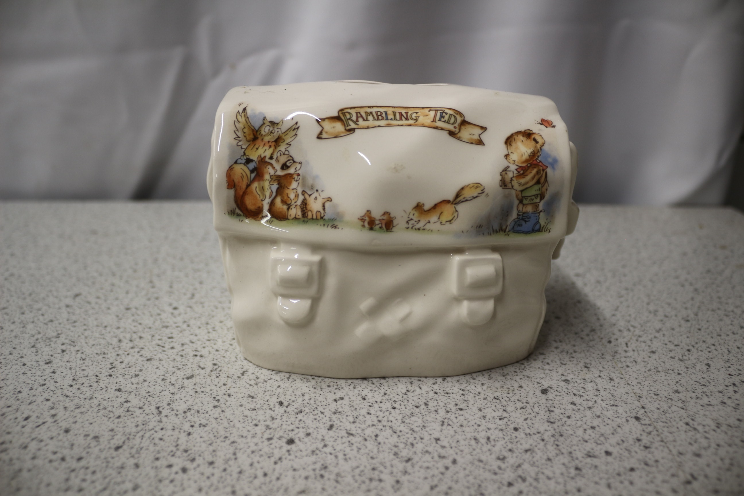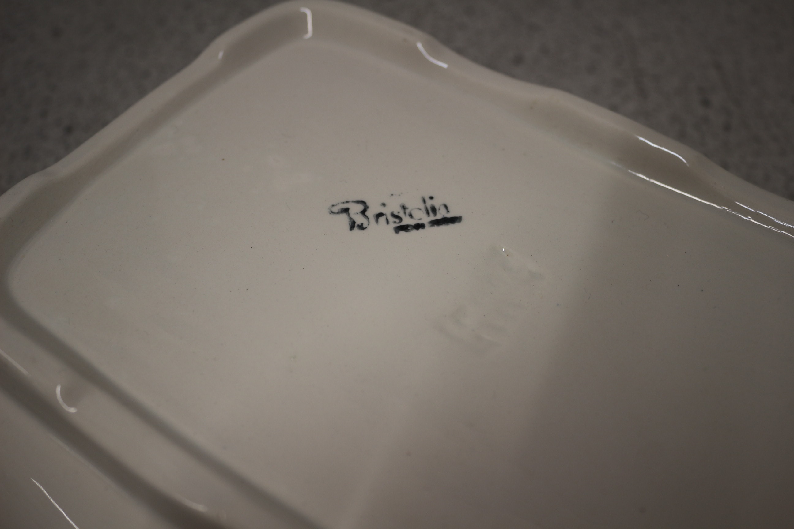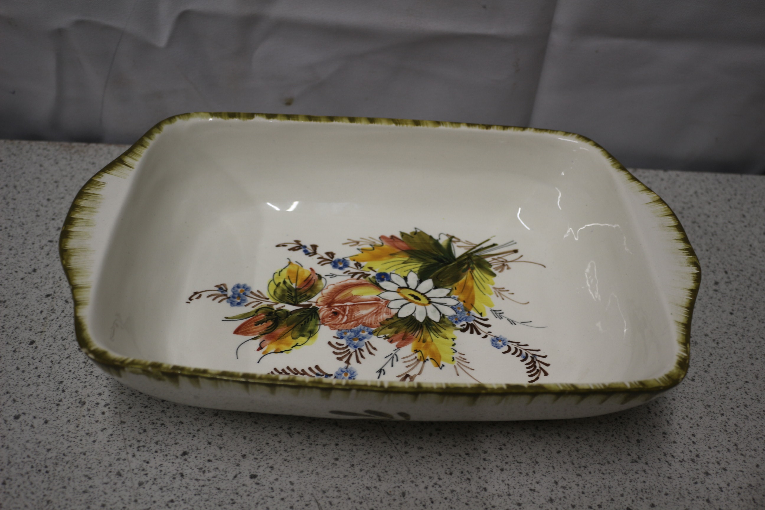 A cream-coloured rectangular baking dish featuring a hand-painted floral decoration and a distressed green-brown rim, marked ‘Bristoli’ on its underside. Rambling Ted Wedgwood money box, Masons Mandarin lidded sugar bowl and Masons gravy boat