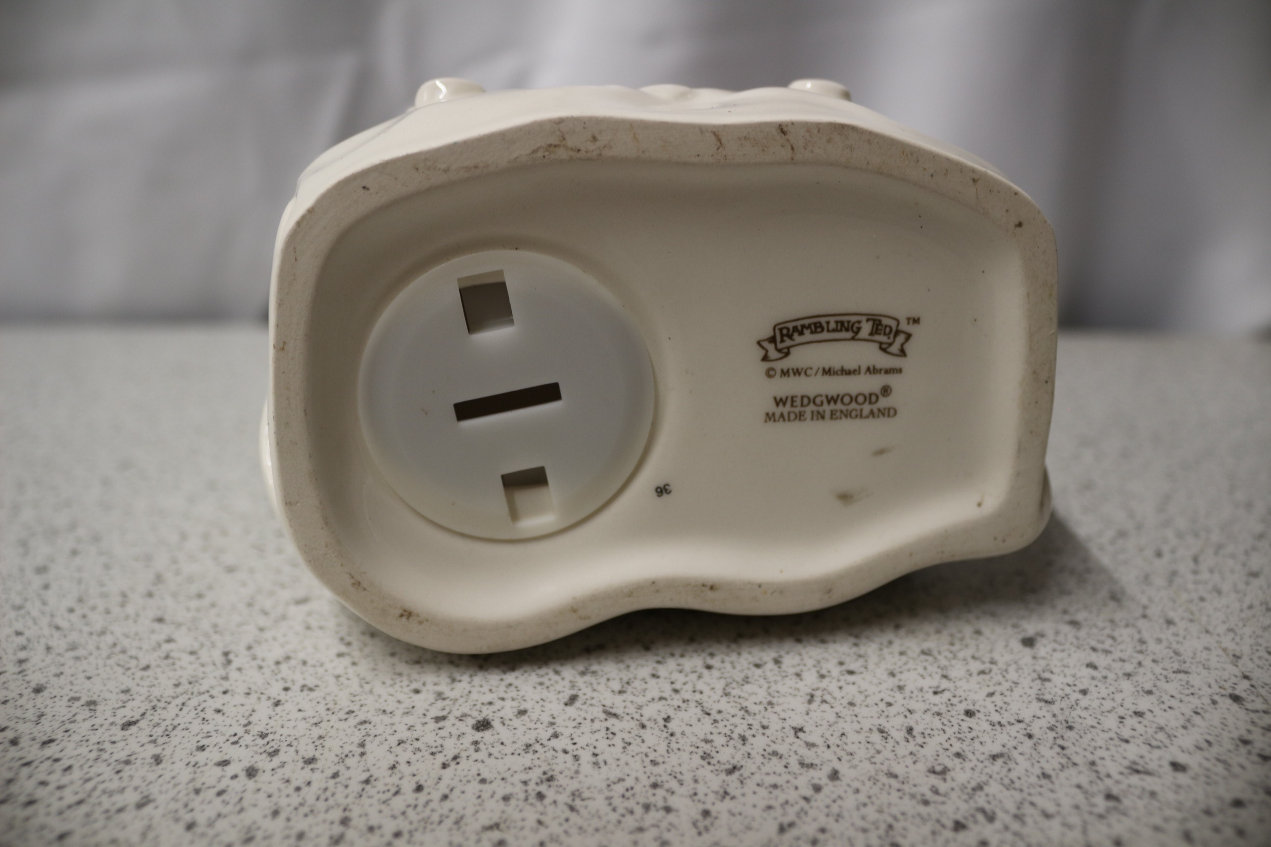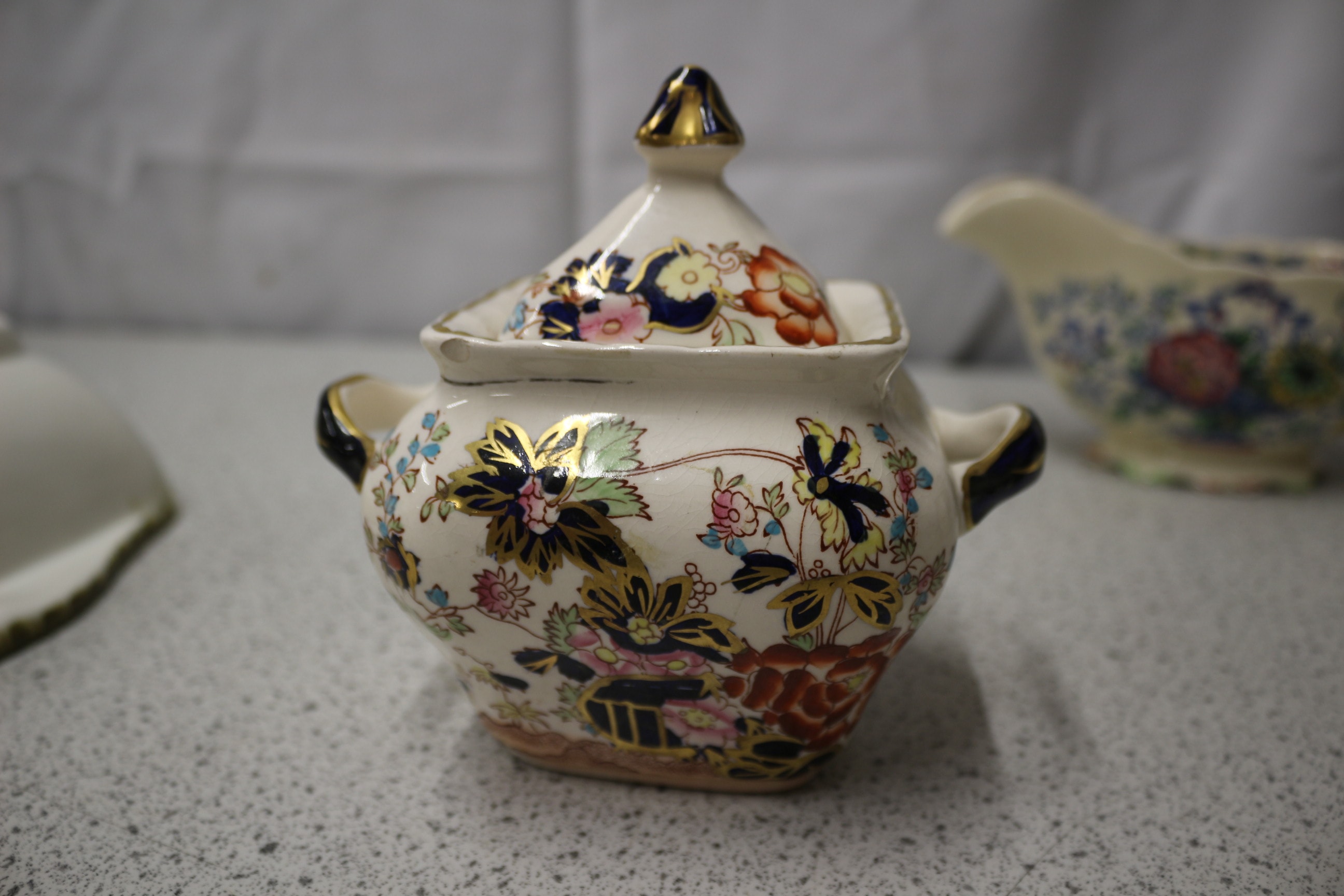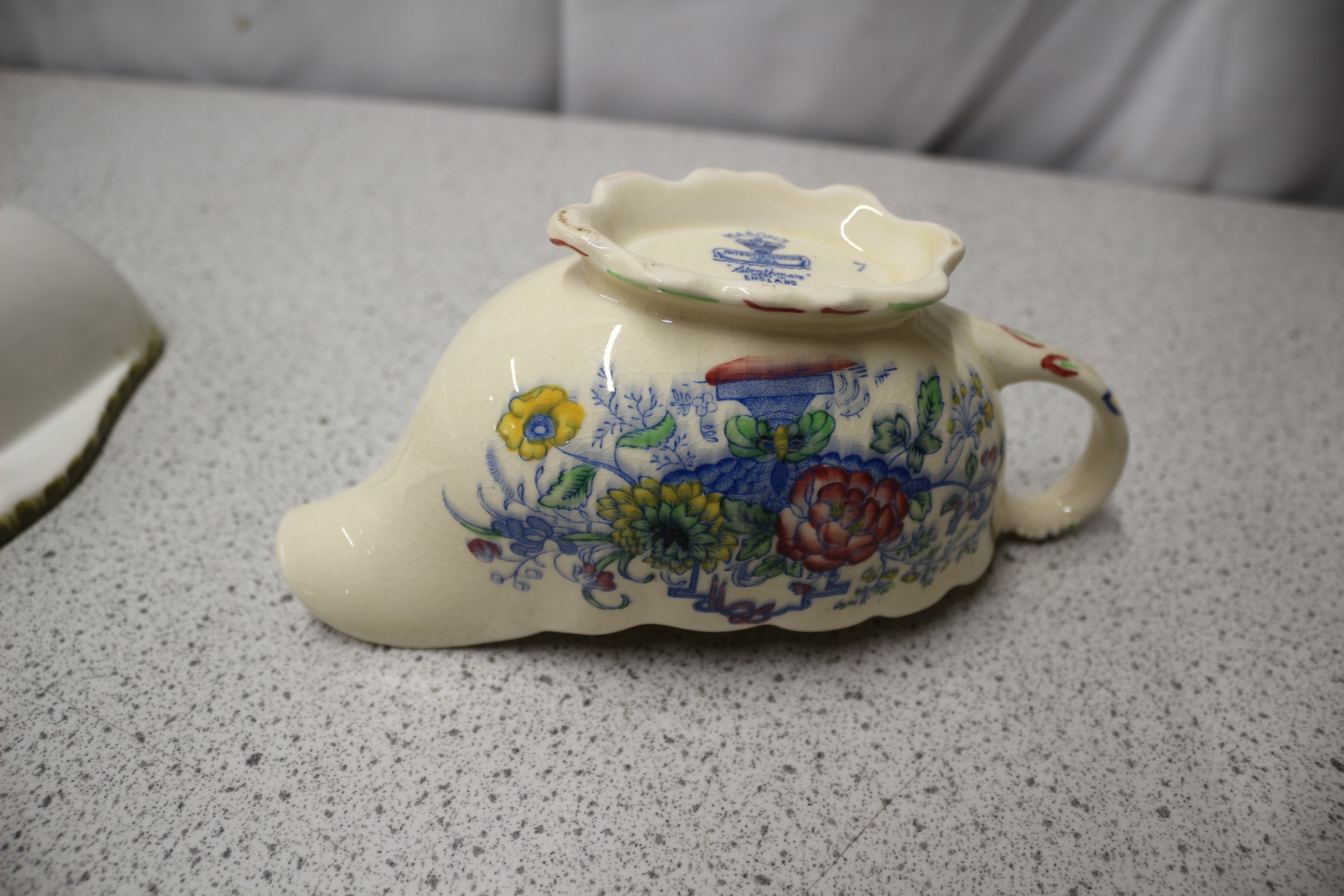 A cream-coloured rectangular baking dish featuring a hand-painted floral decoration and a distressed green-brown rim, marked ‘Bristoli’ on its underside. Rambling Ted Wedgwood money box, Masons Mandarin lidded sugar bowl and Masons gravy boat