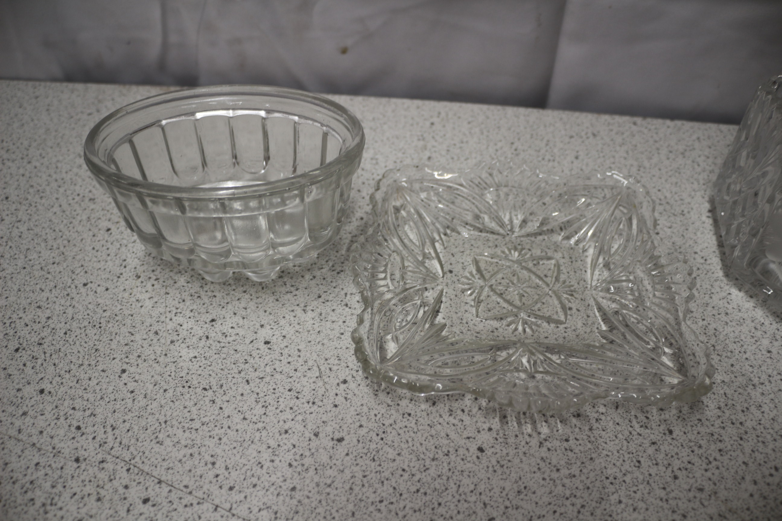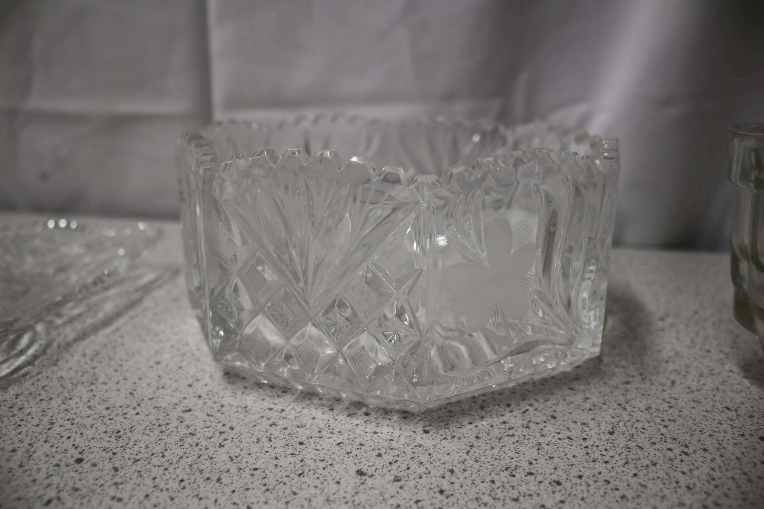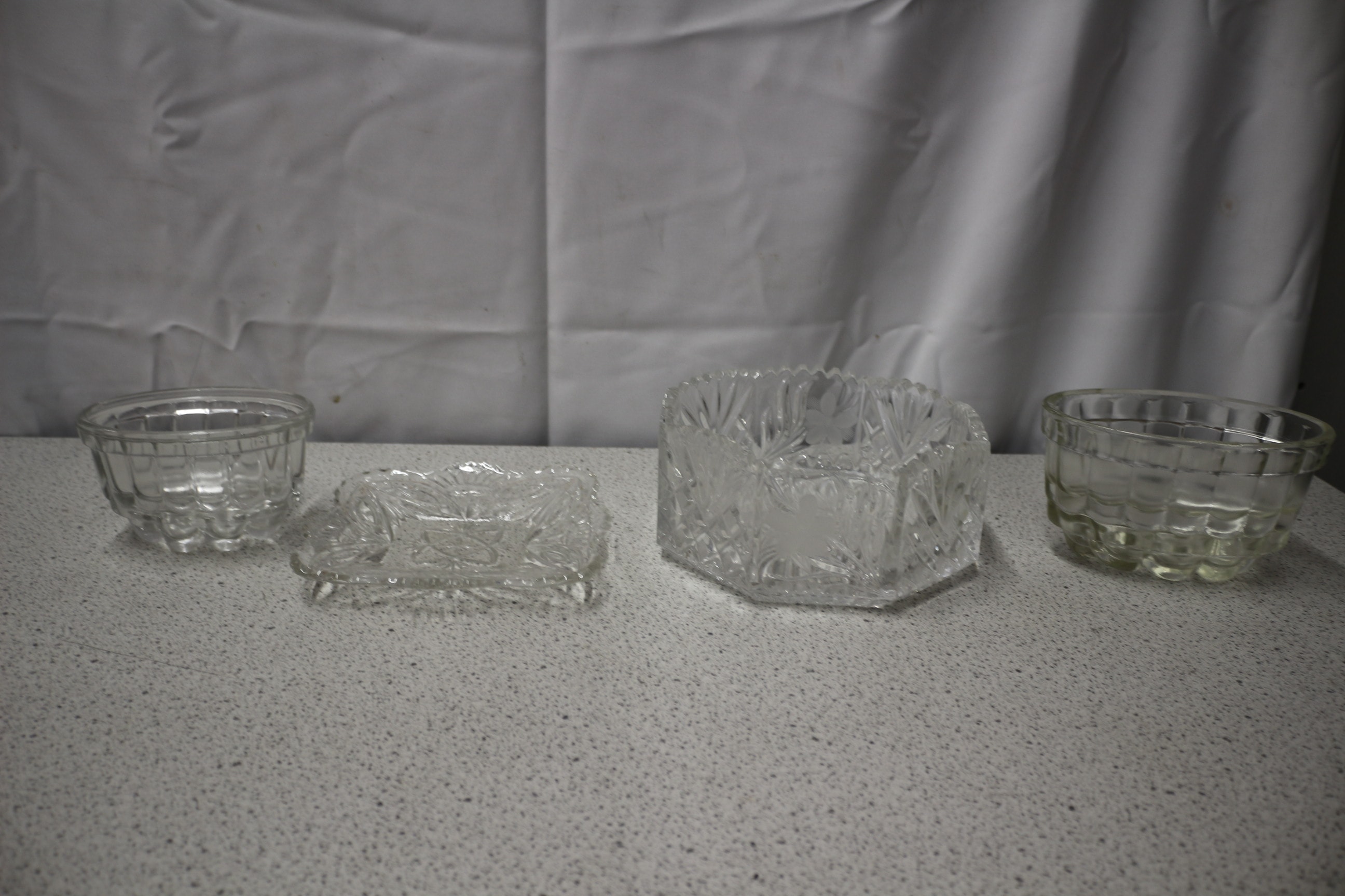 The lot consists of four clear glass serving items: one small round ribbed bowl, one square cut-glass dish, one large hexagonal cut-glass bowl with frosted floral designs, and one medium-sized oval ribbed bowl.