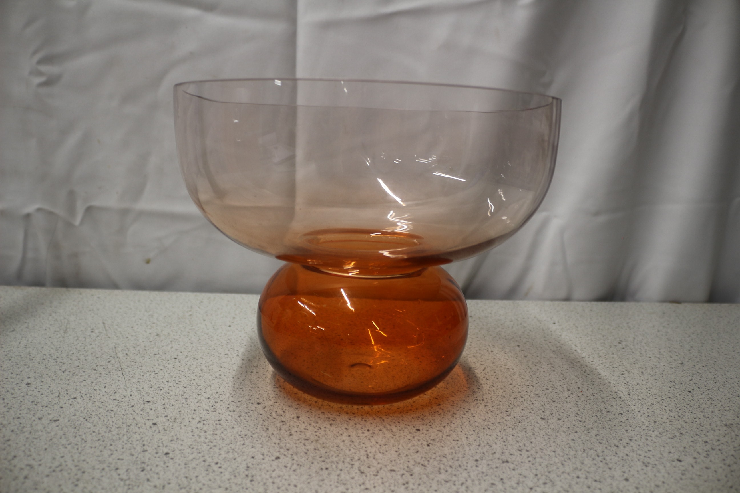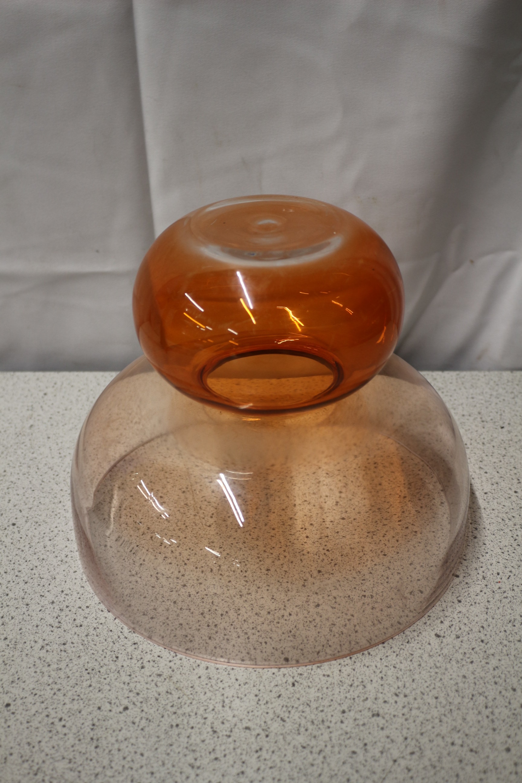 A glass bowl with a light pinkish-clear upper and an amber-orange spherical base.