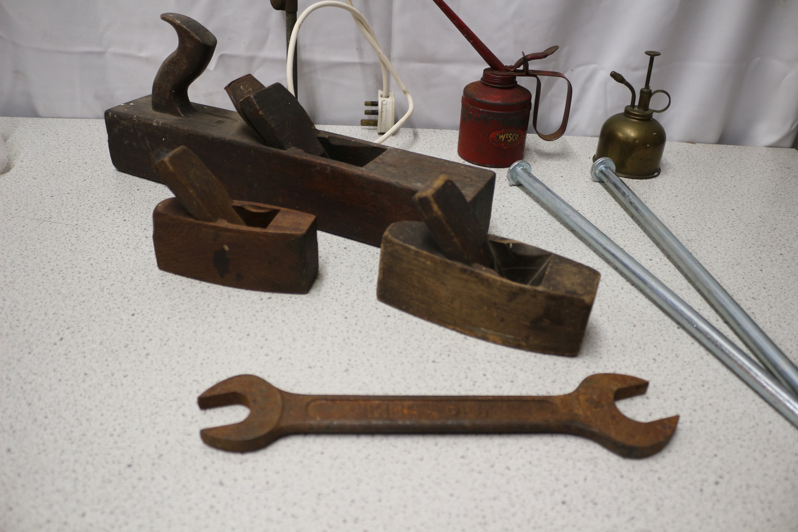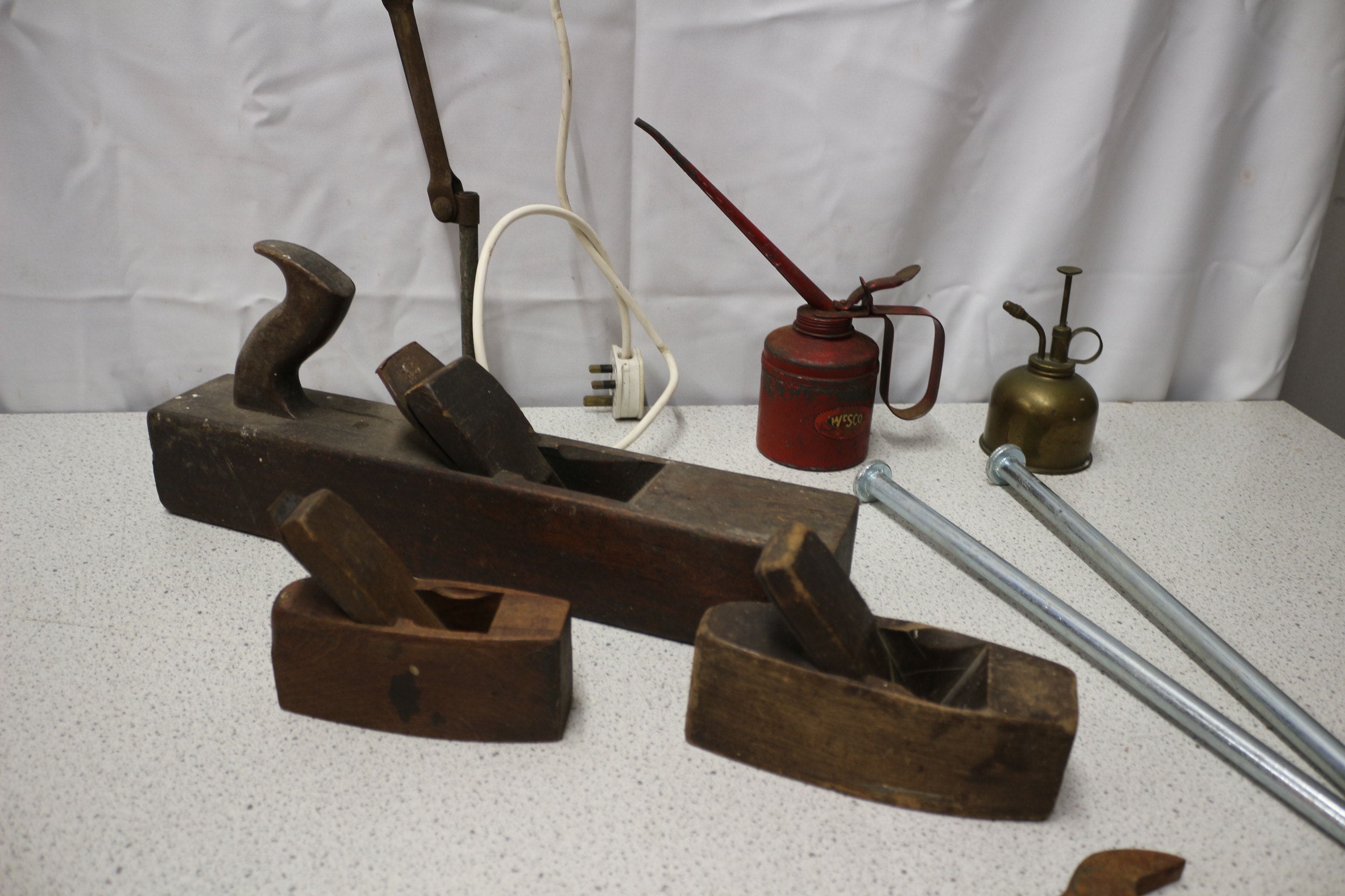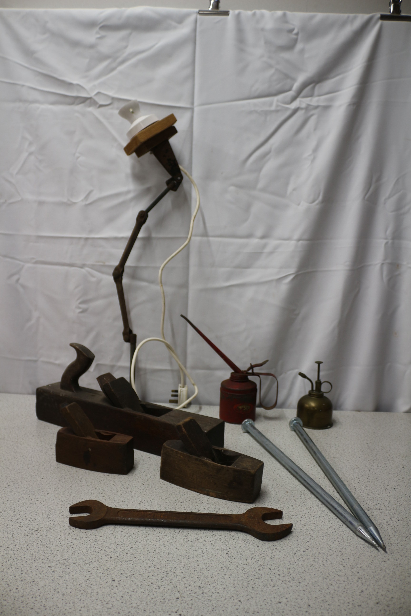 An articulated metal and wood desk lamp, three dark brown wooden hand planes, a red metal oil can labelled “WESCO”, a brass-coloured metal oil mister, one rusty metal open-ended Kingdick spanner, and two silver-coloured metal pegs.