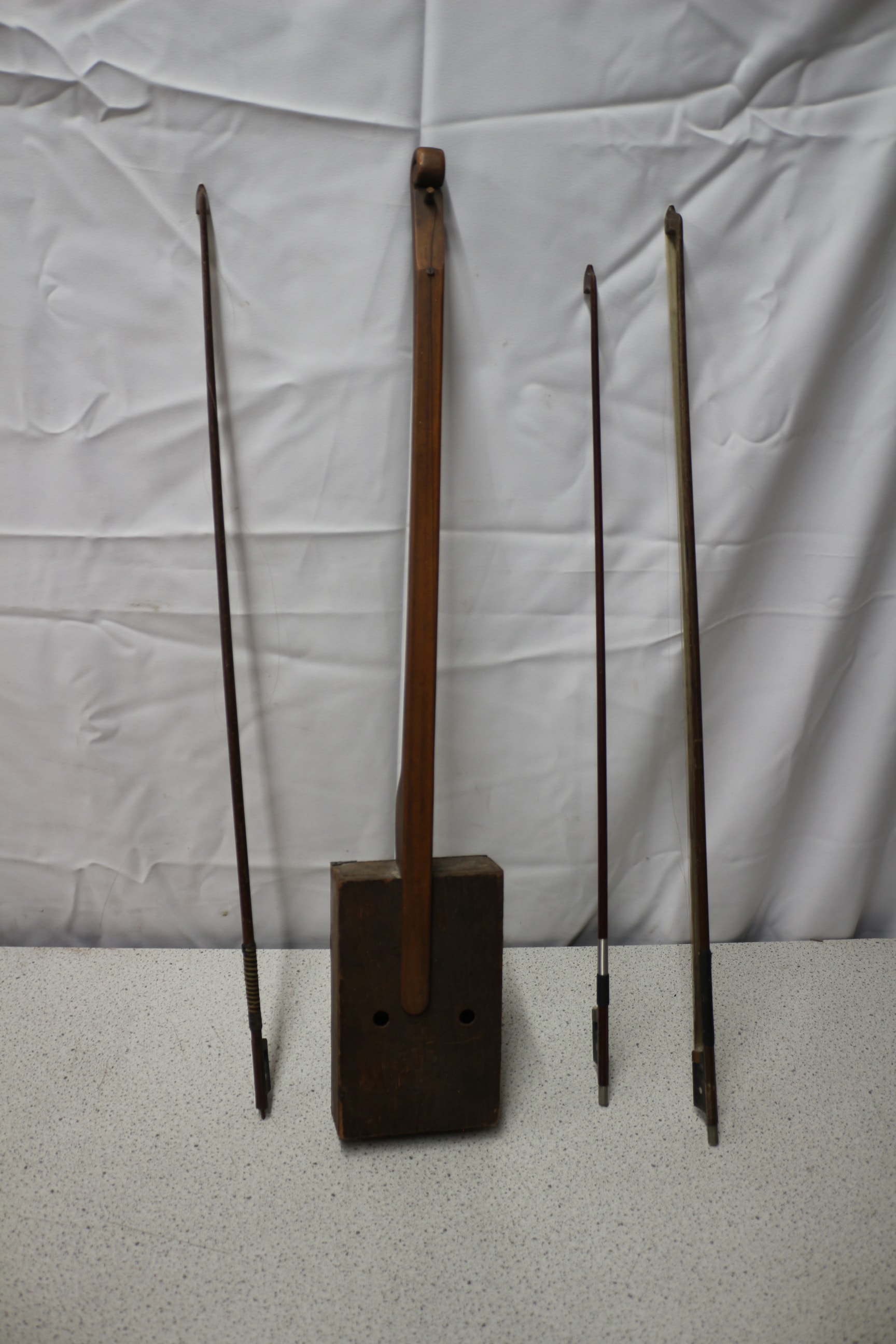 A brown wooden folk-style stringed instrument with a rectangular box body and three brown wooden bows. 74cm tall