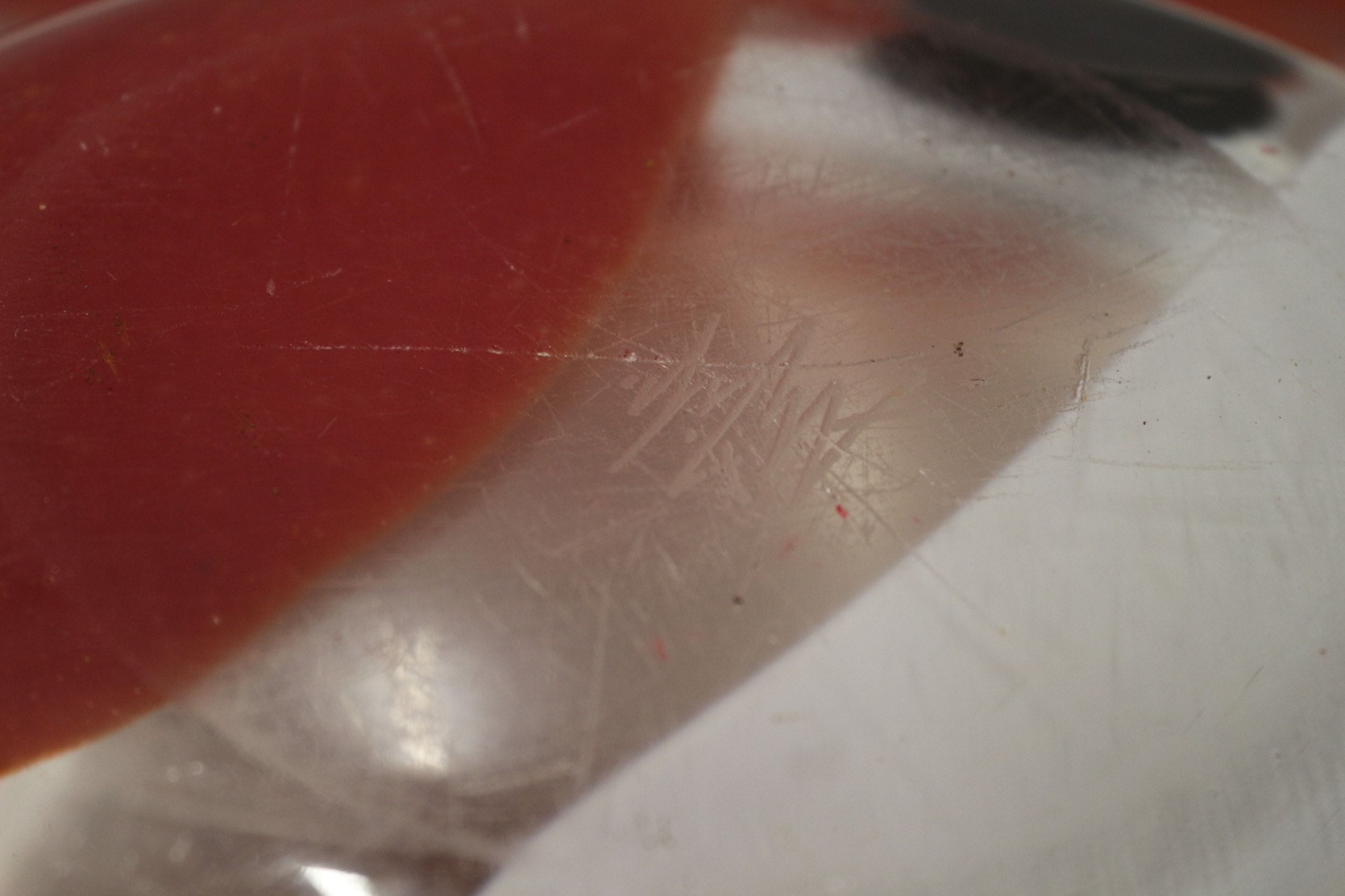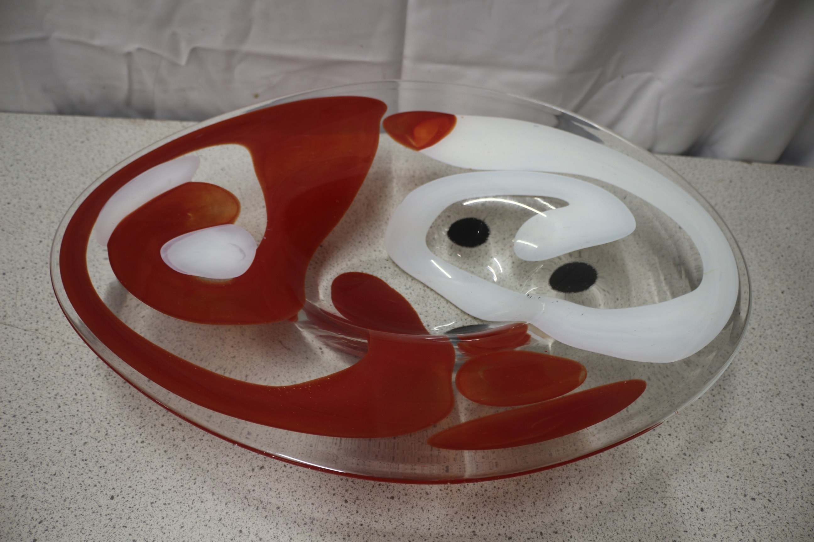 A large, clear glass decorative bowl/platter featuring swirling opaque red and white designs with two small black accents, including a faint, illegible etched signature or artist’s mark on its surface. 55cm wide