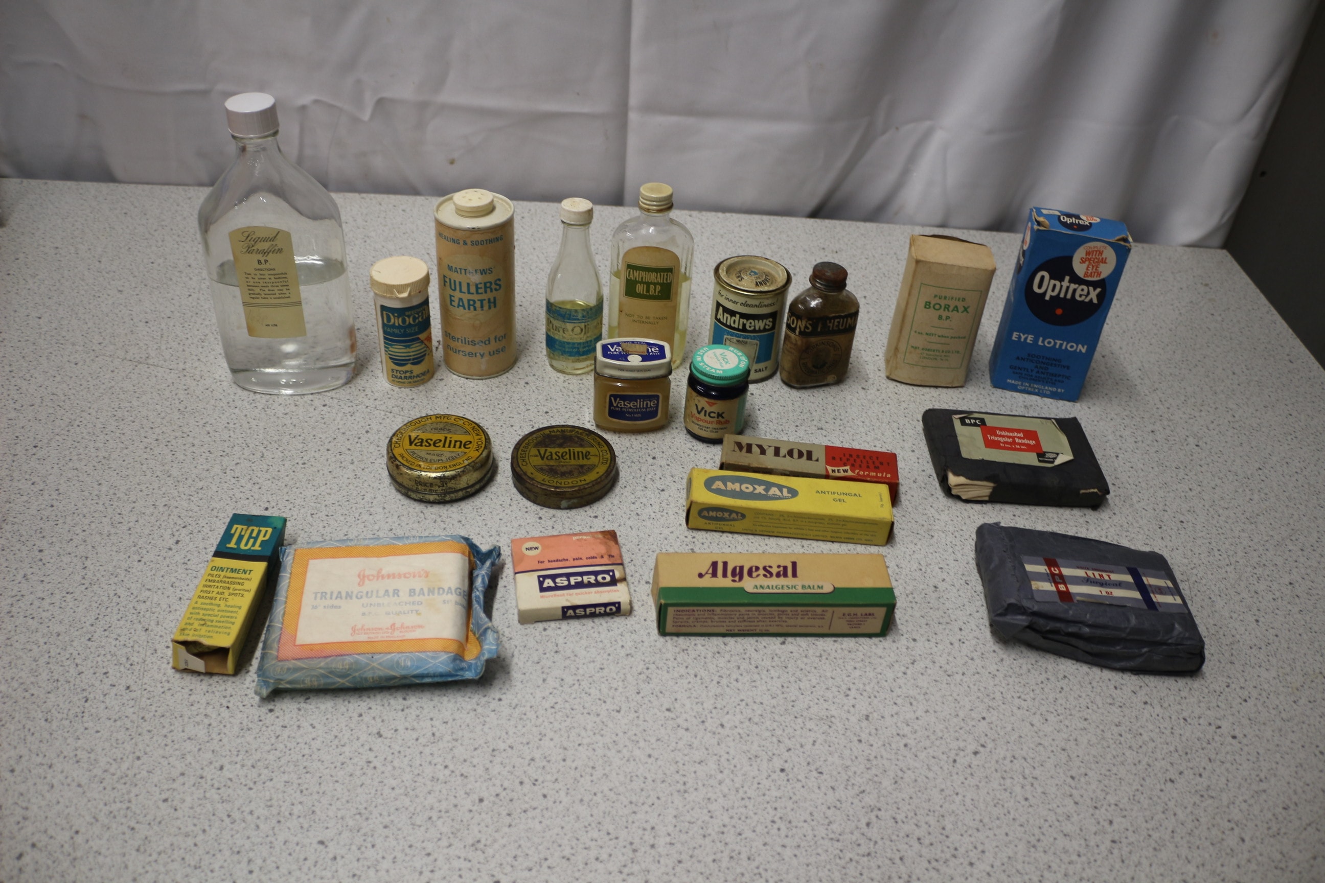 Selection of vintage chemist items including a blue and white box of Optrex EYE LOTION, stating ‘WITH SPECIAL EYE BATH’ and ‘SOOTHING ANTICONGESTIVE ANTISEPTIC’, made in England by Optrex Ltd. Vaseline tin and more