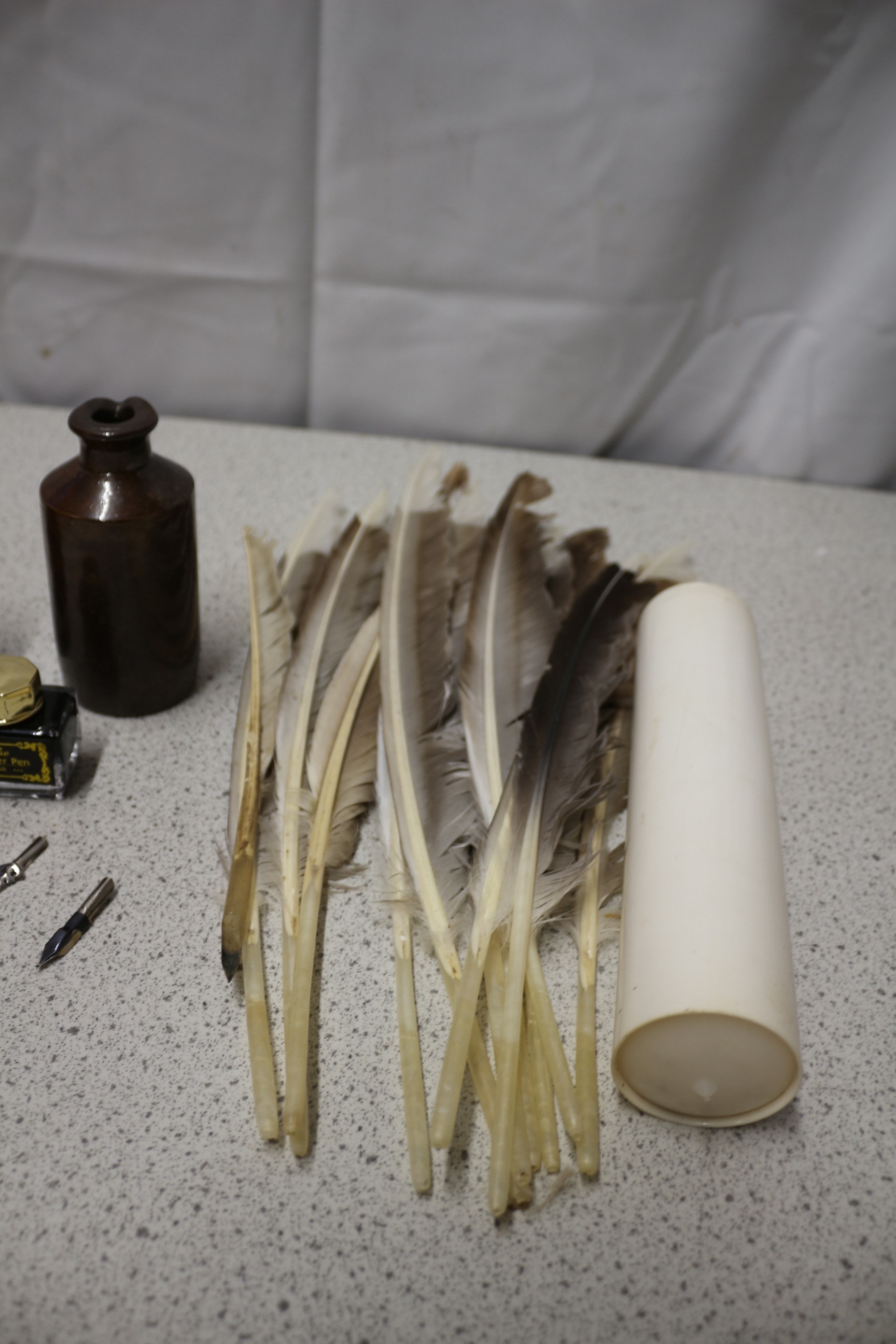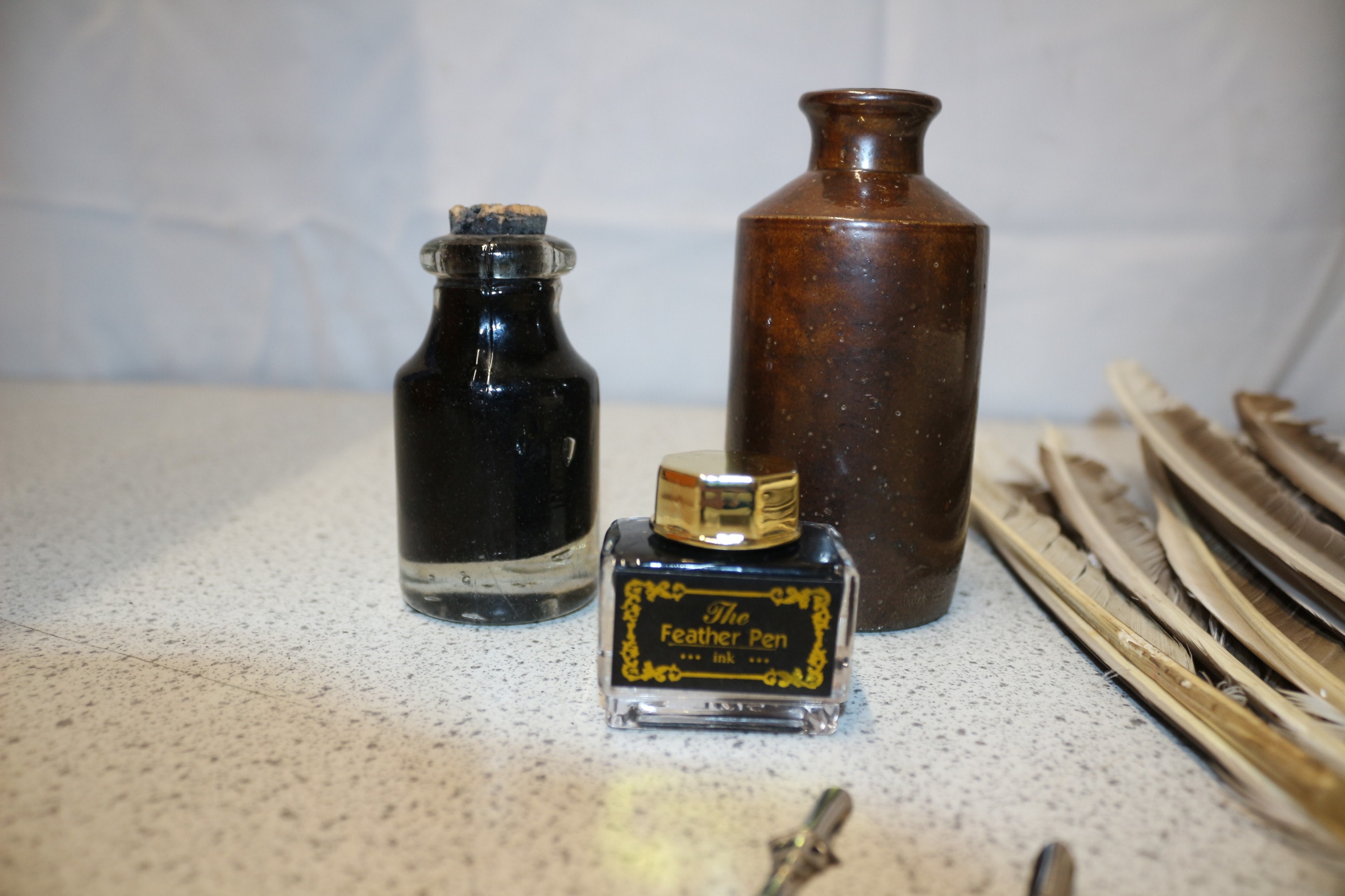 Three ink bottles (one clear glass with cork, one brown ceramic, and one small clear glass with a gold cap labelled “The Feather Pen Ink “), two metal pen nibs, and a collection of quills with a white cylindrical container.