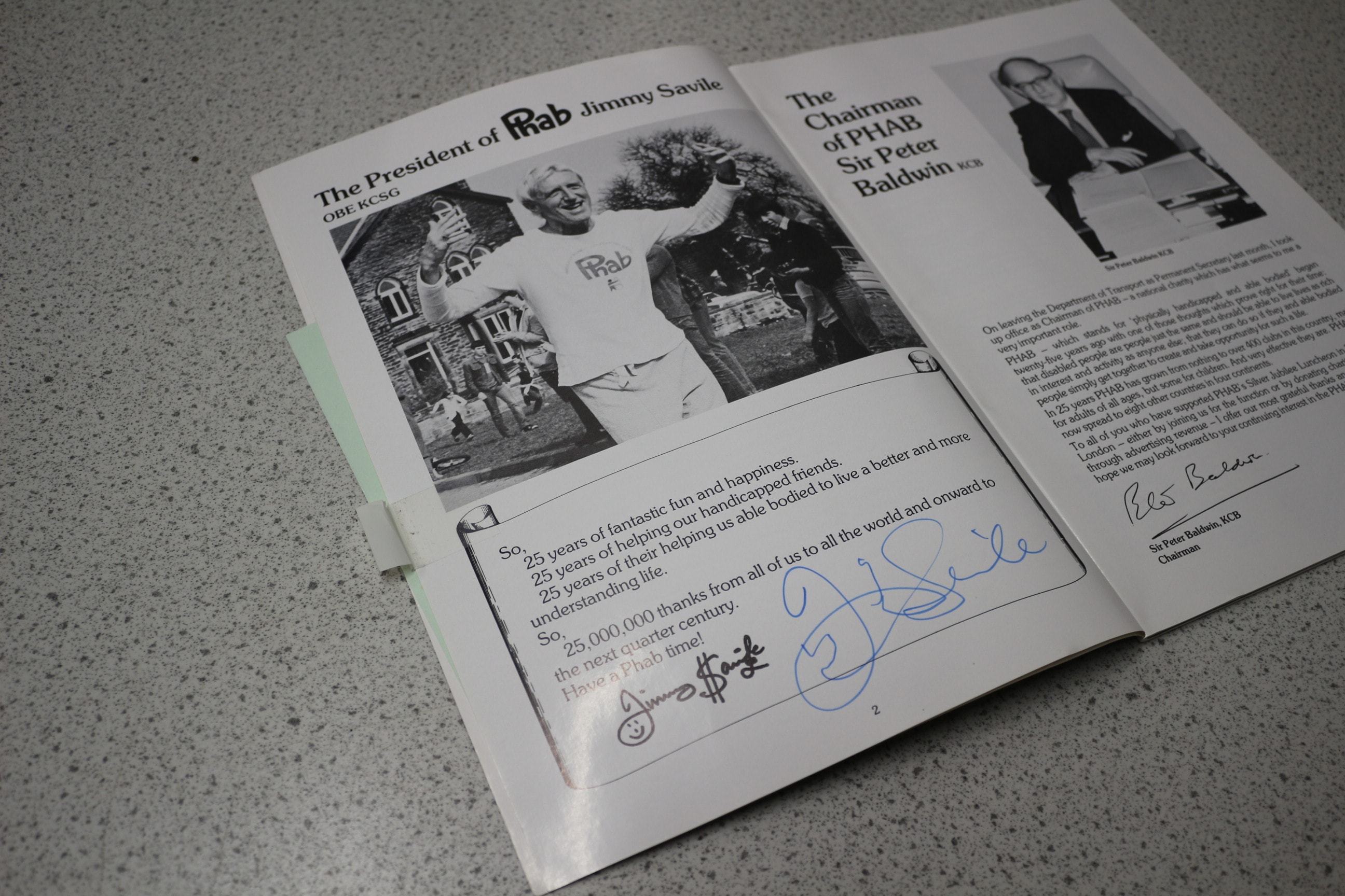 A multi-coloured vinyl record album, “CLIFF RICHARD • THE YOUNG ONES, ” by CLIFF RICHARD and THE SHADOWS, marked “mono” and “COLUMBIA, ” alongside one grey and black-and-white programme for “CLIFF RICHARD in The City of London” signed by “Cliff Richard” on the cover and “J Savile” on an internal page.