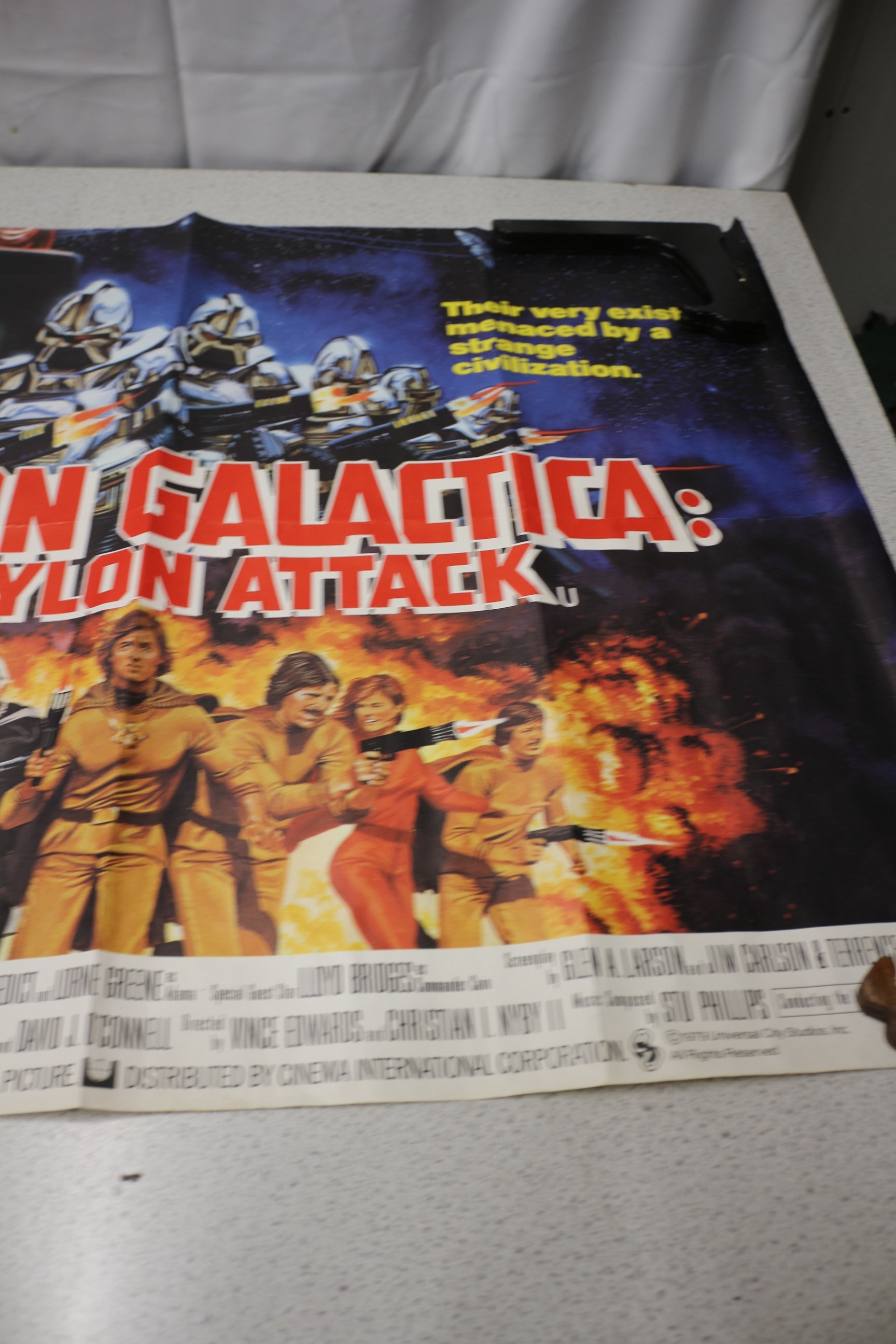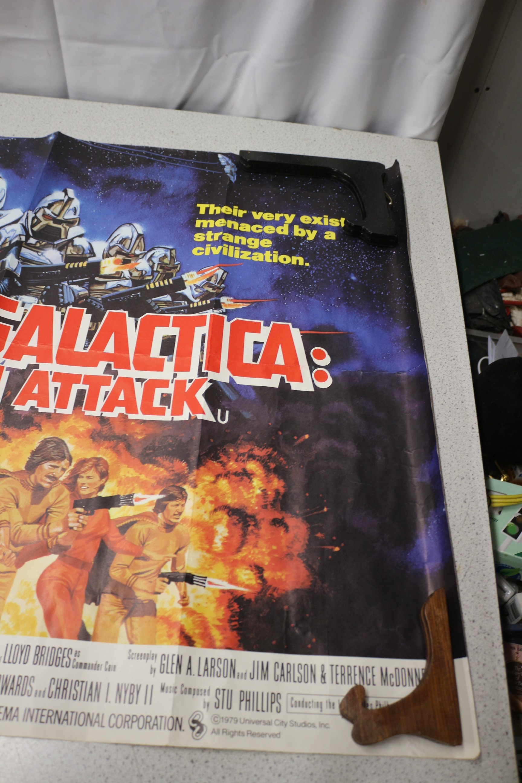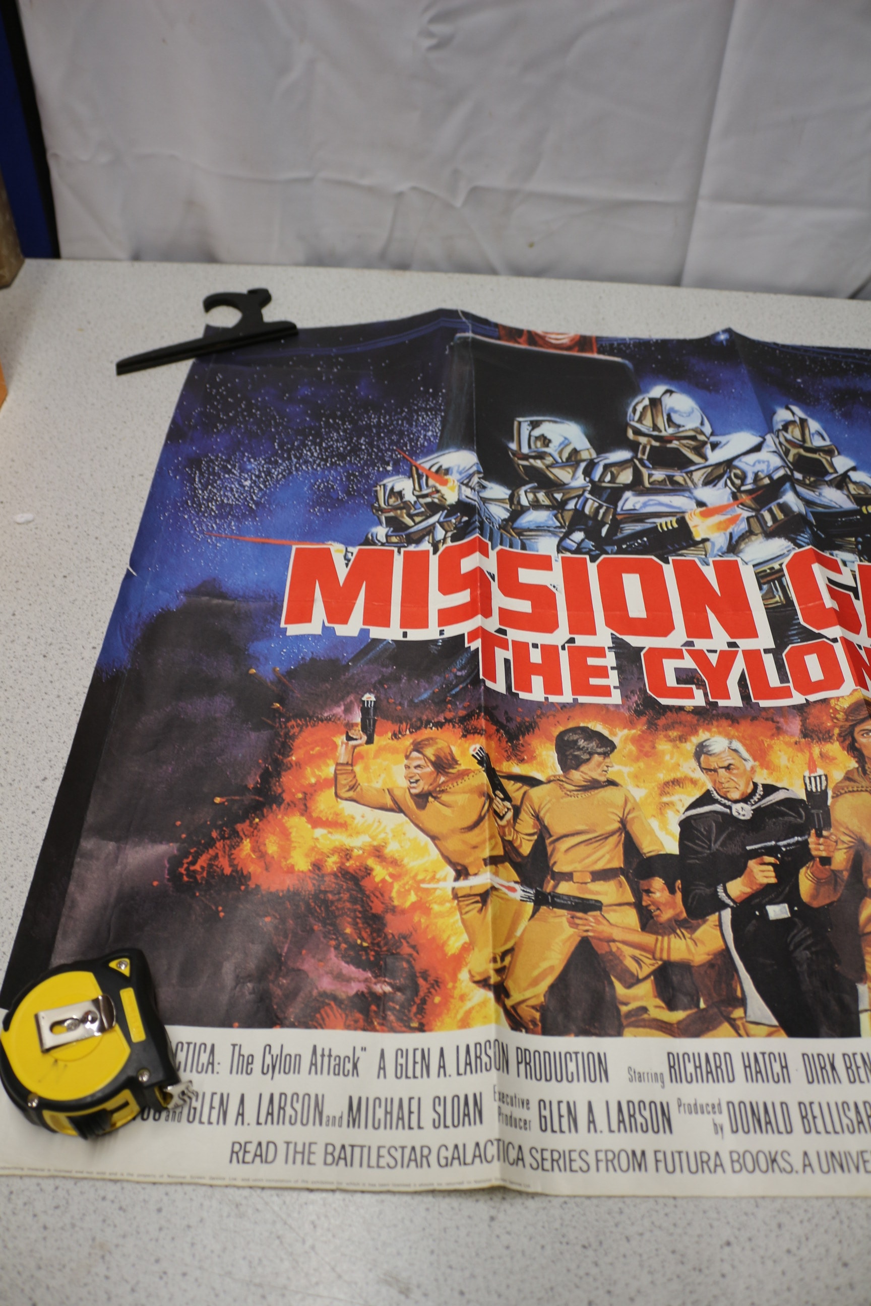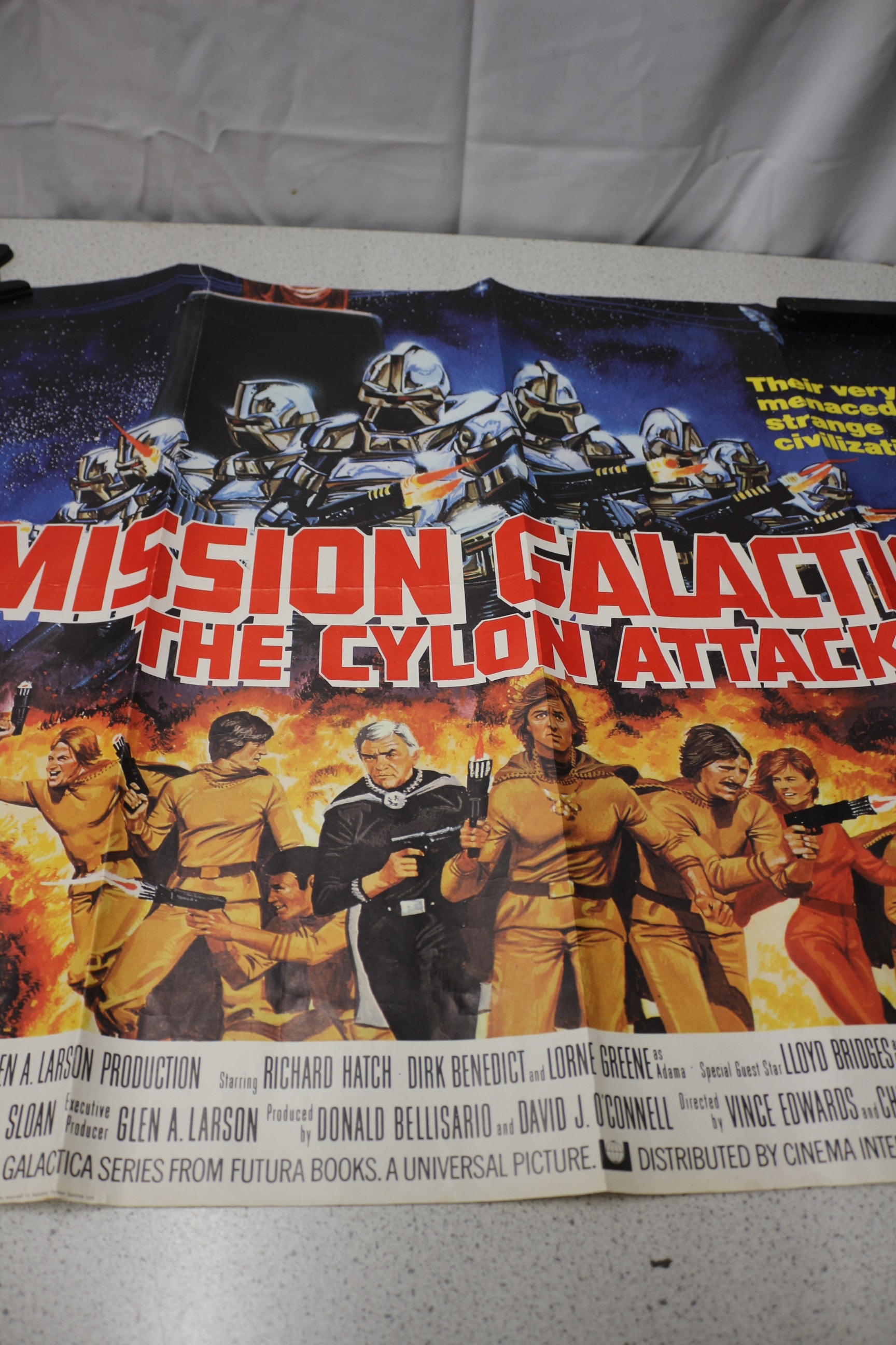 A multi-coloured movie poster for ‘MISSION GALACTICA: THE CYLON ATTACK, ‘ featuring Richard Hatch, Dirk Benedict, and Lorne Greene, copyrighted ©1979 Universal City Studios, Inc.