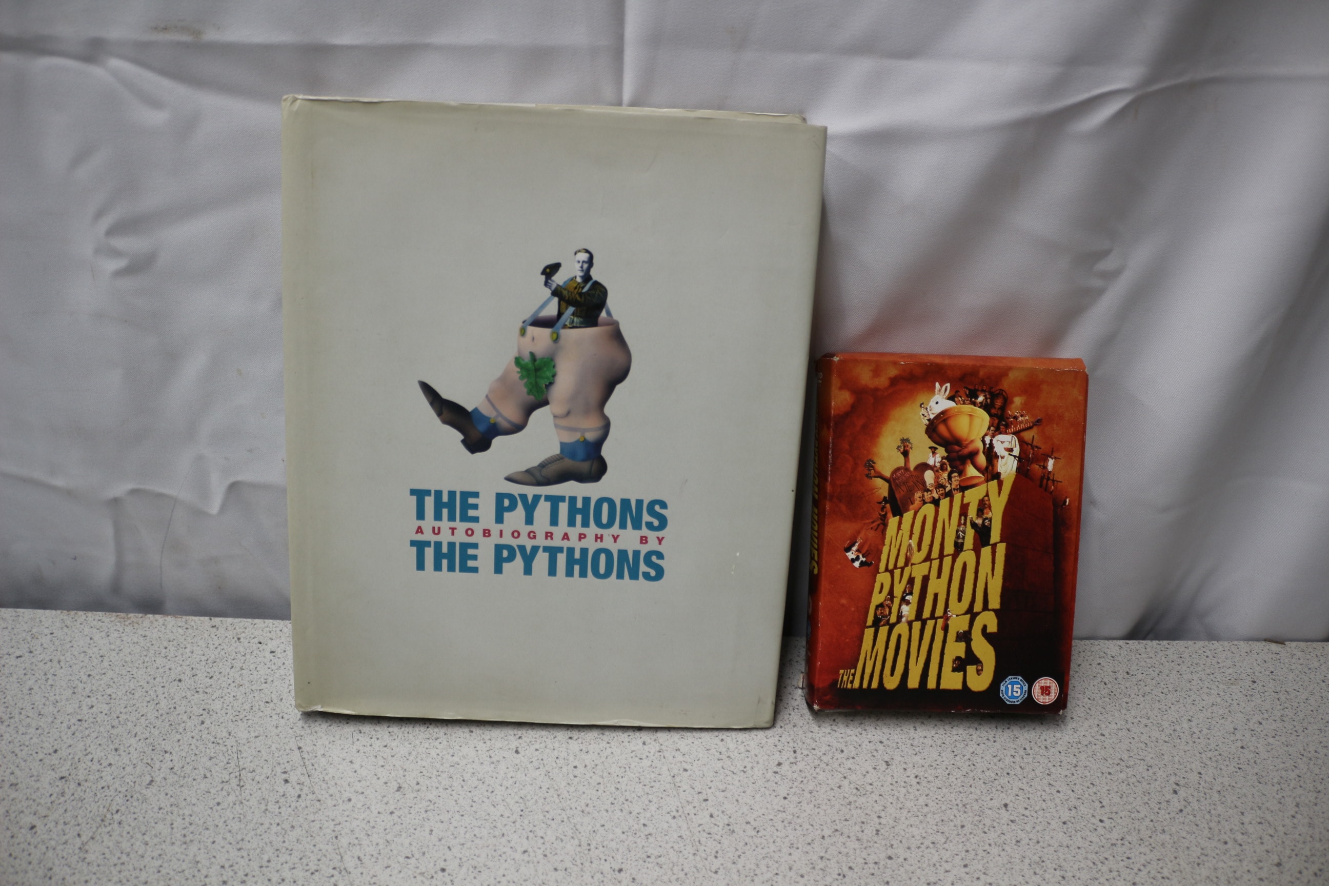 A large, light grey hardcover book titled “THE PYTHONS AUTOBIOGRAPHY BY THE PYTHONS” featuring Eric Idle and Graham Chapman, accompanied by a smaller reddish-orange DVD box set titled “THE MONTY PYTHON MOVIES” with a “15” age rating.