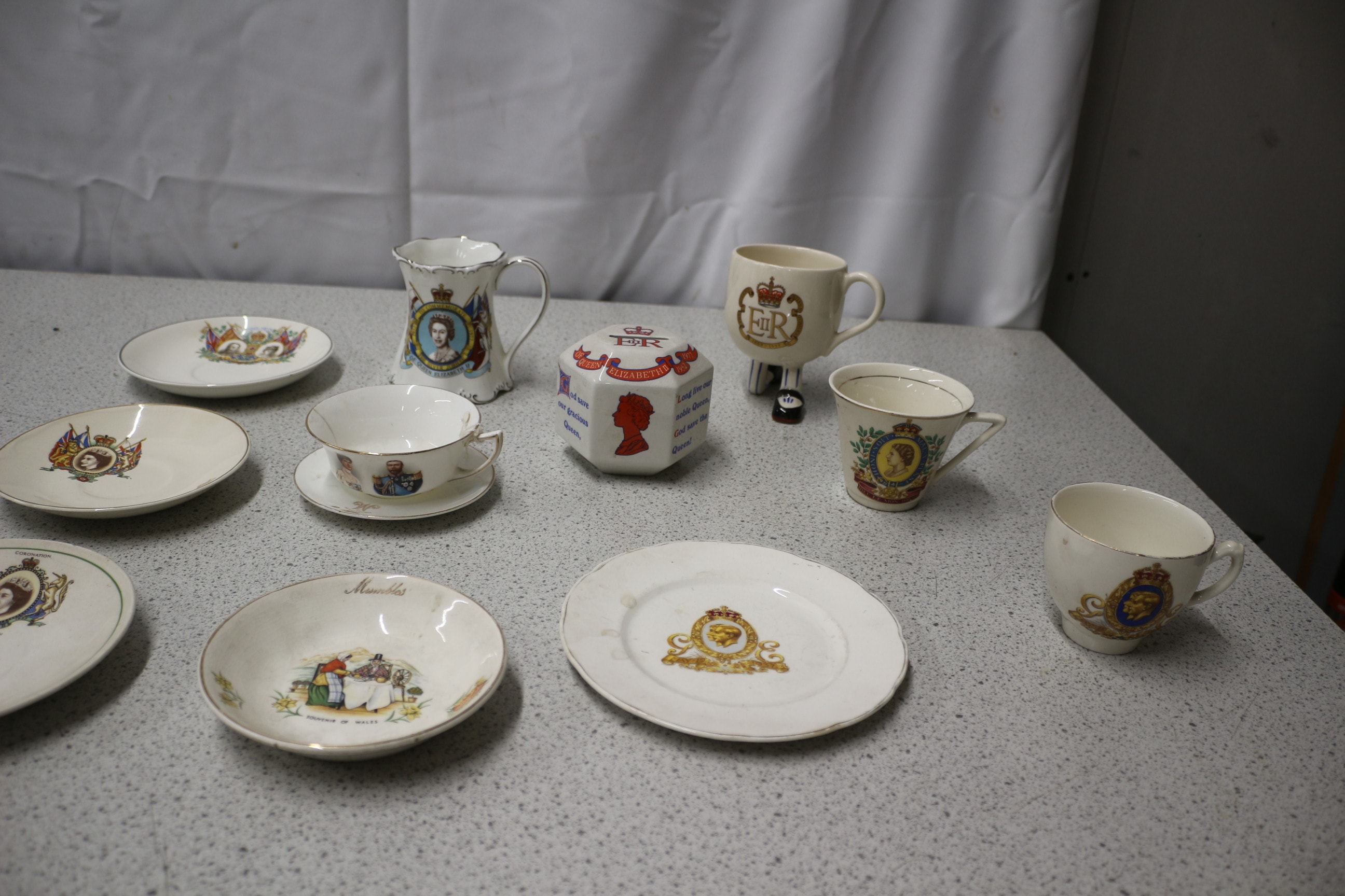 Eleven pieces of white and cream commemorative ceramic tableware, including various plates, mugs, a pitcher, a teacup with saucer, and an octagonal lidded box, decorated with royal portraits and crests, and displaying inscriptions such as “TO COMMEMORATE THE SILVER JUBILEE OF QUEEN ELIZABETH II 1952-1977”, “QUEEN ELIZABETH II”, and “Mumbles”.