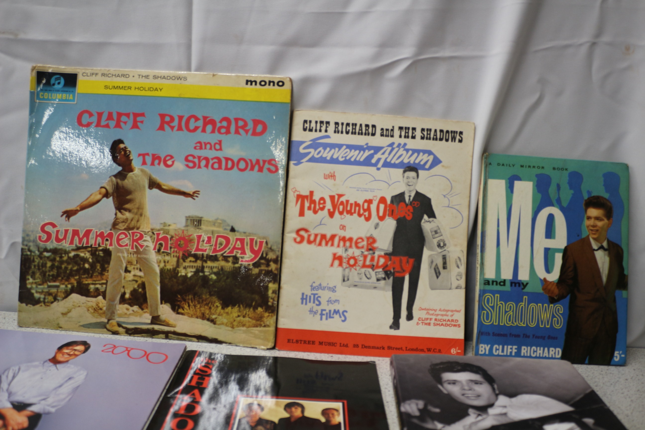 A collection of records and music-related books, including “SUMMER HOLIDAY” by Cliff Richard and The Shadows, featuring the “COLUMBIA” brand and “mono” label.