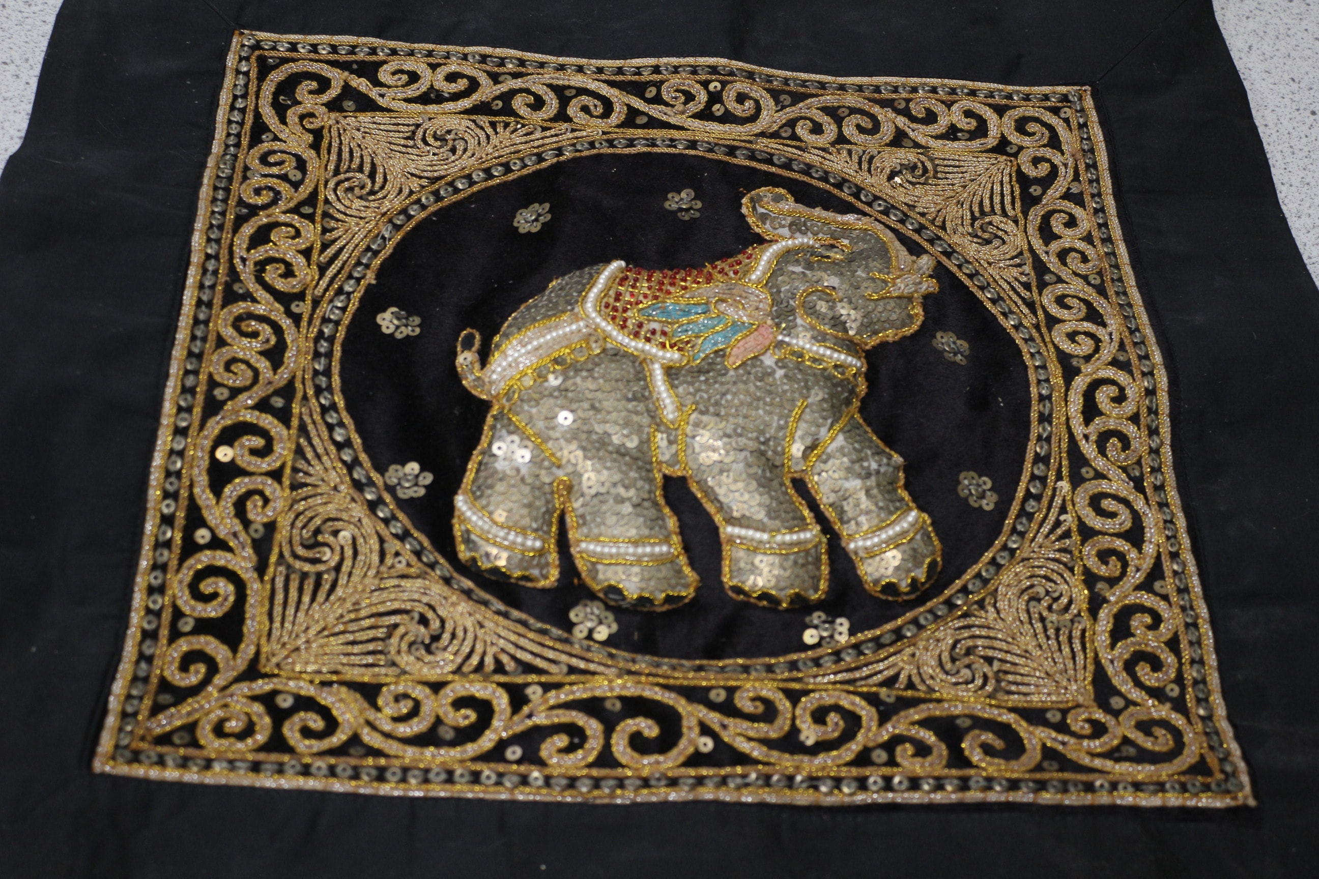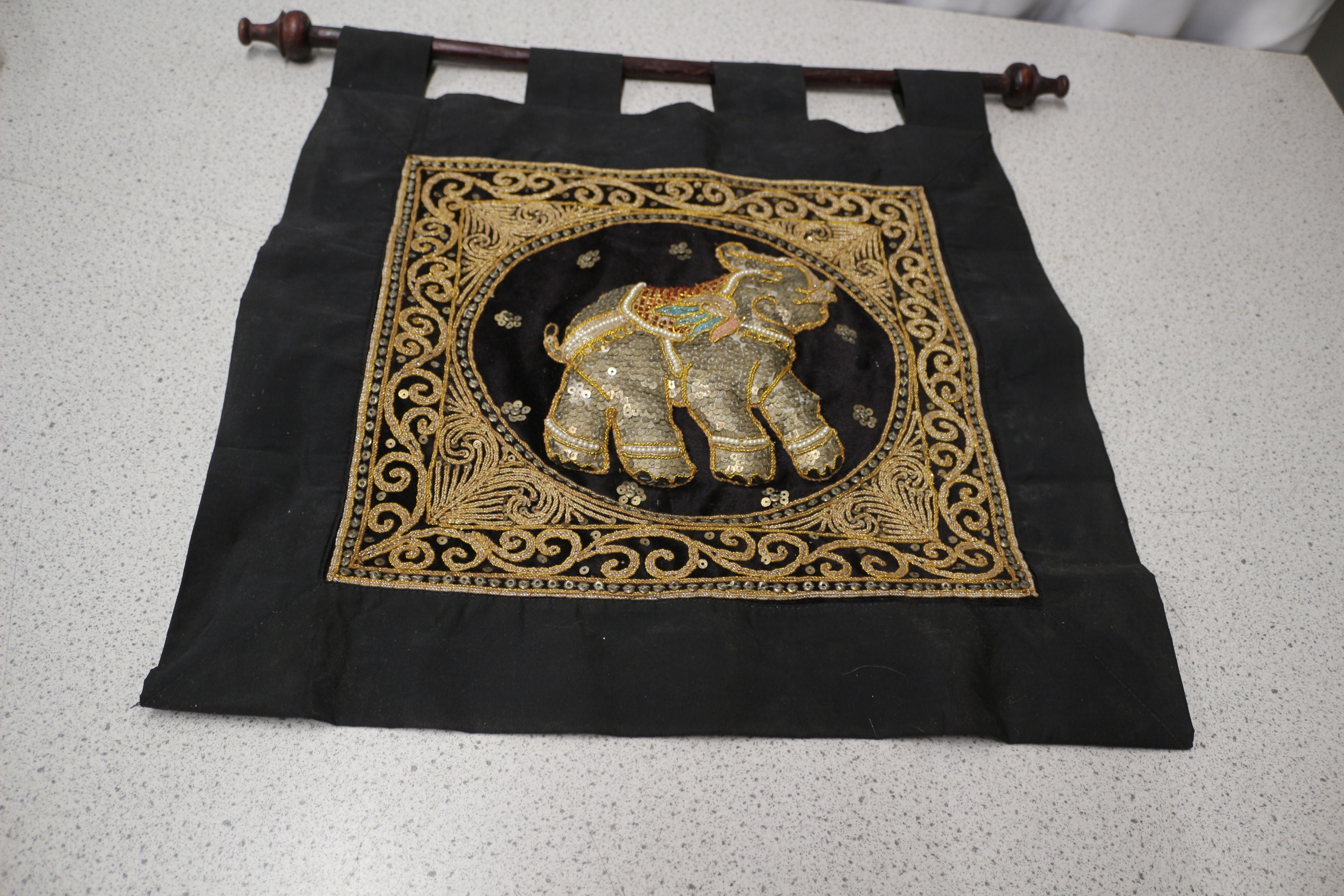 A black textile banner/tapestry featuring a gold and silver sequined and embroidered elephant design with multicoloured accents, hanging from a dark wooden rod. Rod 58cm Long, Drop 51cm