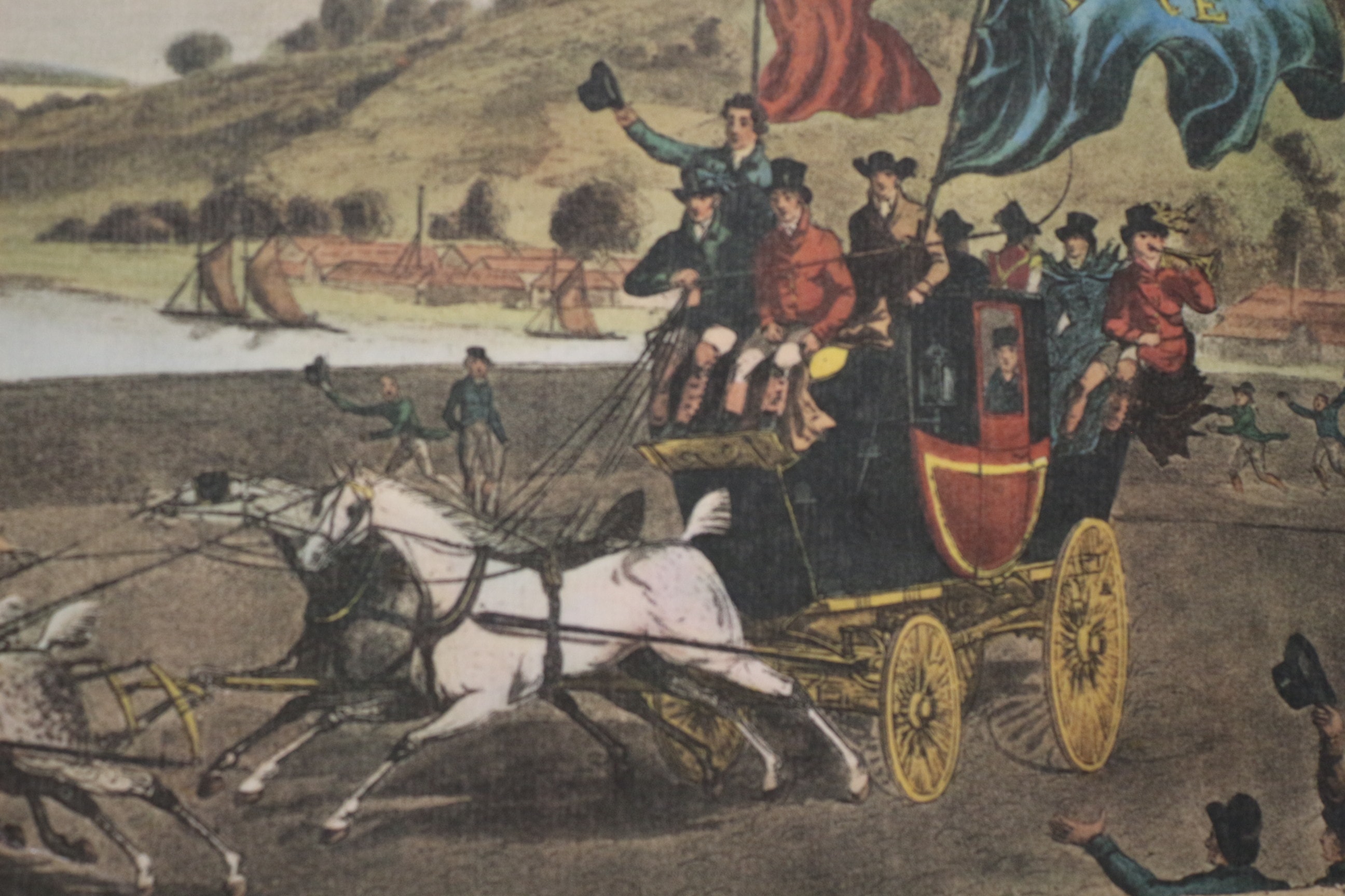A multi-coloured antique print titled ‘THE ‘PEACE COACH’ CONVEYING NEWS OF THE VICTORY OF WATERLOO. CROSSING ROCHESTER BRIDGE.’, published in 1815 by R. Pollard, Holloway, near London. 50x41cm