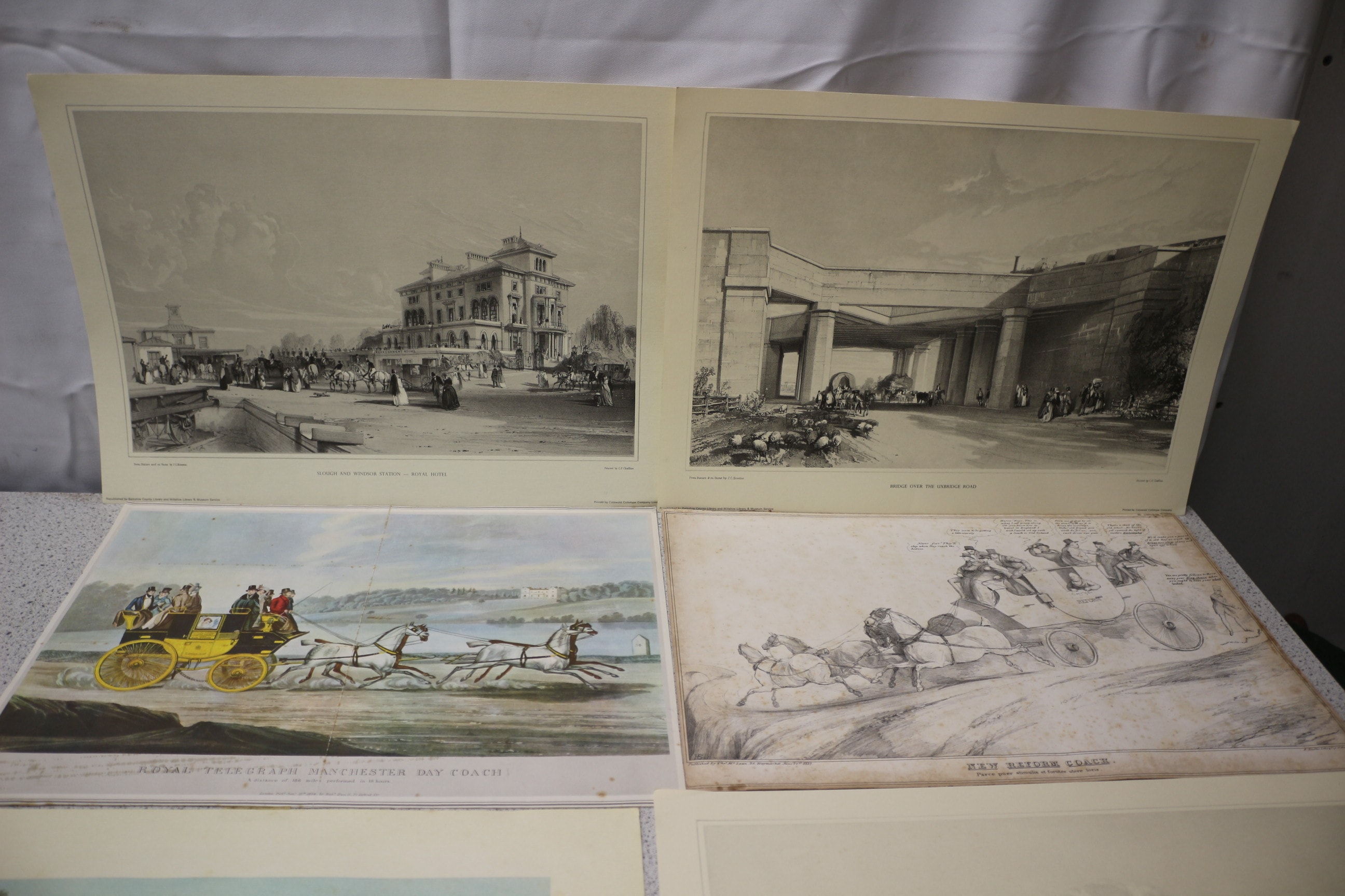 Ten historical prints and maps, predominantly monochrome with two coloured examples, depicting landscapes, architectural views, coaching scenes, and regional maps, with visible titles including ‘ROYAL TELEGRAPH MANCHESTER DAY COACH’, ‘HYDE PARK NEAR GROSVENOR GATE’, ‘Parish Church of St Michael’s, King’s-Brooks’, and ‘THE NORTH WEST VIEW OF WALMER CASTLE, IN THE COUNTY OF KENT.’