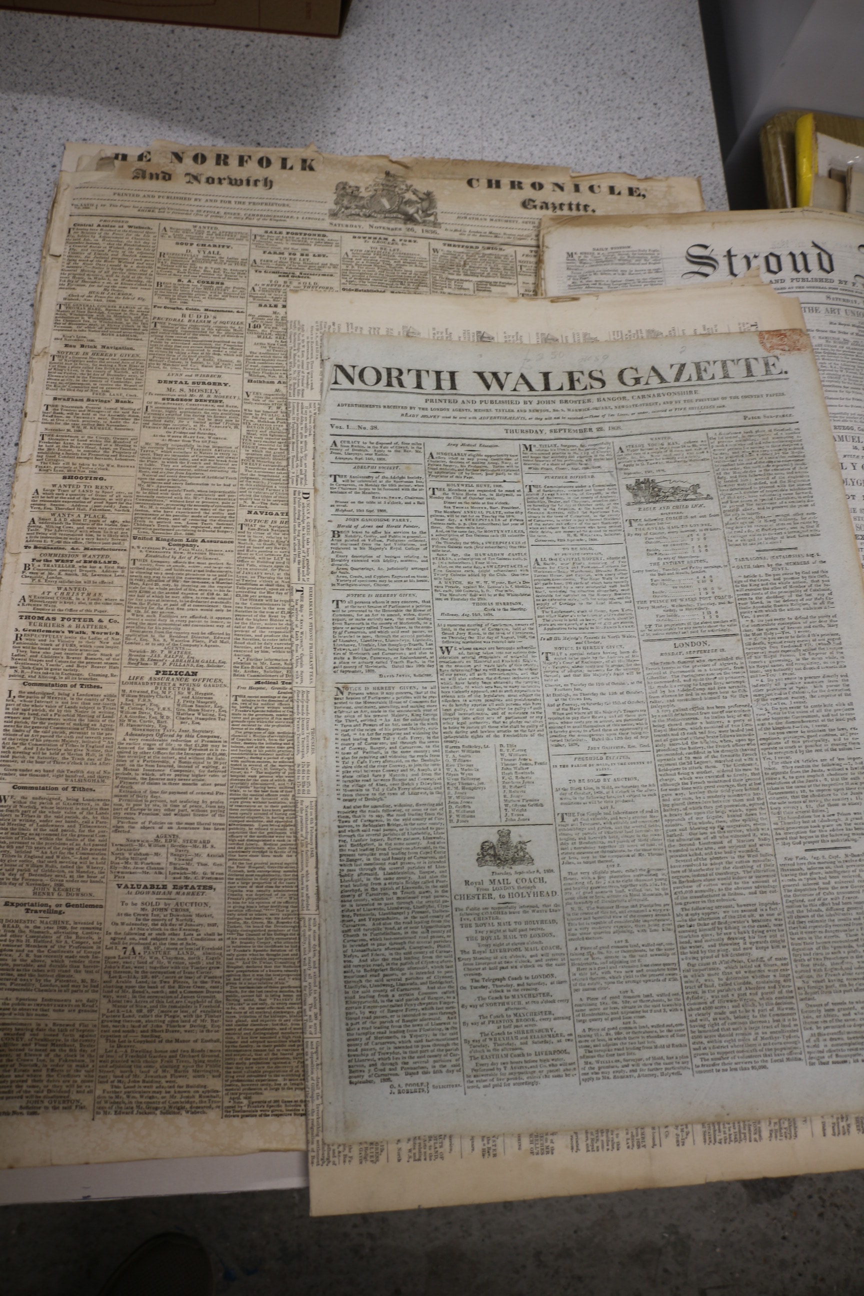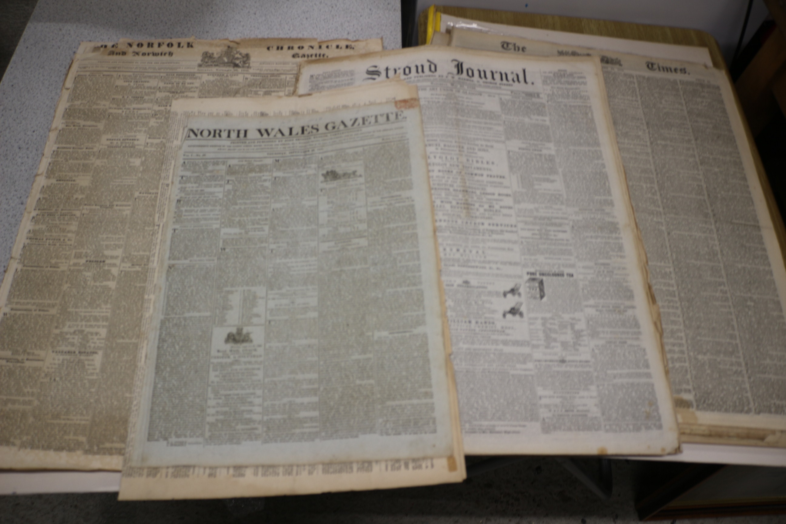Several cream-coloured antique newspapers with black text, prominently displaying titles such as “THE NORFOLK AND Norwich CHRONICLE, Gazette.”, “NORTH WALES GAZETTE” (Vol. 1. No. 20.), “Stroud Journal.”, and “The Times.”.