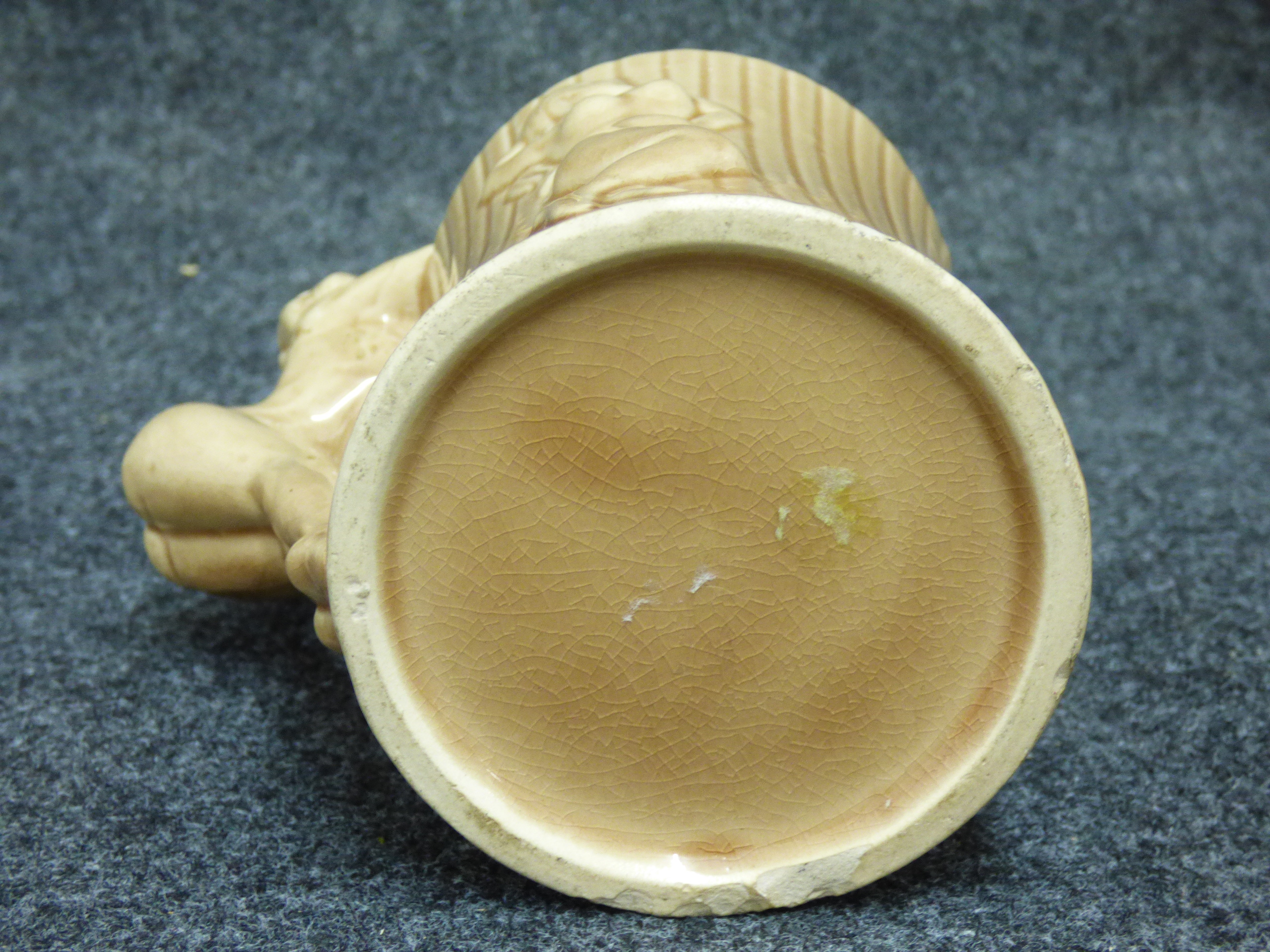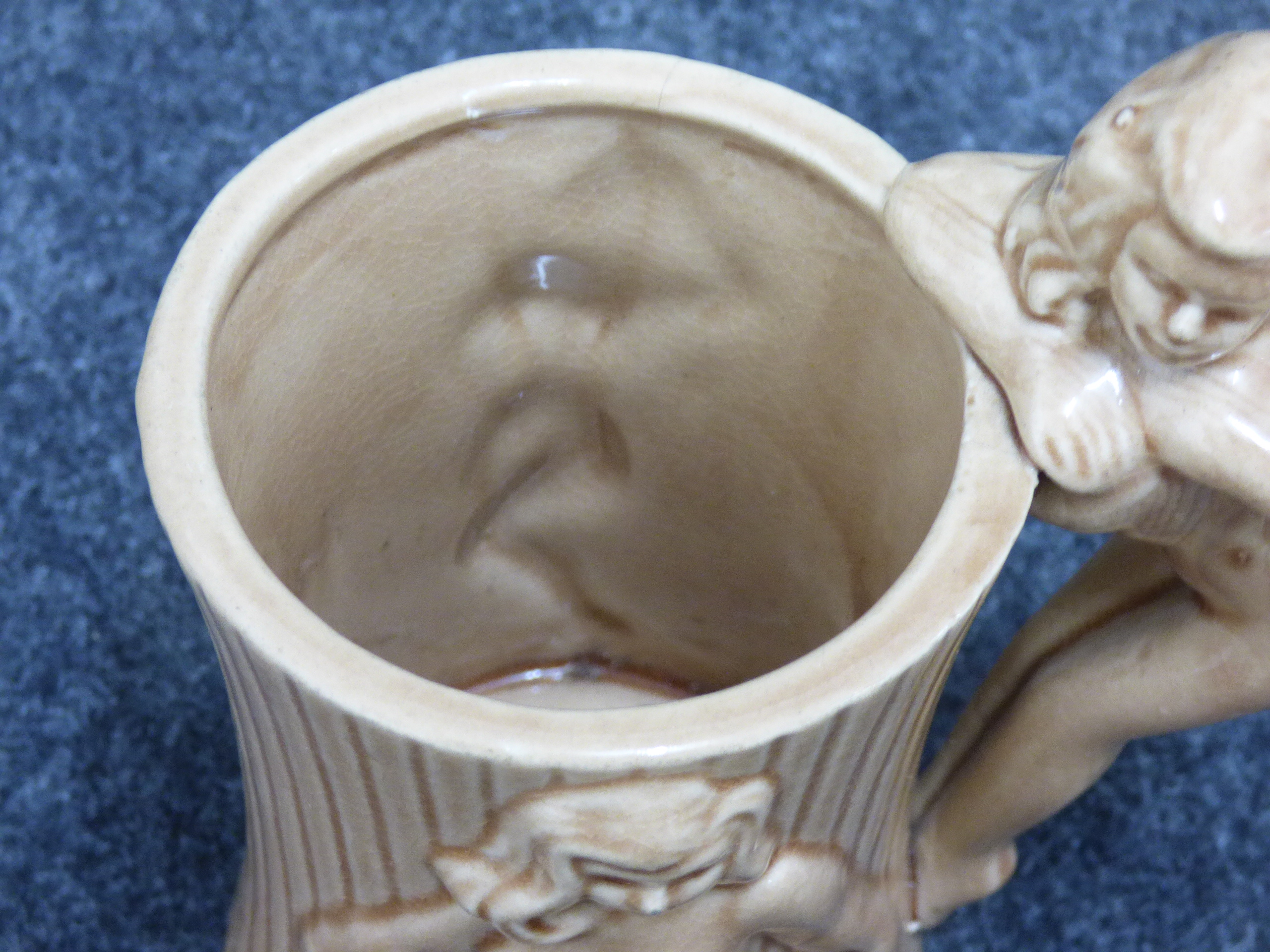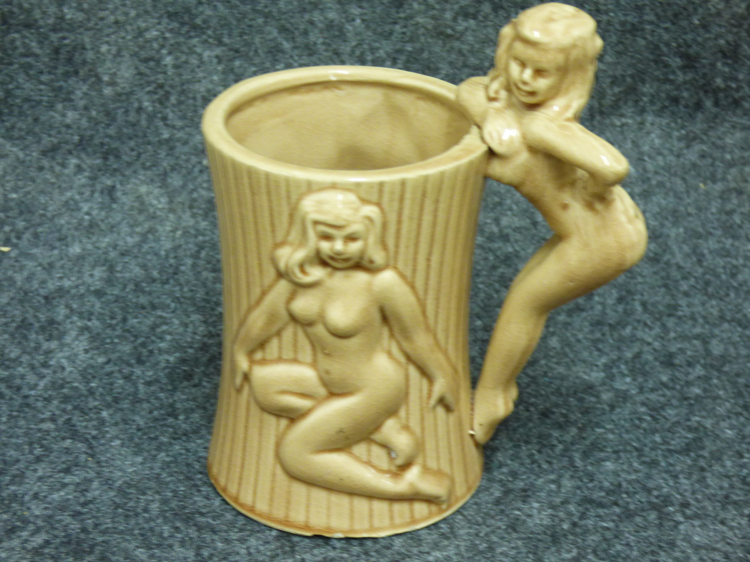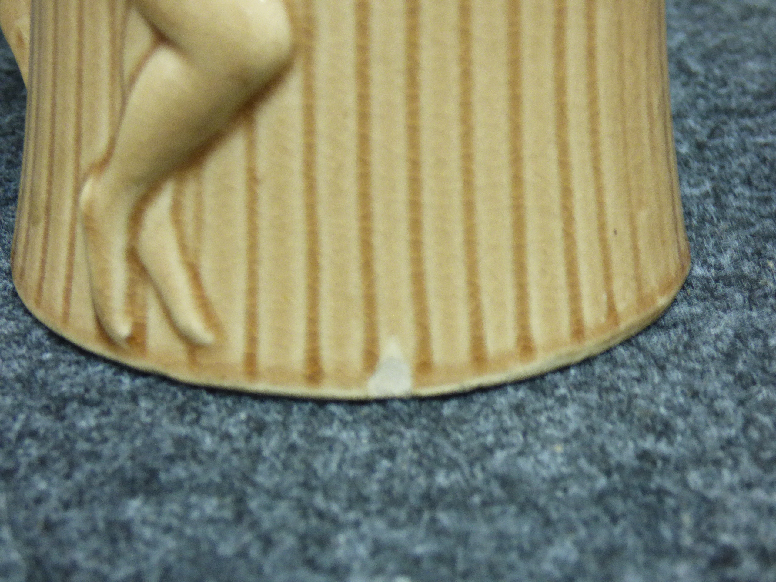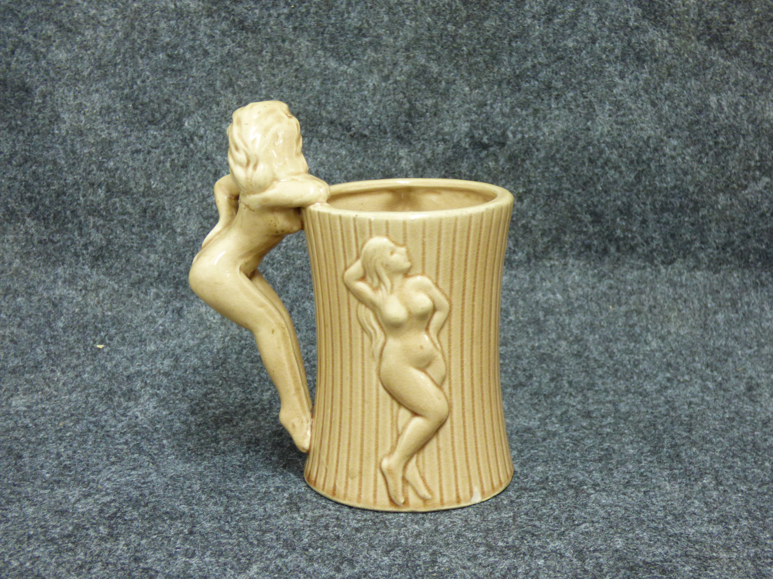 A beige ceramic mug featuring relief carvings of nude female figures on the body and a sculpted nude figure forming the handle.