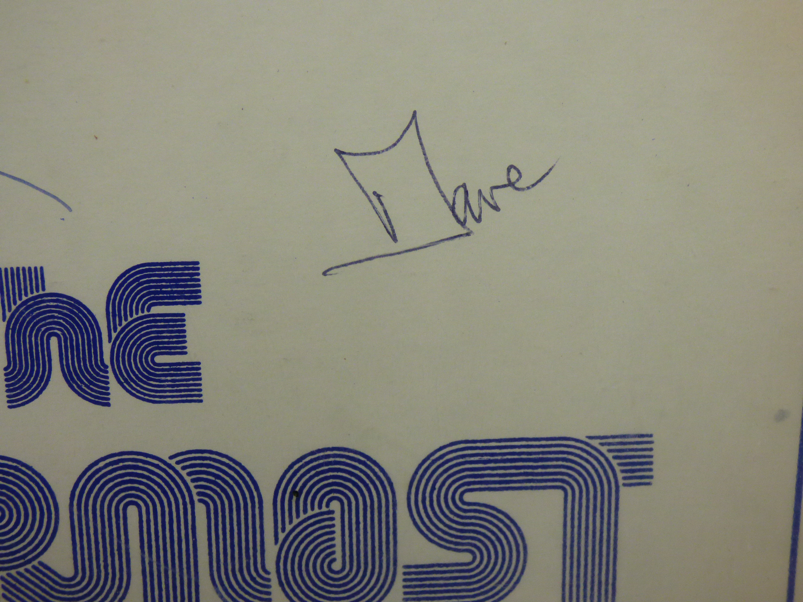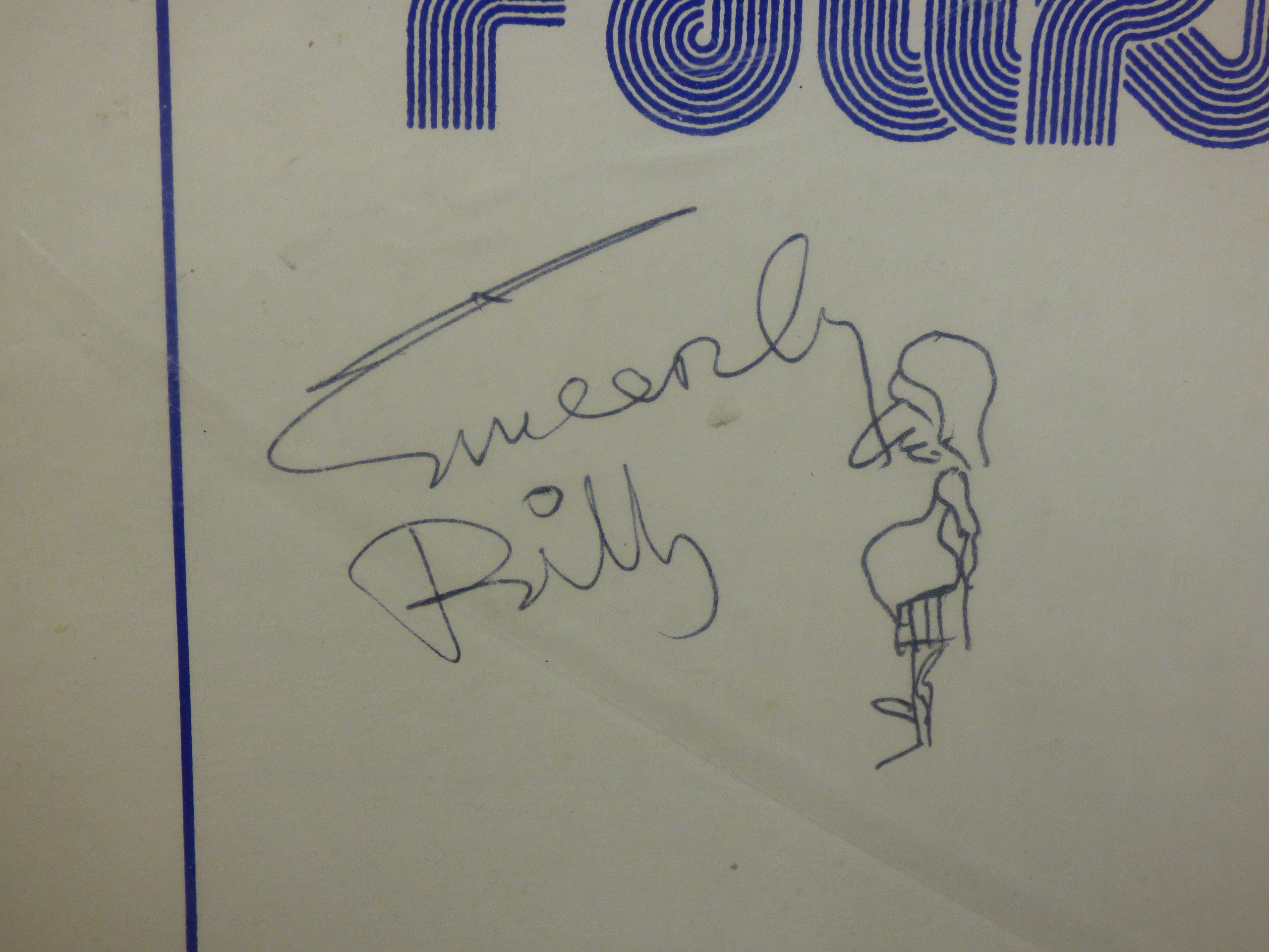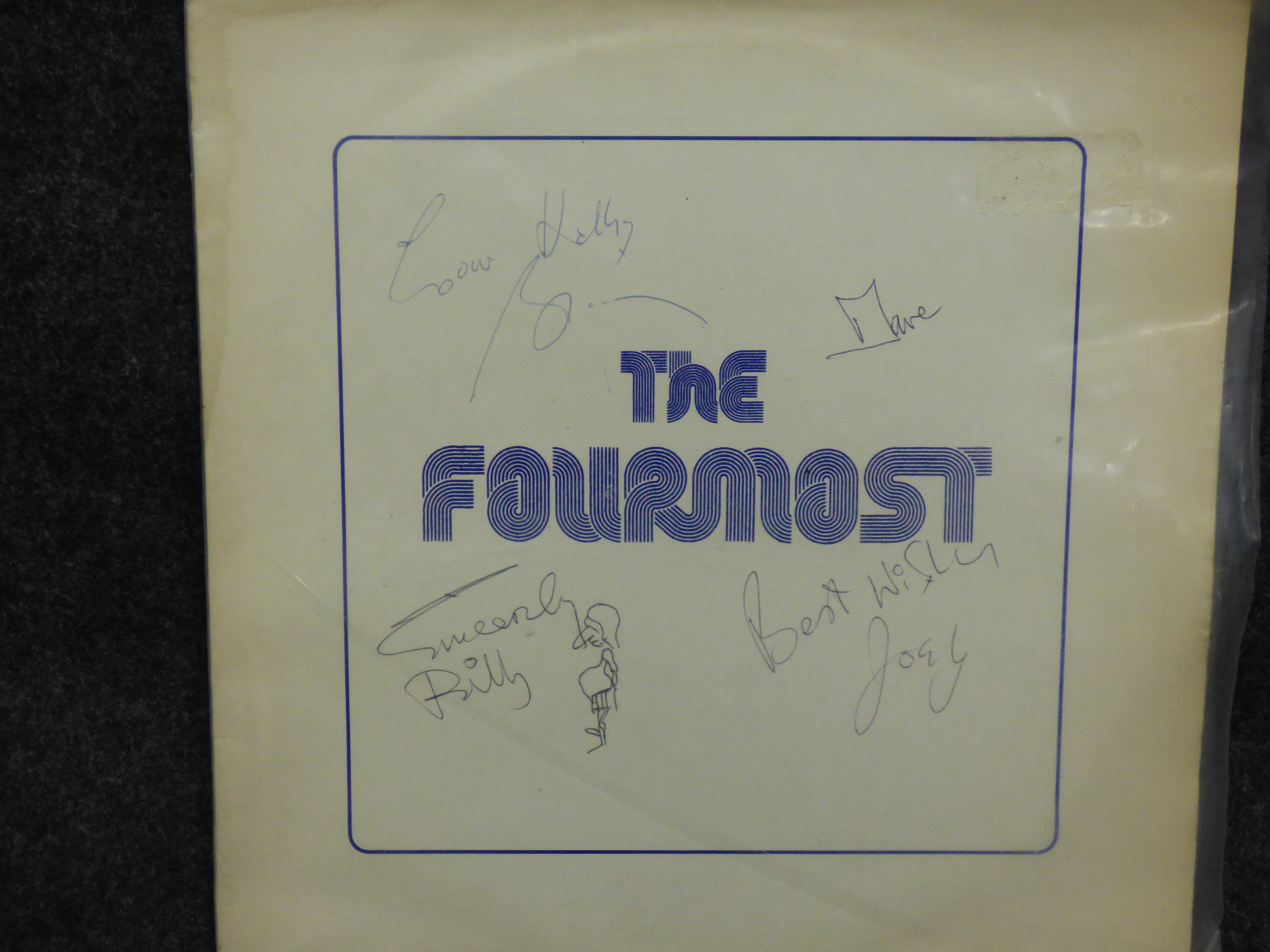 A 1975 vinyl record and sleeve for The Fourmost (Stereo SOF 001) in cream, black, and blue, featuring signatures on the front cover from Brian, Dave, Joey, and Billy.