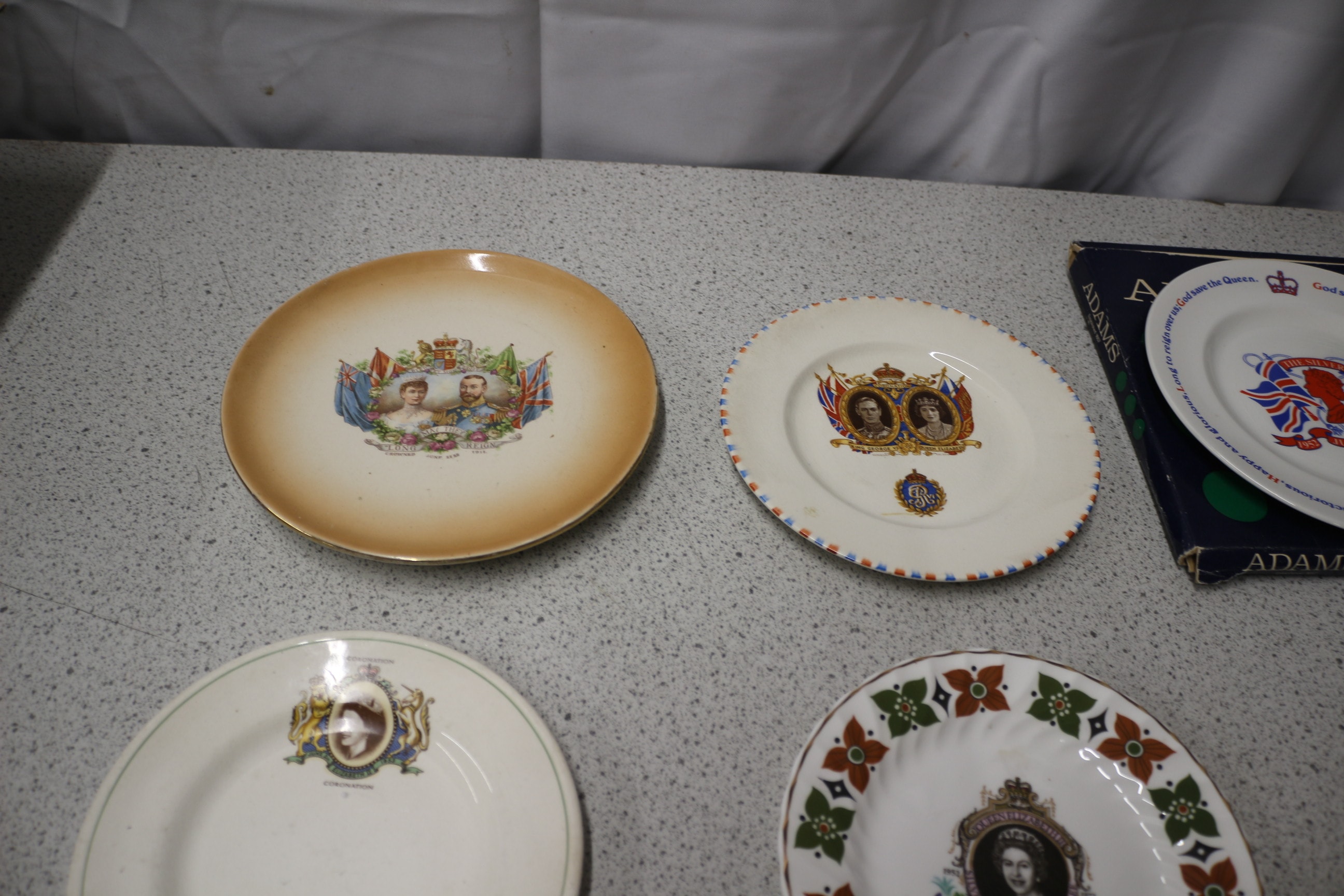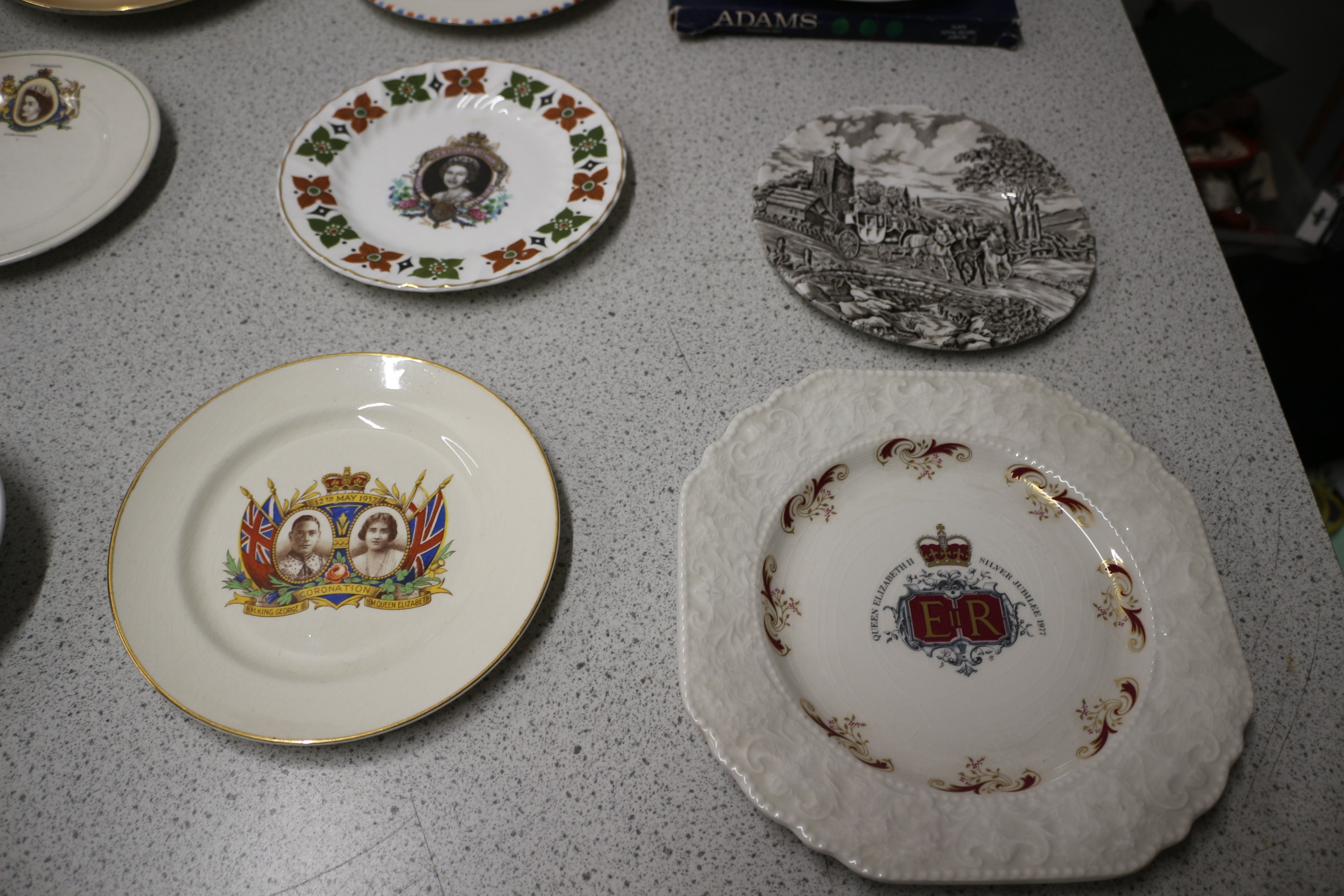 A collection of nine ceramic commemorative plates and dishes, many depicting Queen Elizabeth II and celebrating various royal events. Including Silver Jubilee 1977