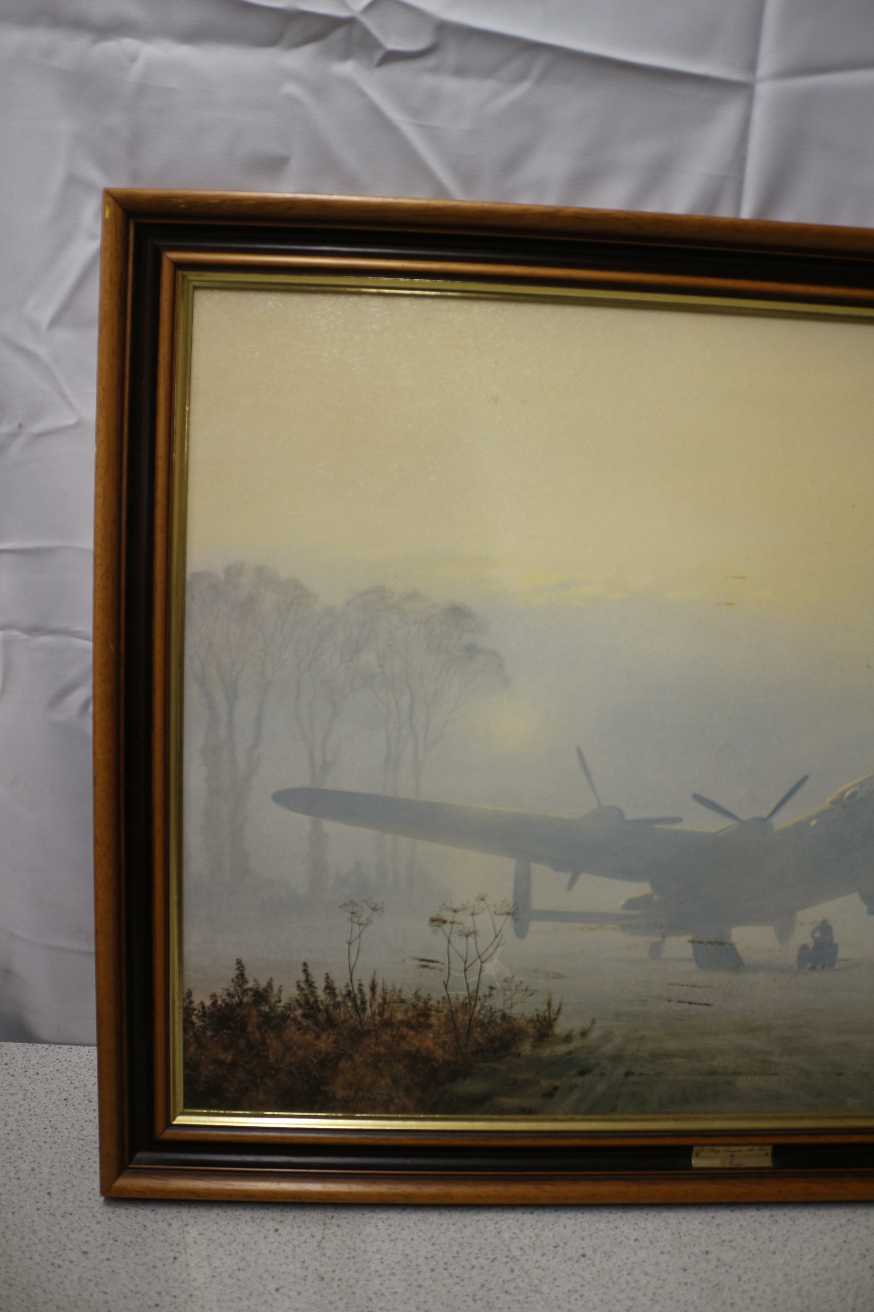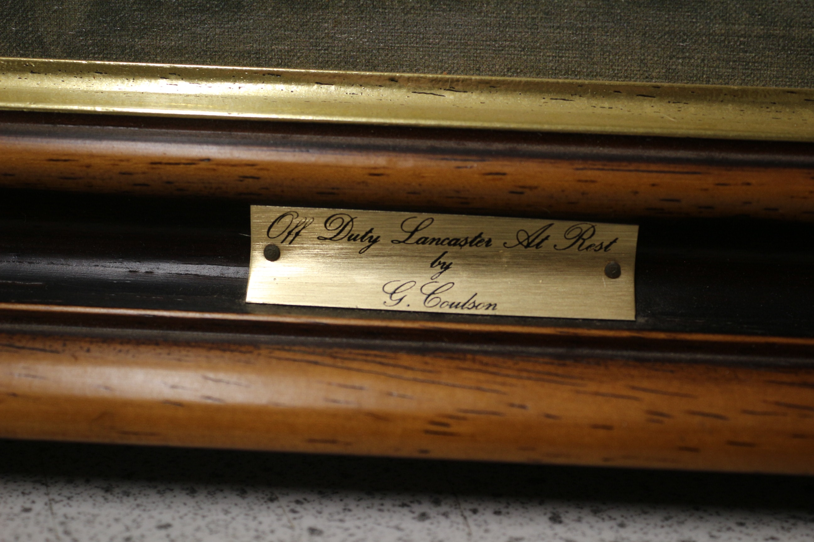 A framed artwork, depicting a Lancaster airplane in muted greys and yellows, signed “G. Coulson” and titled “Off Duty Lancaster At Rest” on a brass plaque. 86.5x65cm