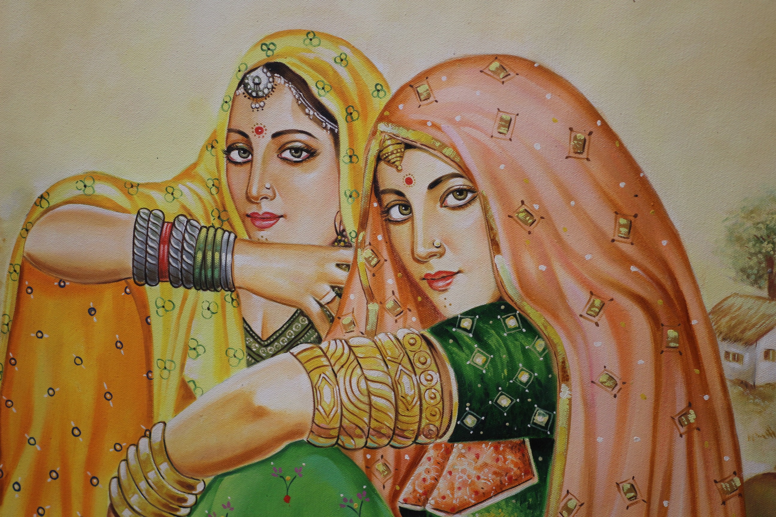 One multi-coloured oil painting on “CAMEL Oil Painting Canvas, Medium Grain Canvas, ” ” depicting three women in traditional attire (yellow, orange, green) and pottery, set against a light brown landscape.