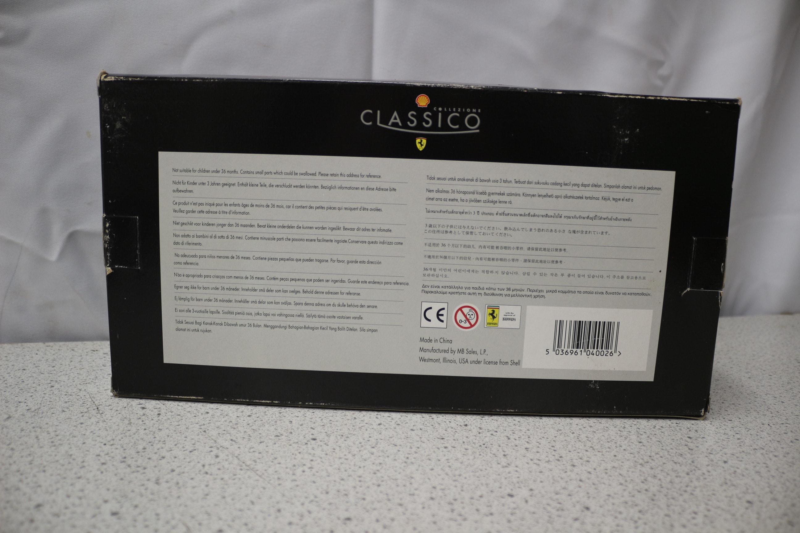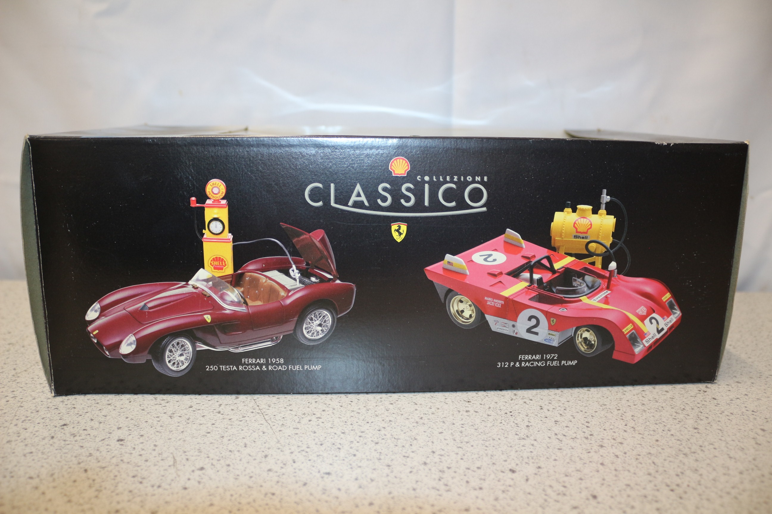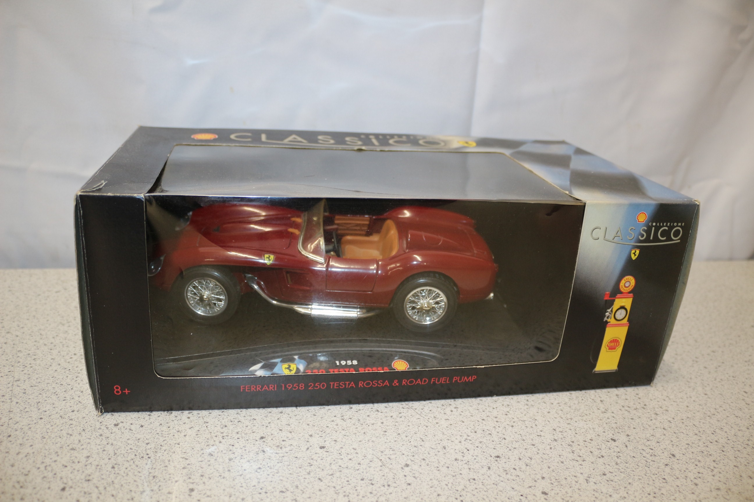 A reddish-brown/maroon die-cast Ferrari 1958 250 Testa Rossa 1:18 scale model car and road fuel pump, presented in a “COLLEZIONE CLASSICO” box with Shell and Ferrari logos, made in China. 1:18 Model