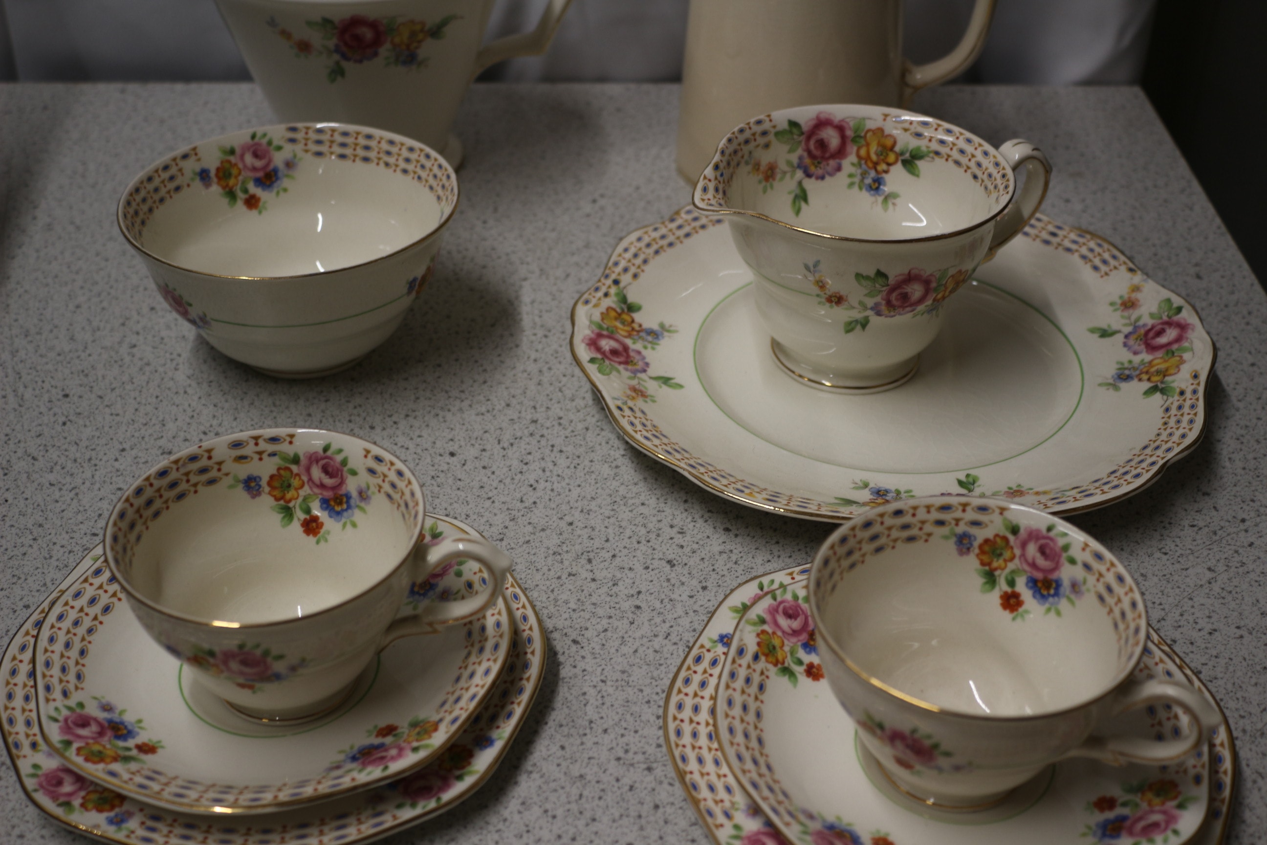 A cream-coloured ceramic tea set with multicoloured floral patterns, gold accents, and blue and gold lattice borders, comprising of 23 pieces, teapot, coffee pot, jug, bowl, teacups, saucers, and side plates, marked ‘MADE IN GREAT BRITAIN’ and ‘1856’.