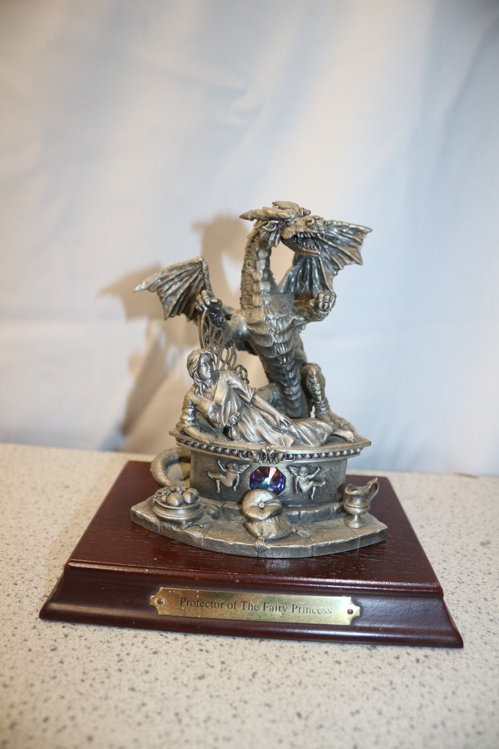 A silver-coloured pewter figurine depicting a dragon protecting a reclining fairy princess, mounted on a dark reddish-brown wooden base with a multi-coloured gem, inscribed ‘2000 ONE YEAR ONLY PIECE’ and ‘PROTECTOR OF THE FAIRY PRINCESS’.