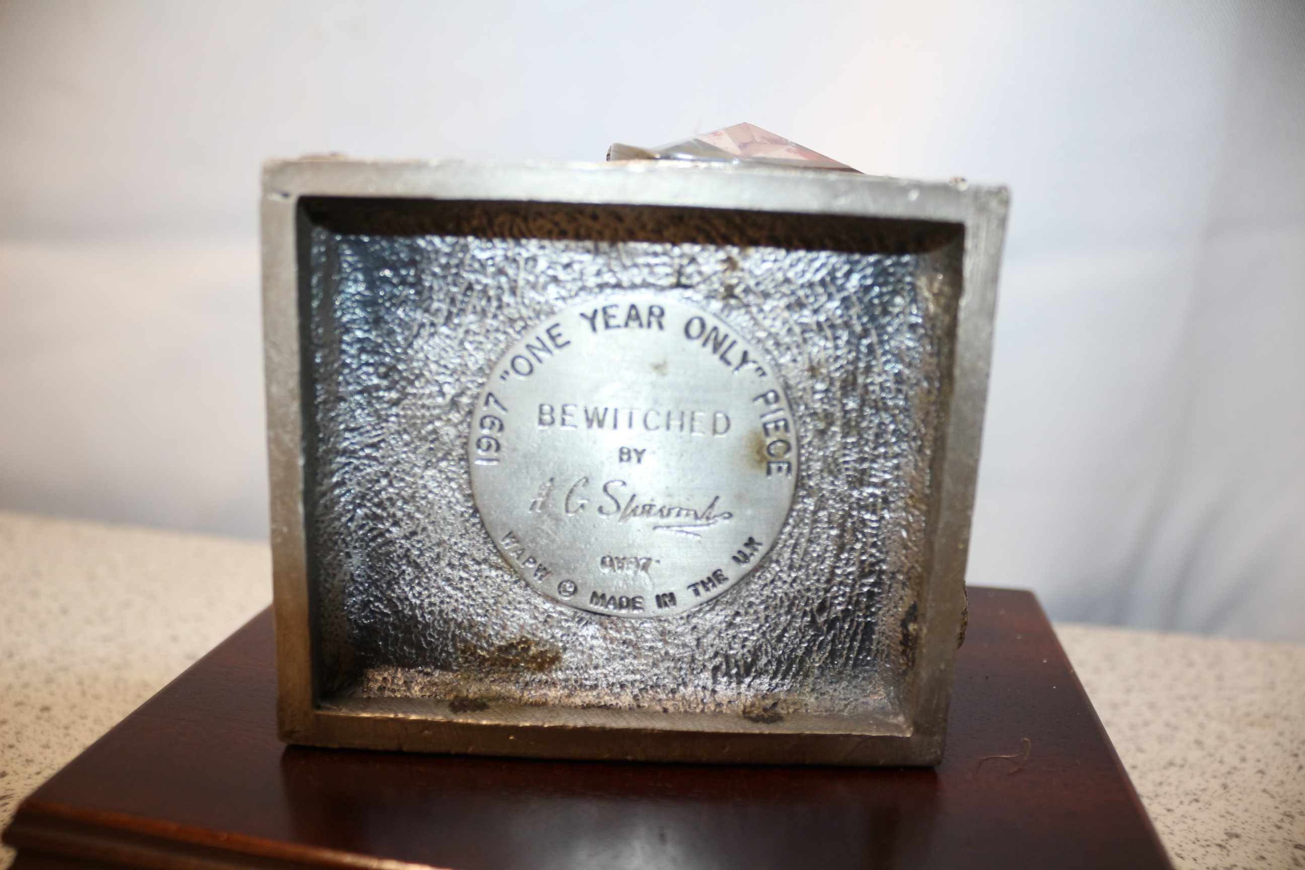 A silver-grey dragon statue featuring a purple faceted heart-shaped stone, mounted on a dark brown wooden base with a front plaque engraved “Bewitched, ” and an underside inscription reading “1997 “ONE YEAR ONLY” PIECE BEWITCHED BY J.C. Sherratt ©97 MADE IN THE U.K.” 17cm tall