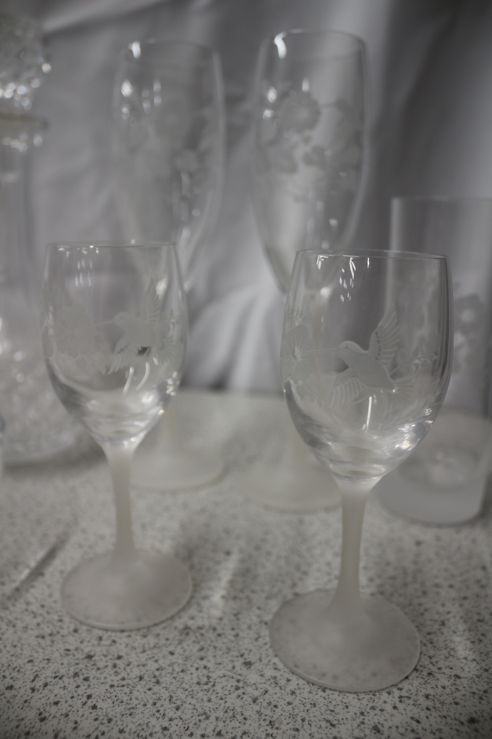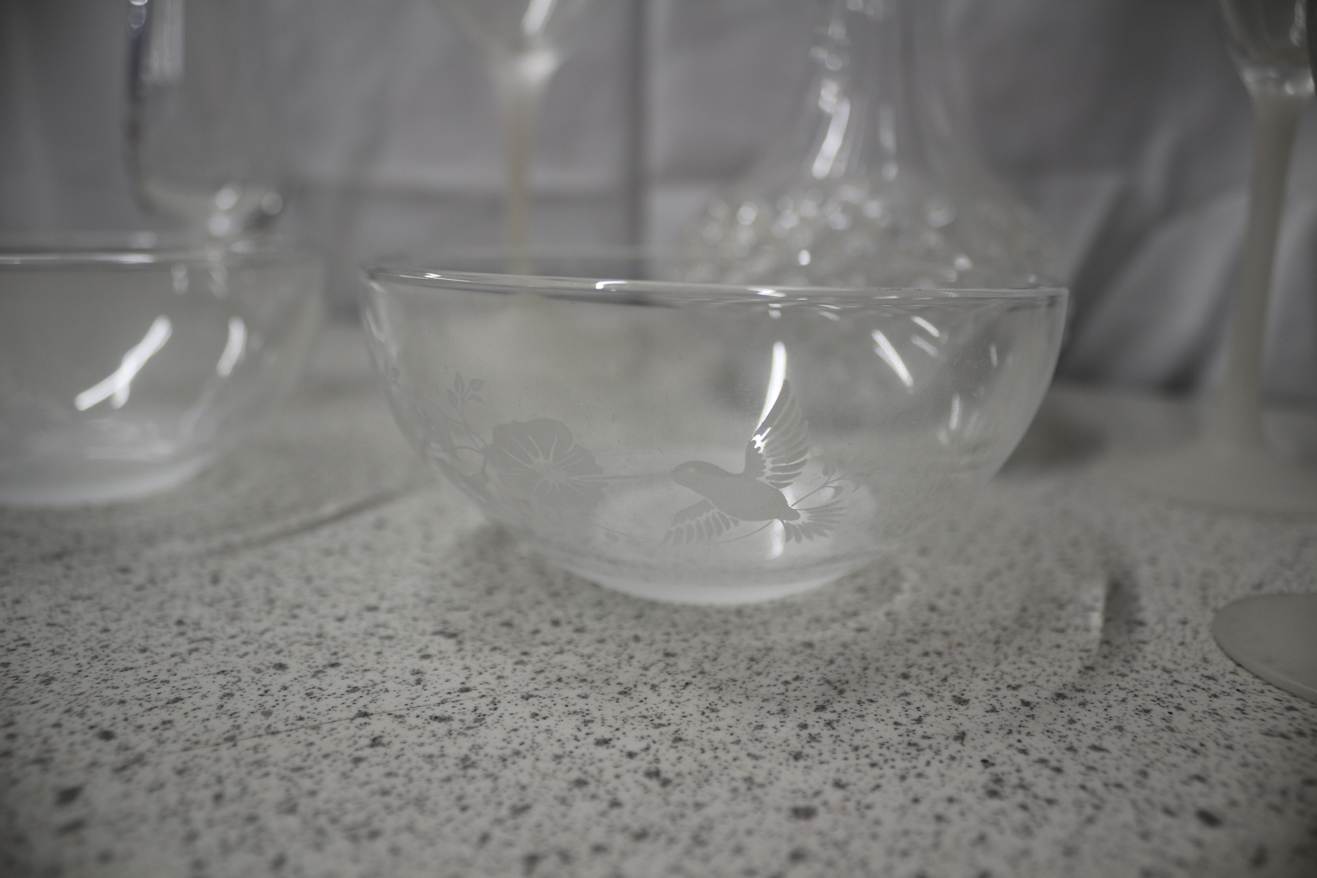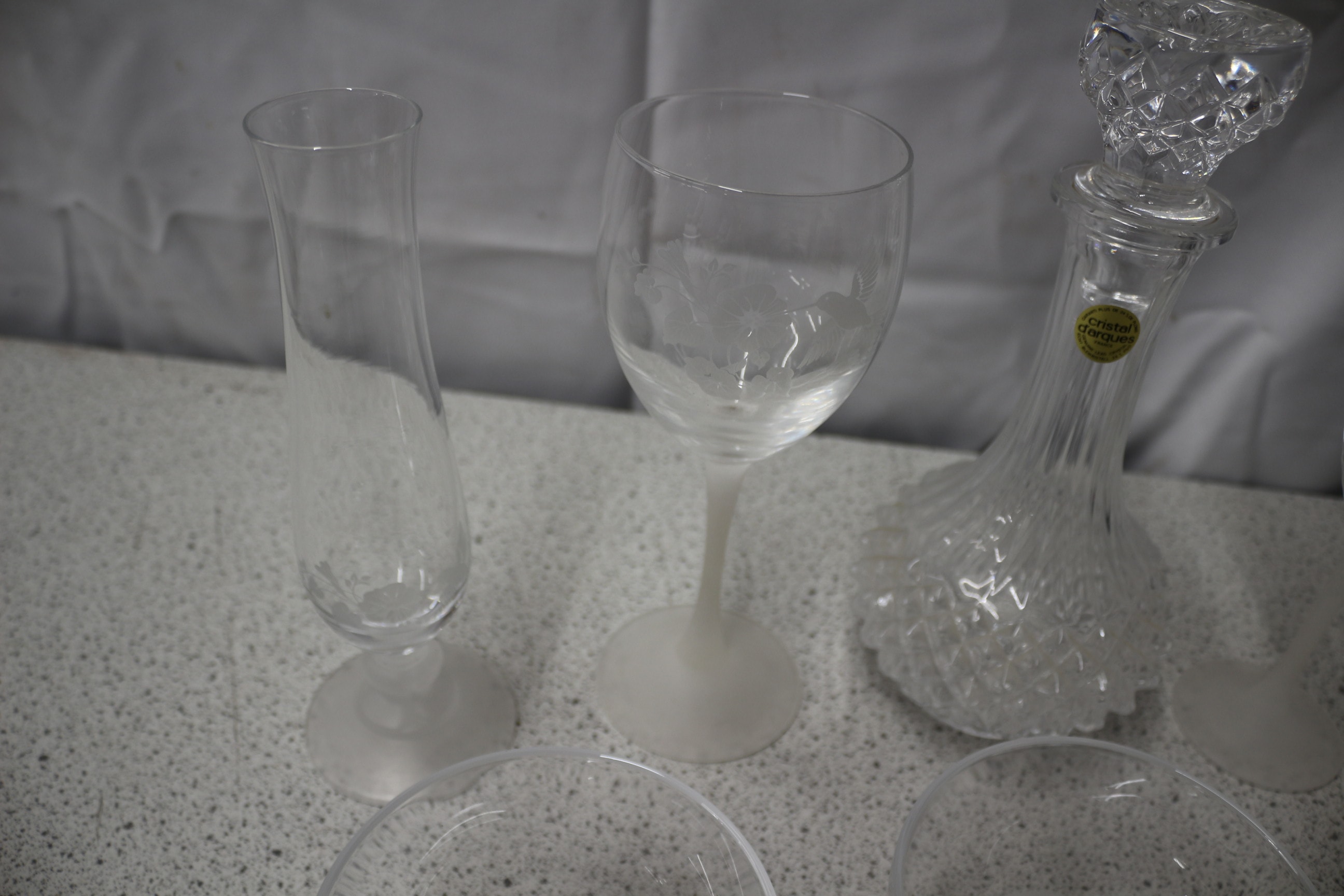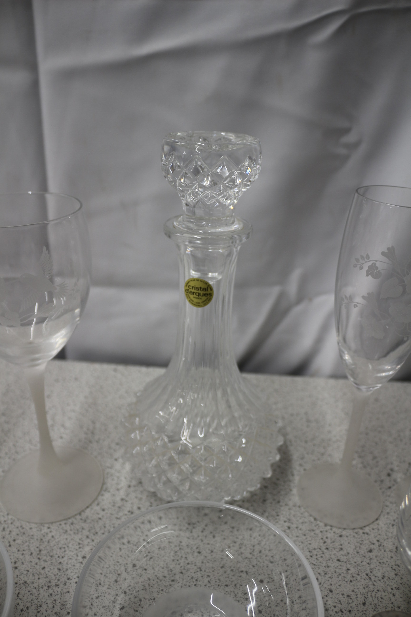 A collection of frosted etched glass pieces, including one Cristal d’Arques Genuine French Lead Crystal decanter, one bud vase, two wine glasses, two champagne flutes, two tumblers, and two small bowls, all featuring bird and floral etched designs.