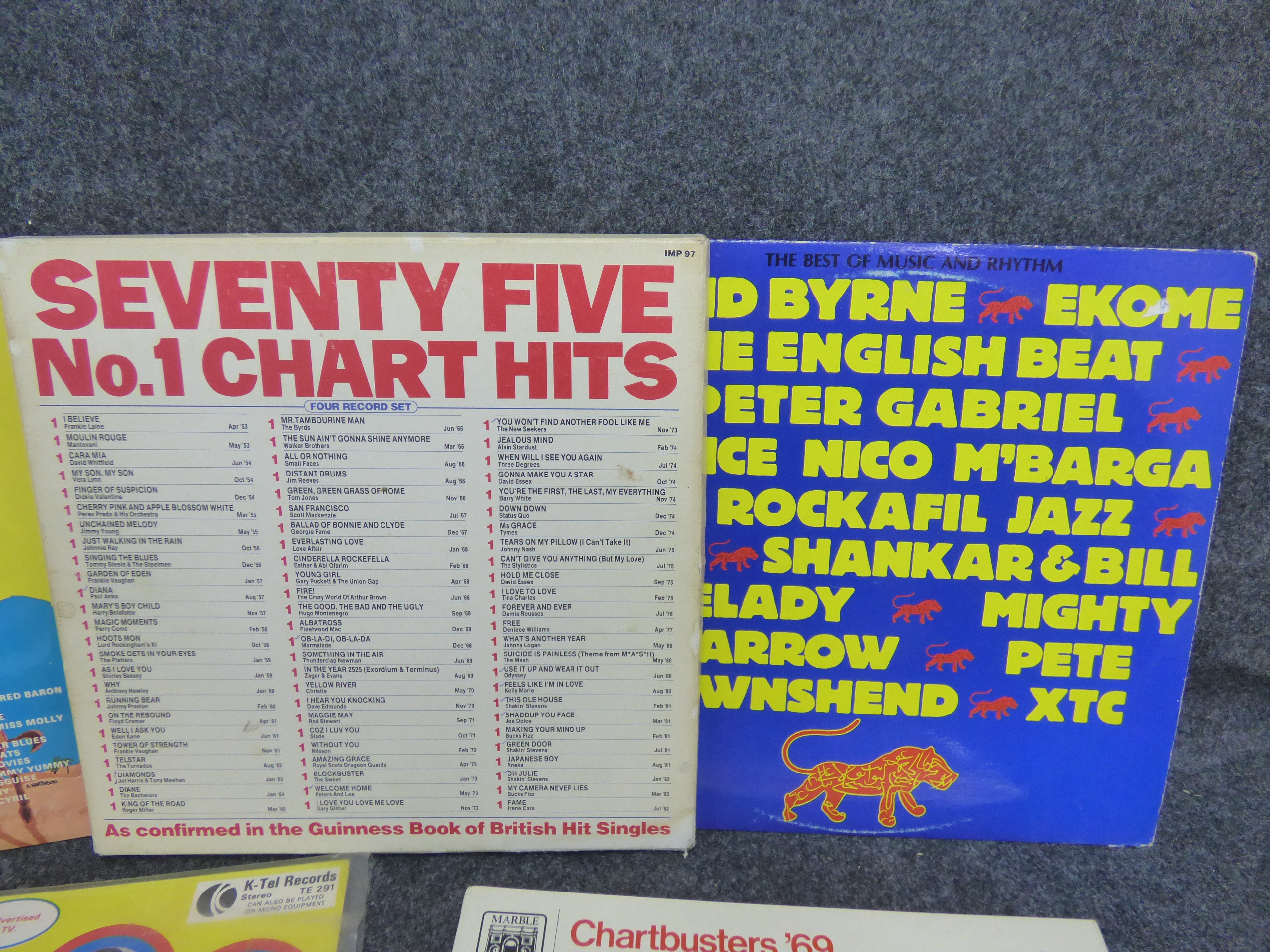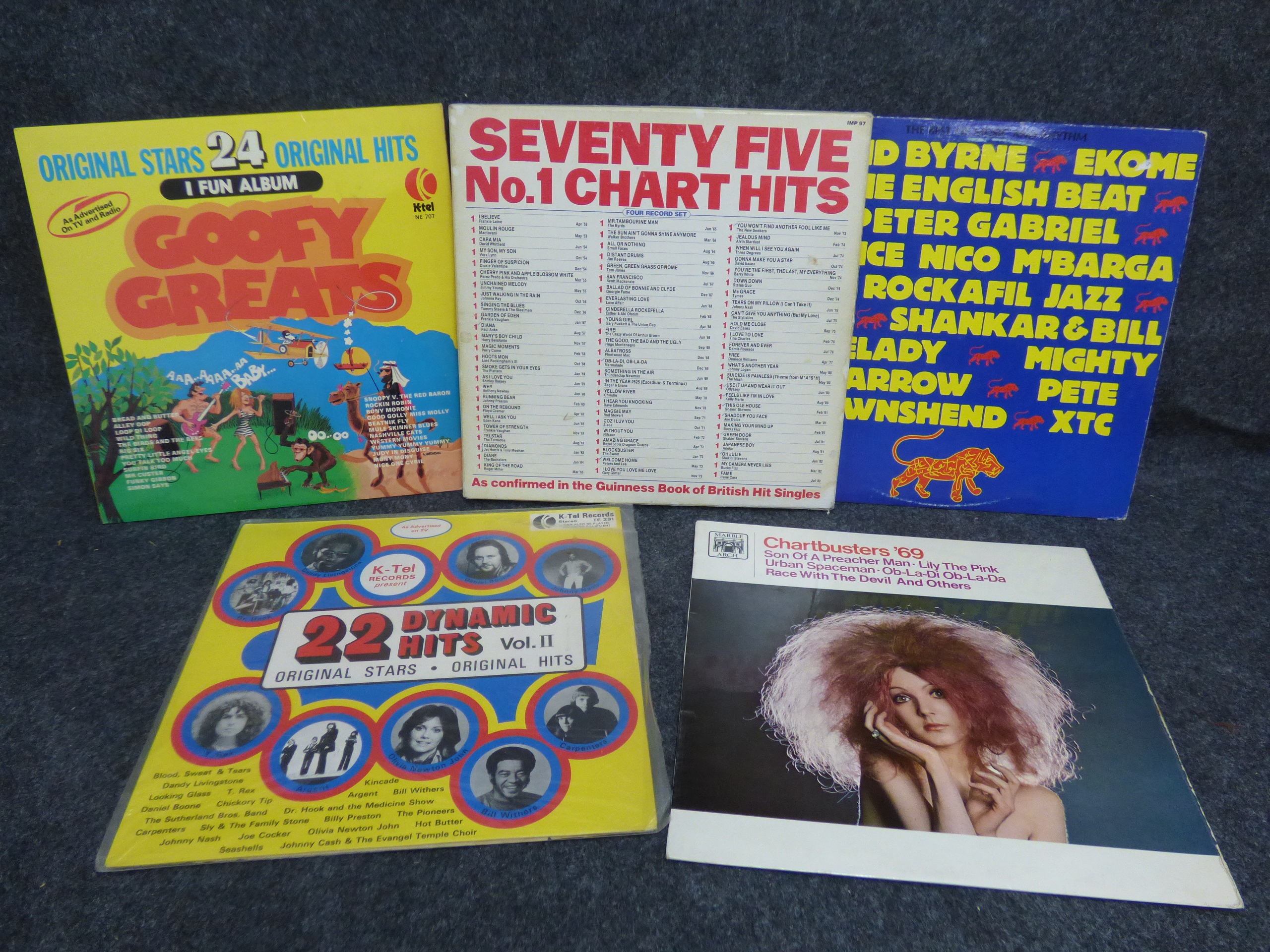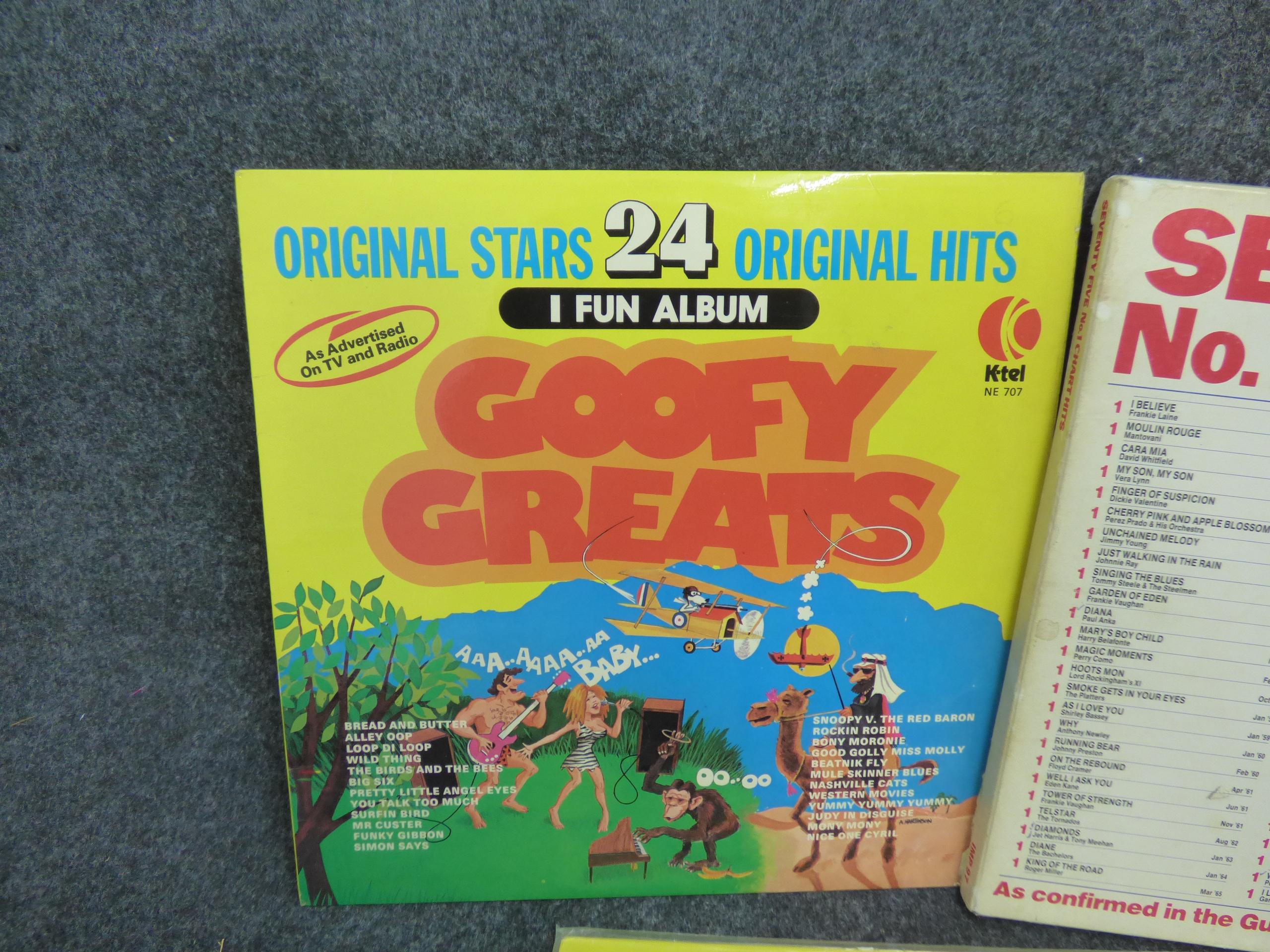 A collection of several vinyl record albums featuring compilation titles such as K-tel Goofy Greats, Seventy Five No. 1 Chart Hits, and Chartbusters ’69.