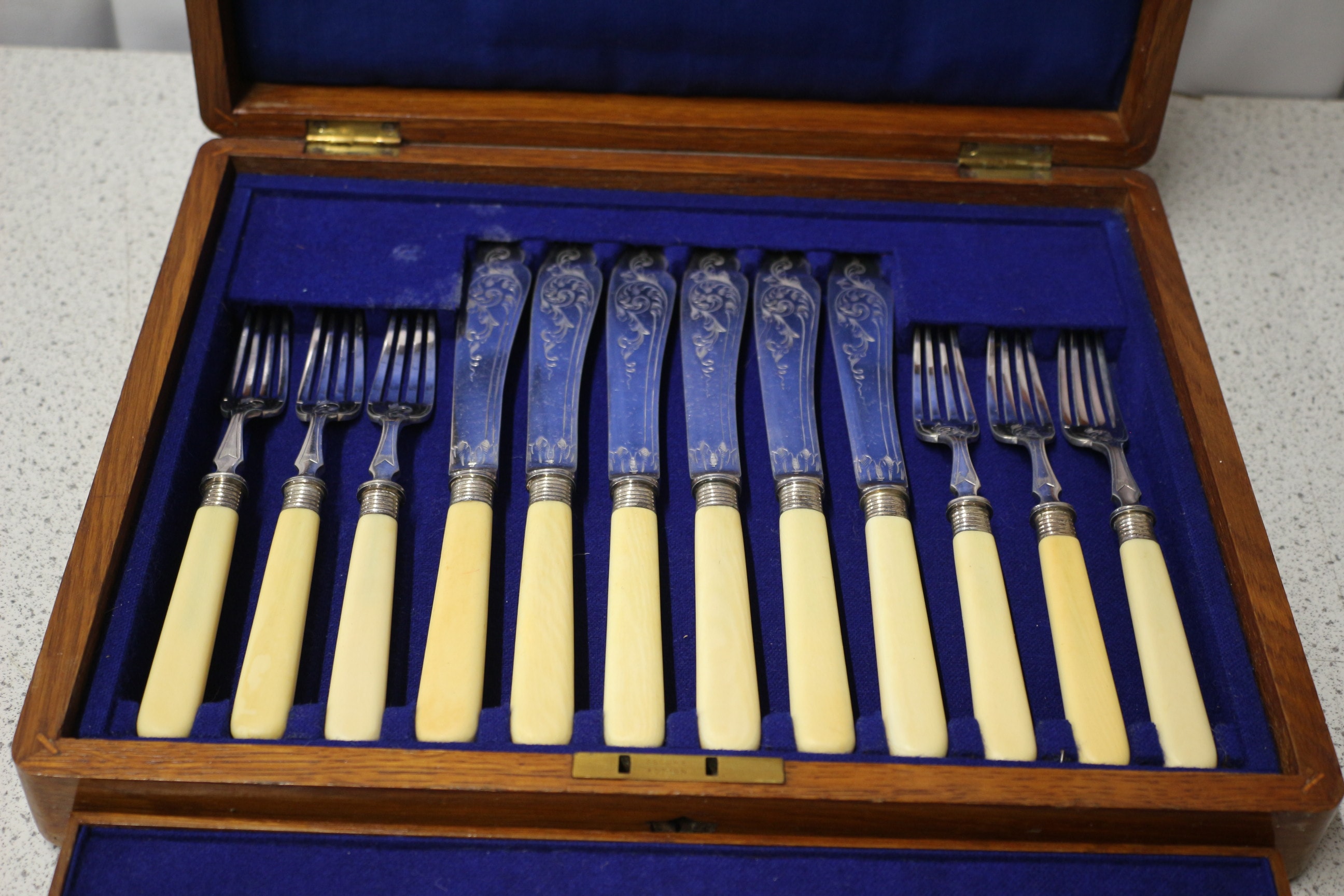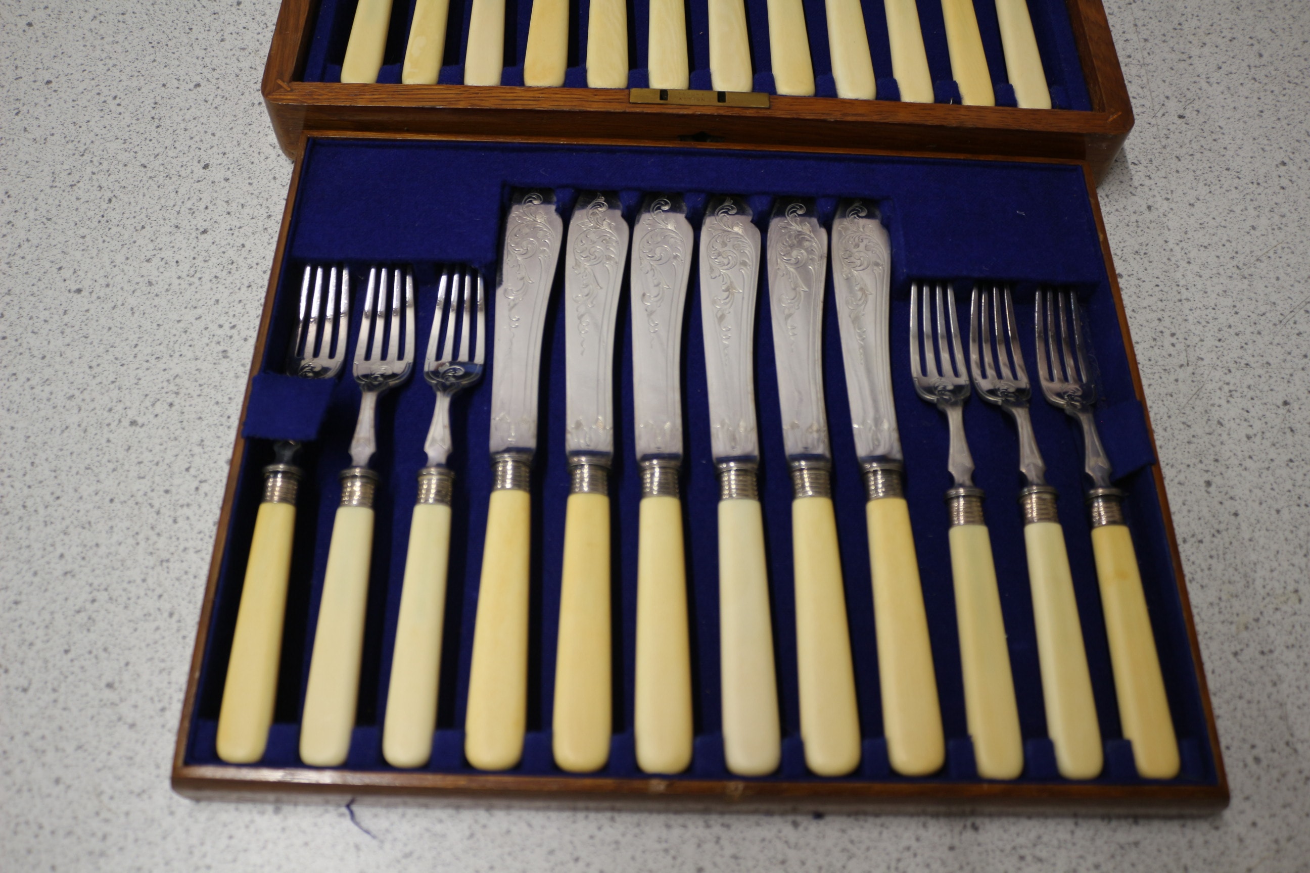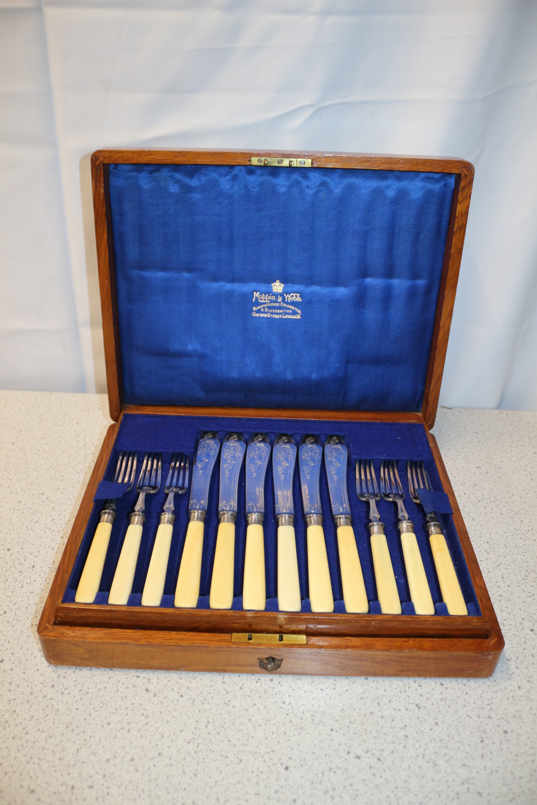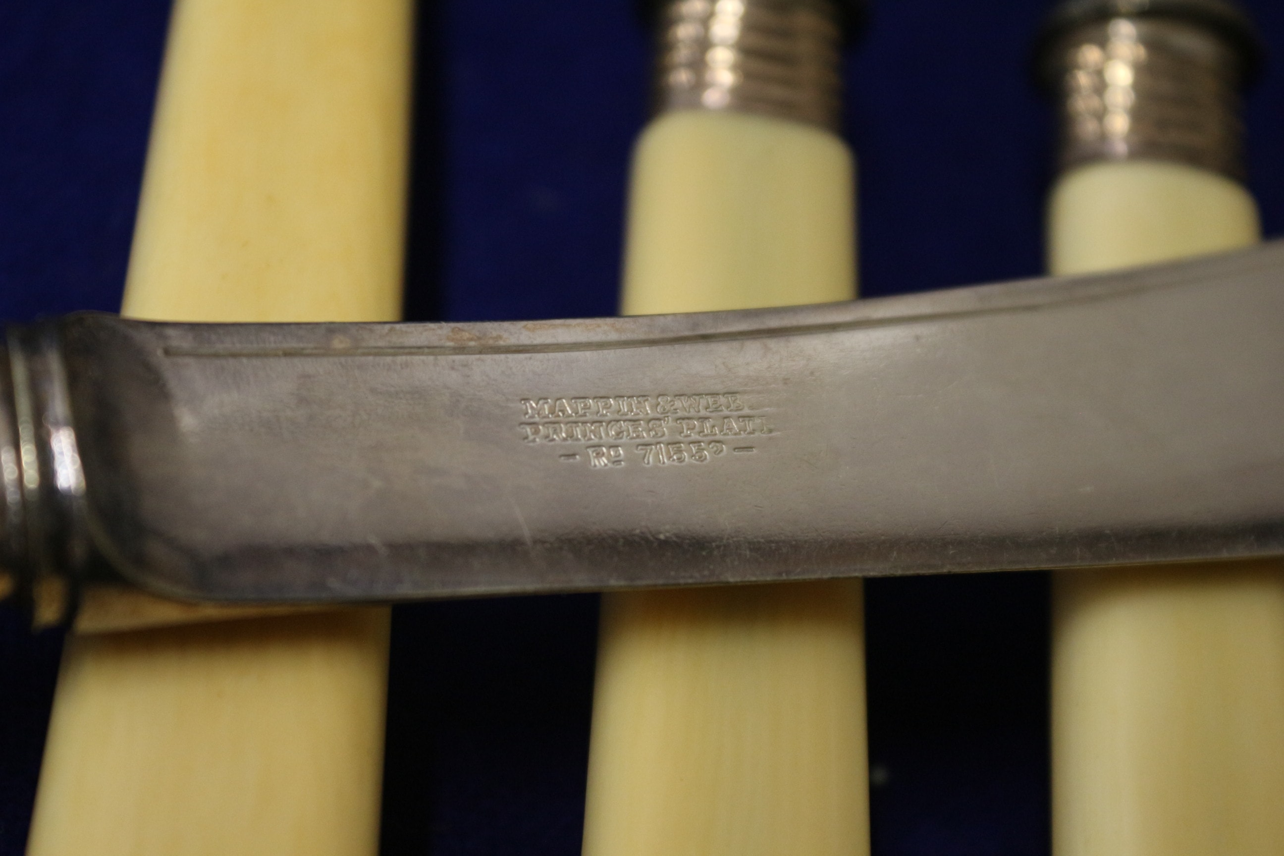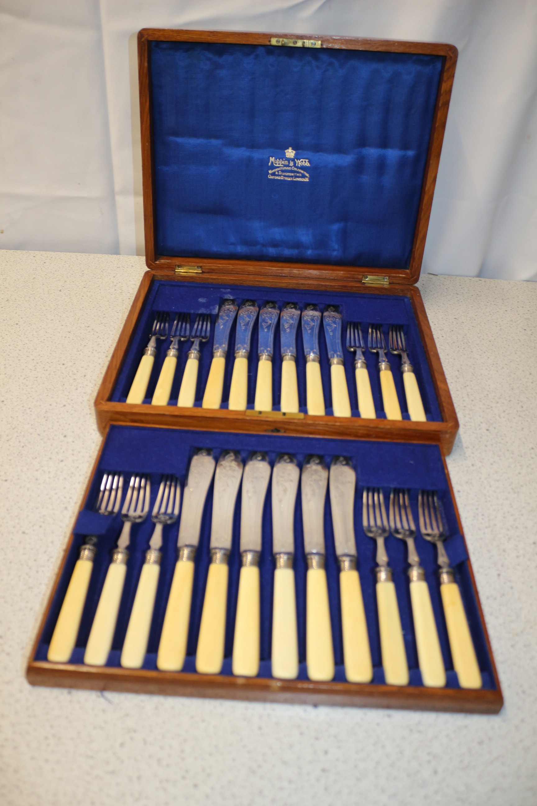 A 24-piece Mappin & Webb cutlery set (12 knives, 12 forks) with cream-colored handles and silver-coloured metal blades/tines, marked “MAPPIN & WEBB. PRINCES PLATE. No 7135-“, housed in two brown wooden cases with blue velvet interiors, inscribed “Mappin & Webb. Manufacturing Goldsmiths & Silversmiths. Oxford Street London W.”.