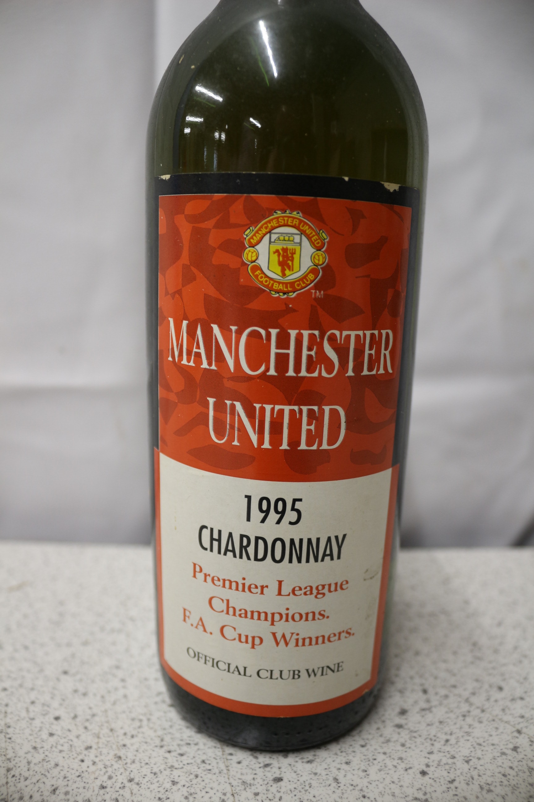 A unopened bottle of Manchester United 1995 Chardonnay wine with a red cap, featuring a red and white label reading “MANCHESTER UNITED FOOTBALL CLUB”, “Premier League Champions.”, “F.A. Cup Winners.”, and “OFFICIAL CLUB WINE”.
