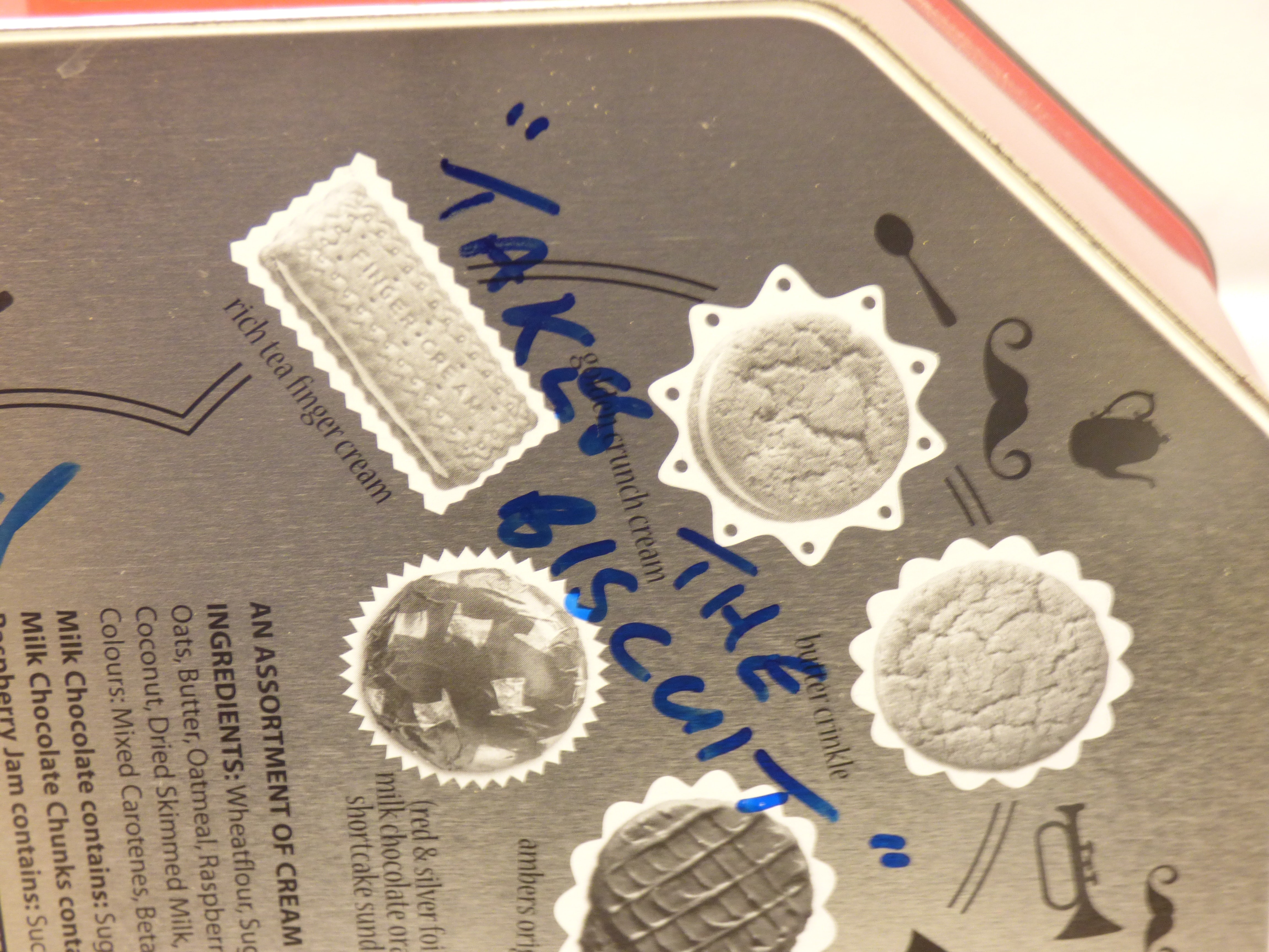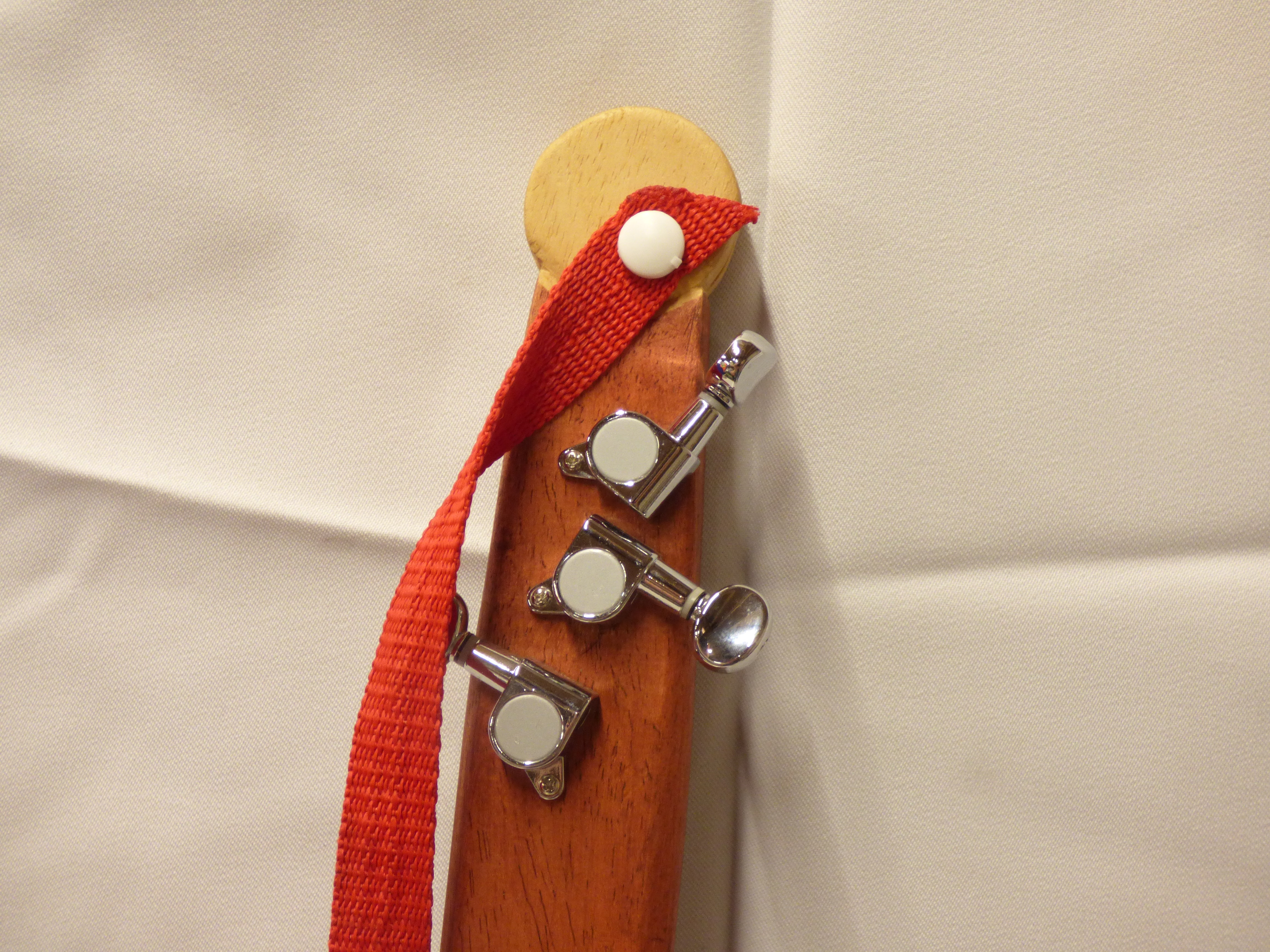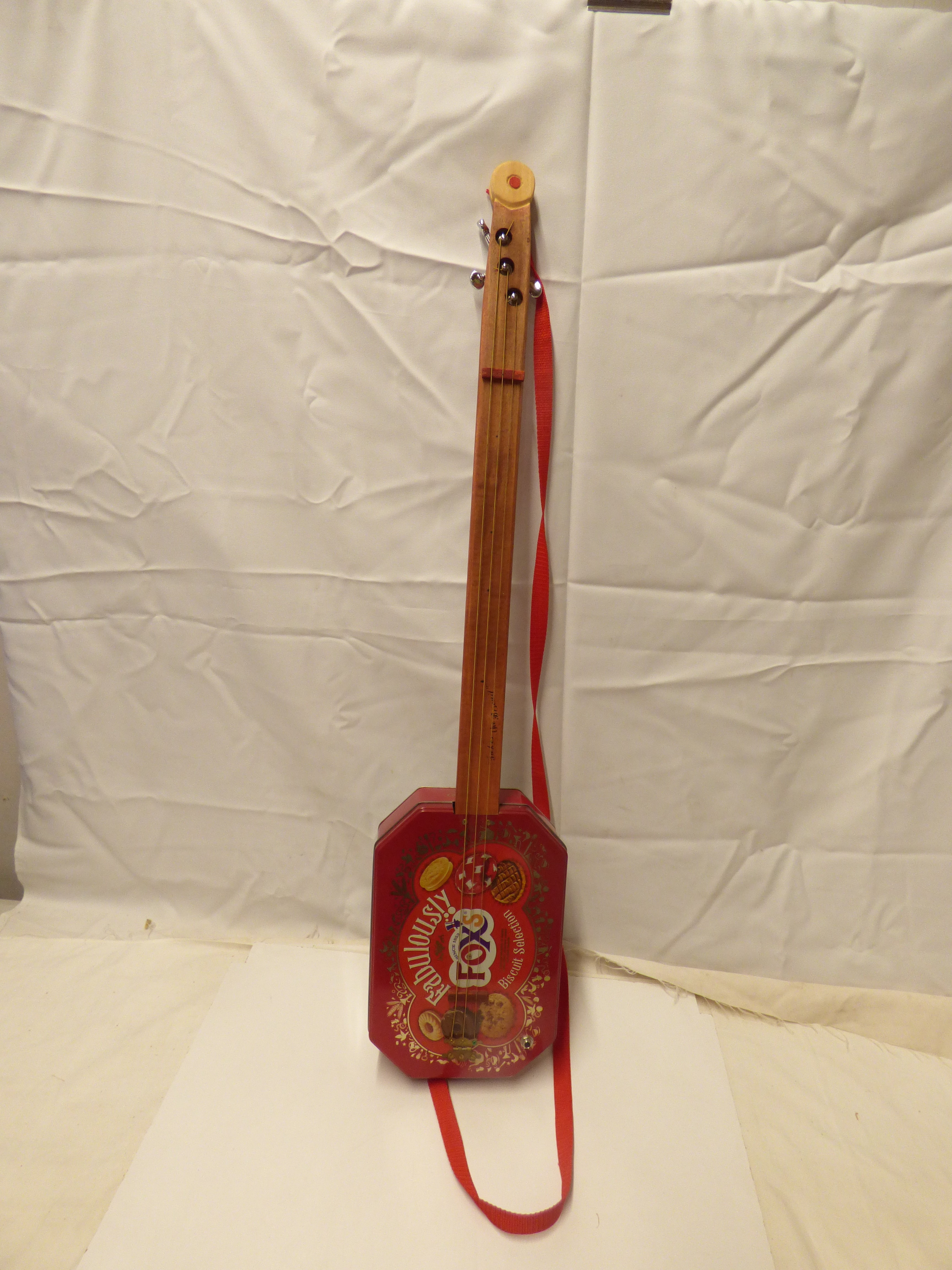 Guitar/Ukulele by W.C.P. Clewer, made from a Fox’s “Fabulously! Biscuit Selection” tin, with “Takes The Biscuit” on the neck and tuning details on the back. Made with Gibson parts (nut to bridge) Signed