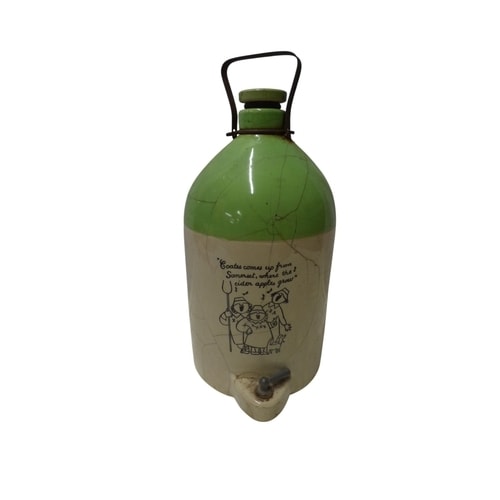 A two-toned green and cream ceramic empty cider jug with a spigot and metal handle, inscribed “Coates comes up from Somerset, where the cider apples grow” alongside an illustration of three figures. 47cm tall
