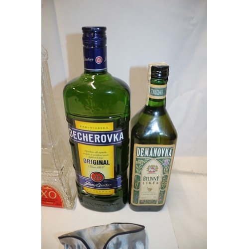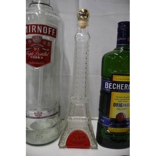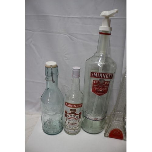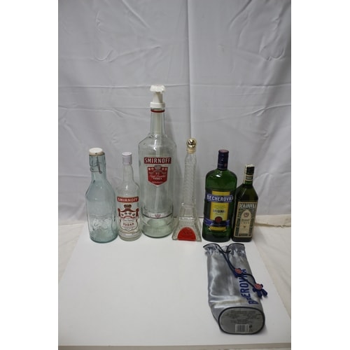 A collection of six bottles some empty and a pouch, including a light blue embossed glass milk bottle, two clear Smirnoff vodka bottles (one large with pump, one small), a clear Eiffel Tower shaped bottle, a unopened green Becherovka liquor bottle, a unopened small green St. Nicolaus Demanovka bottle, and a silver Becherowka fabric pouch.