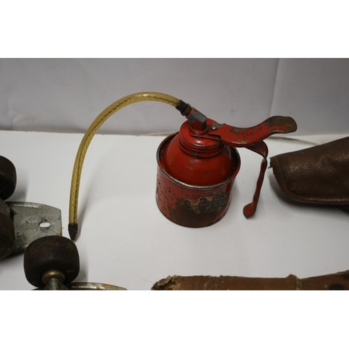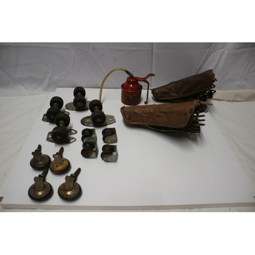 This lot includes one red metal oil can with a flexible yellow hose, marked “WORLD WIDE TRADER” on its rusted side, two brown leather bicycle saddles with exposed springs, and a collection of approximately 15 casters or rollers with dark brown/black wheels and metallic housings.