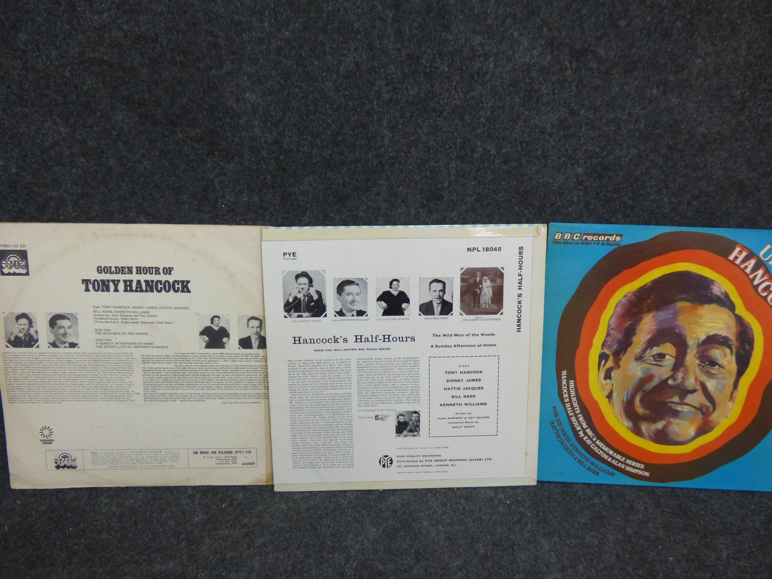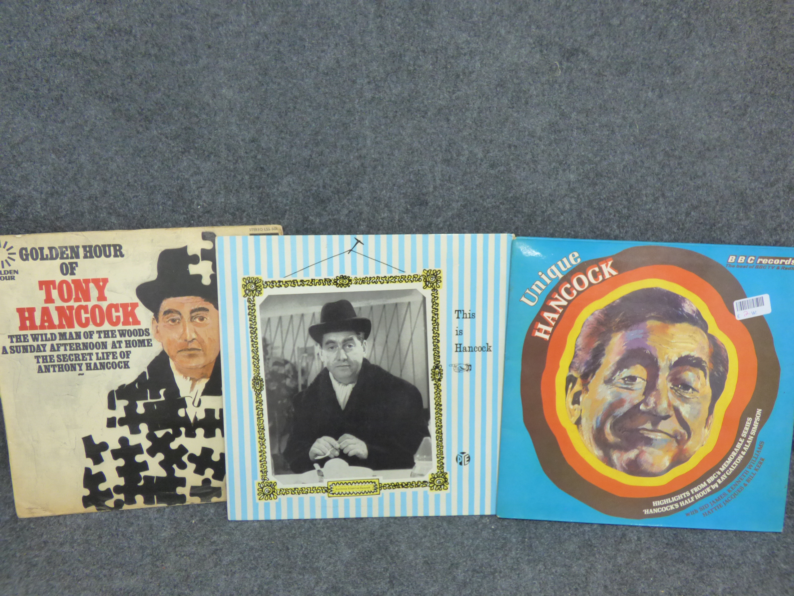 A trio of vintage vinyl record albums featuring British comedian Tony Hancock, including titles Golden Hour of Tony Hancock, This is Hancock, and Unique Hancock.