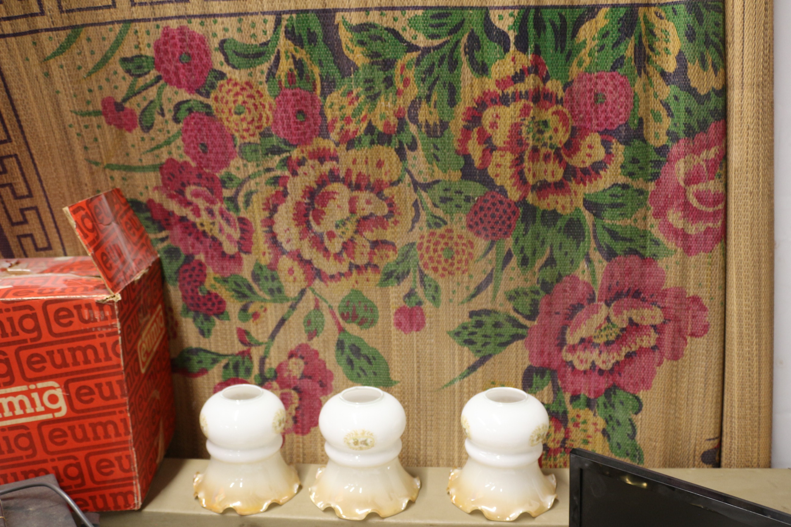 Mixed lot inc A grey and black projector, labelled “CMP COMMERCIAL MOTION PICTURES LTD.” and “eumig mark M SUPER”, features a brown tag with diagrams and German text including “Anschlußplan”. 19″ Alba TV, Light, Woven Mat and More. Untested