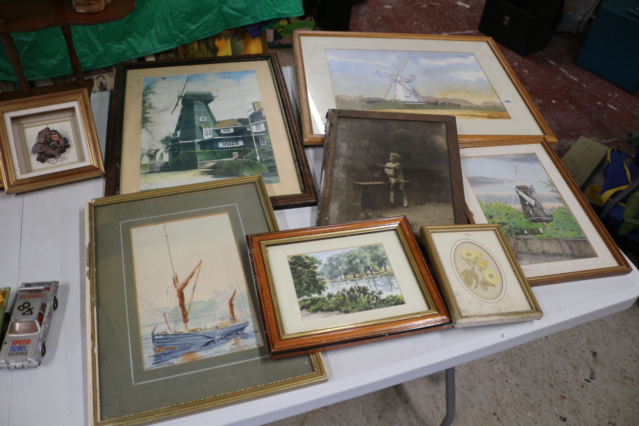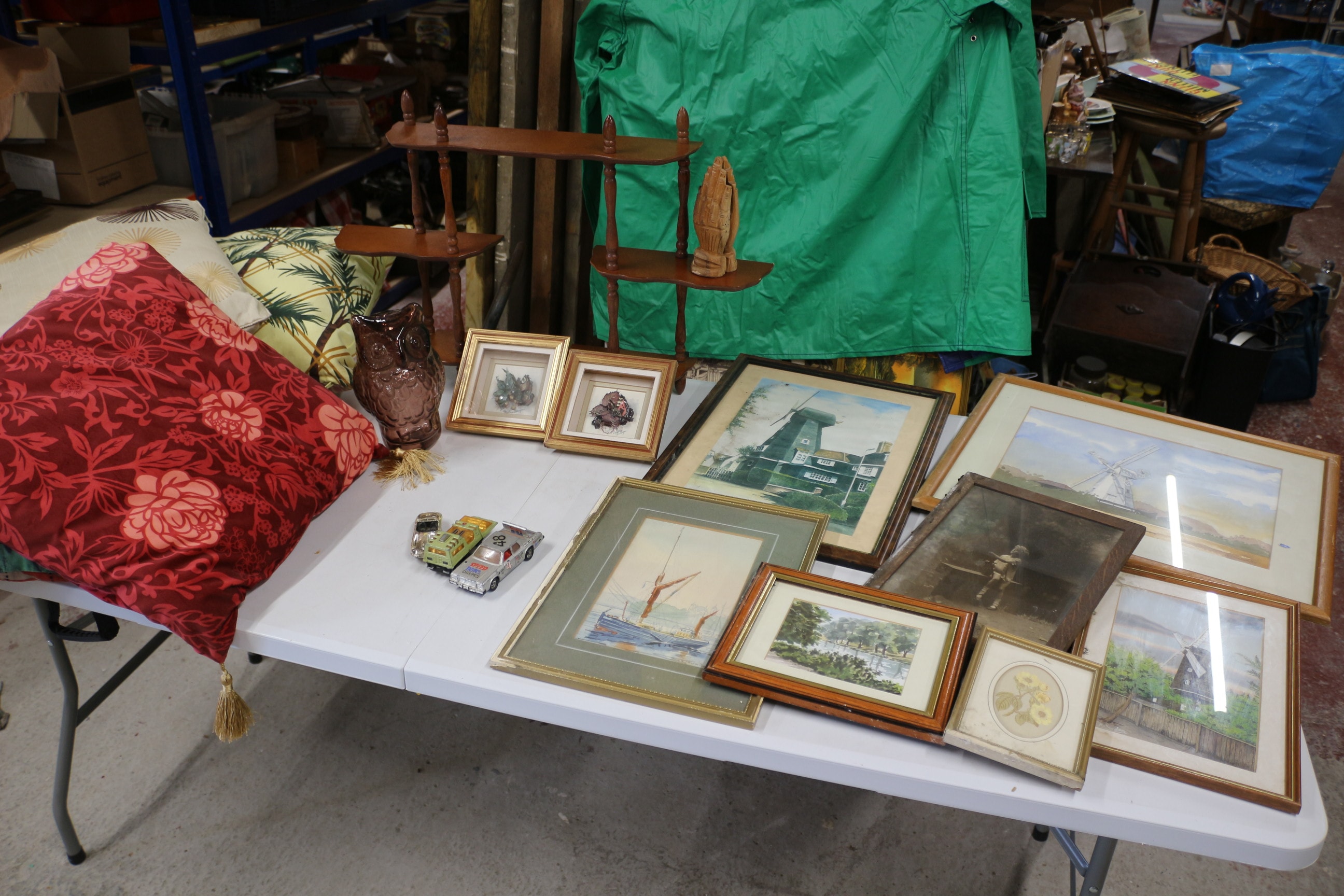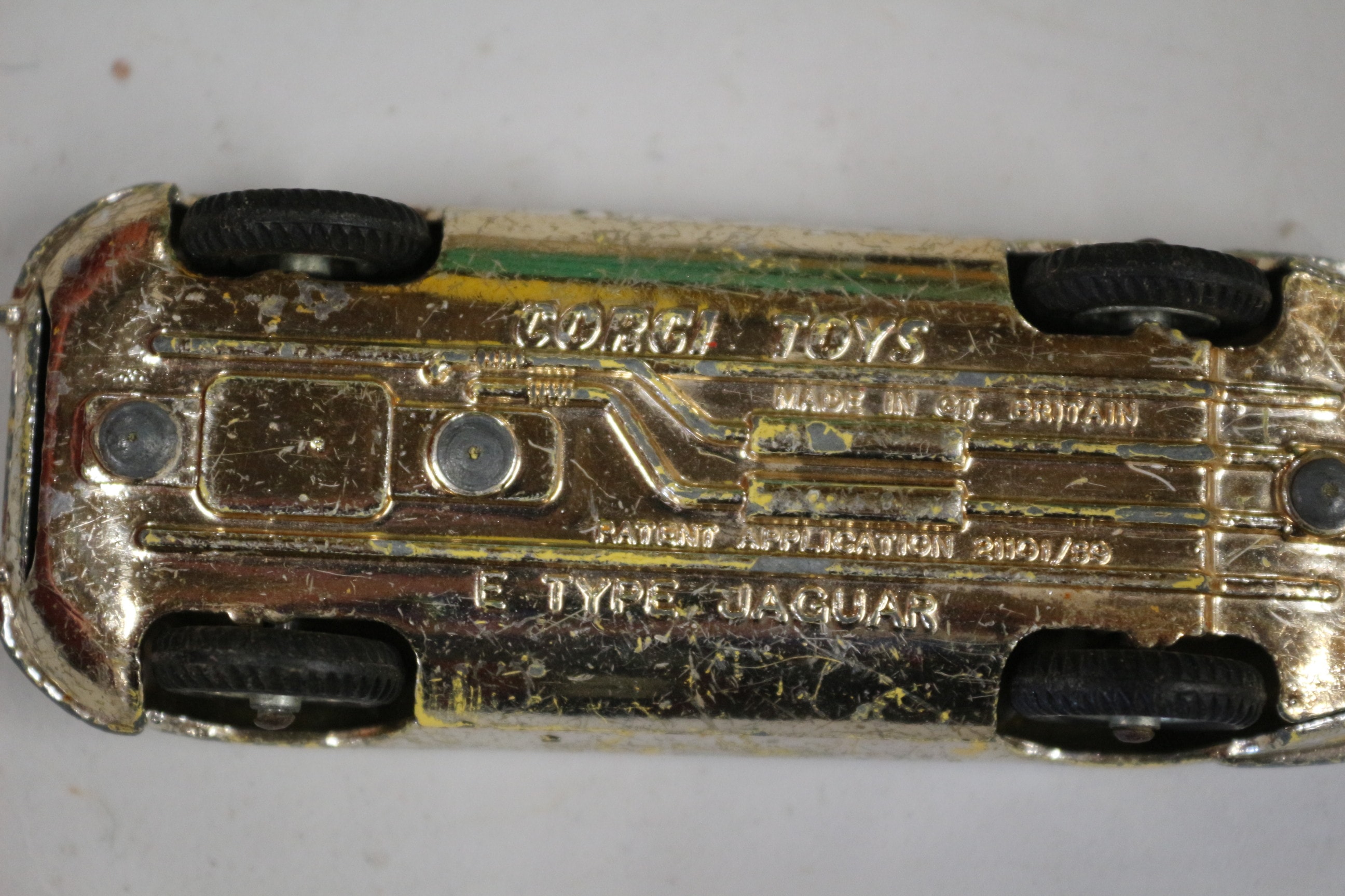 Mixed lot of Three die-cast model cars, including a gold/yellow Corgi Toys ‘E Type Jaguar’ marked ‘Made in Gt. Britain’ and ‘Patents Pending Regd. Design 209/69’, a green car, and a silver car marked ‘8’ and ‘Speed Trac Champion’. pictures, cushions and more