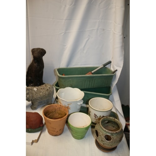 A collection of garden figurines, including a gnome and various animals, along with assorted planters, trays, boards, and one J.R. Williams Sheffield knife with a silver/grey blade and dark brown/black handle.