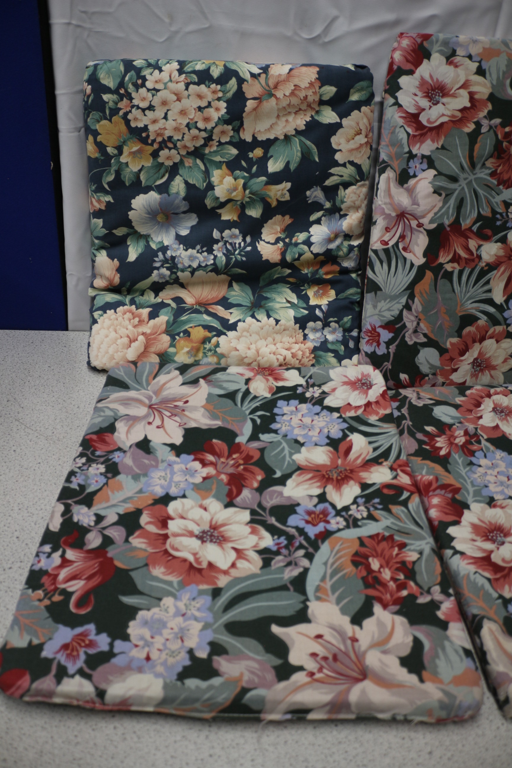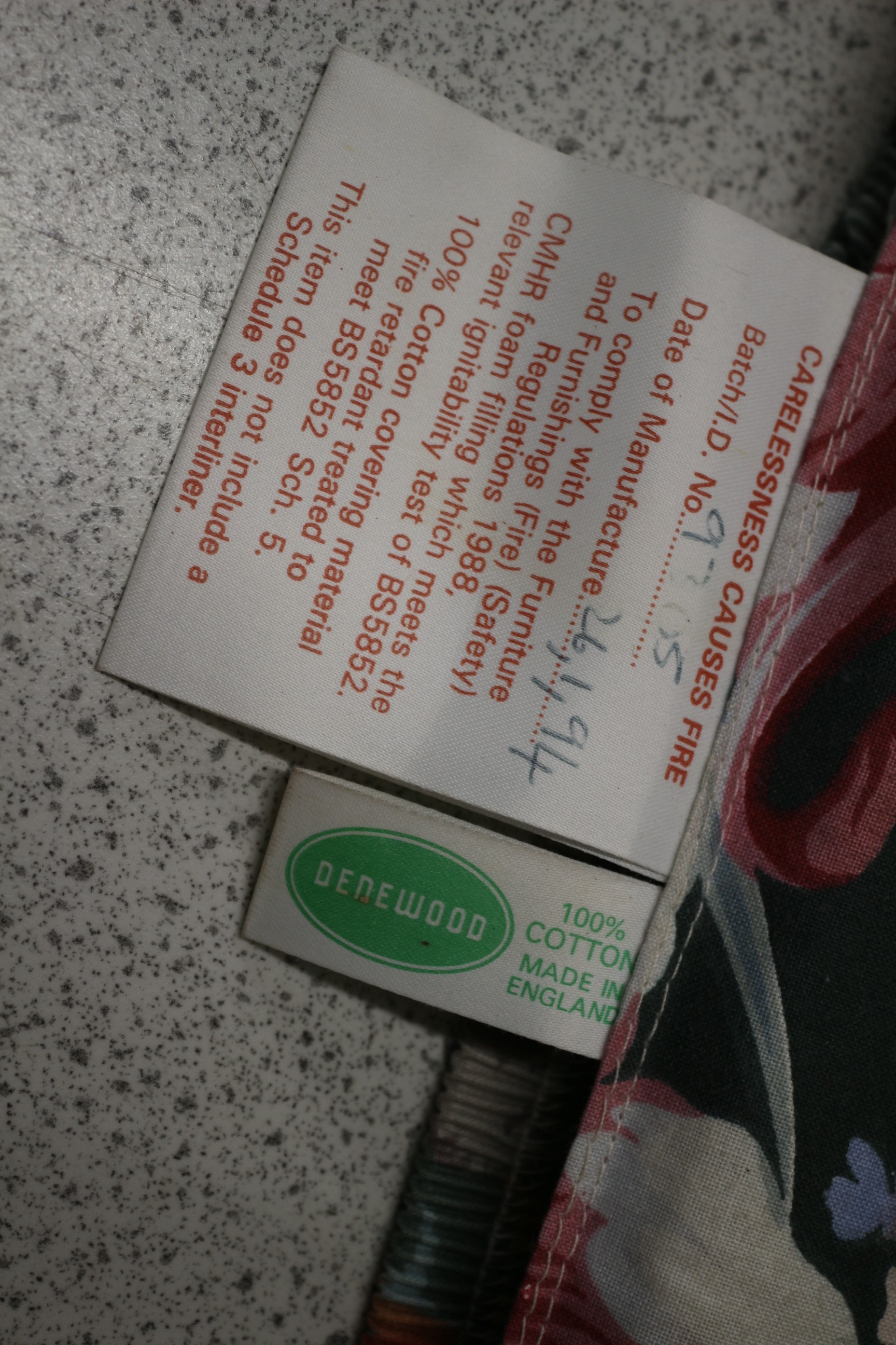 A set of six floral pattern cushions in dark green, red, pink, white, cream, peach, orange, yellow, and blue hues, with one cushion featuring a ‘DENEWOOD’ brand label stating ‘100% COTTON’ and ‘MADE IN ENGLAND, ‘ and a safety label dated ’26/4/94’ indicating compliance with UK fire regulations.