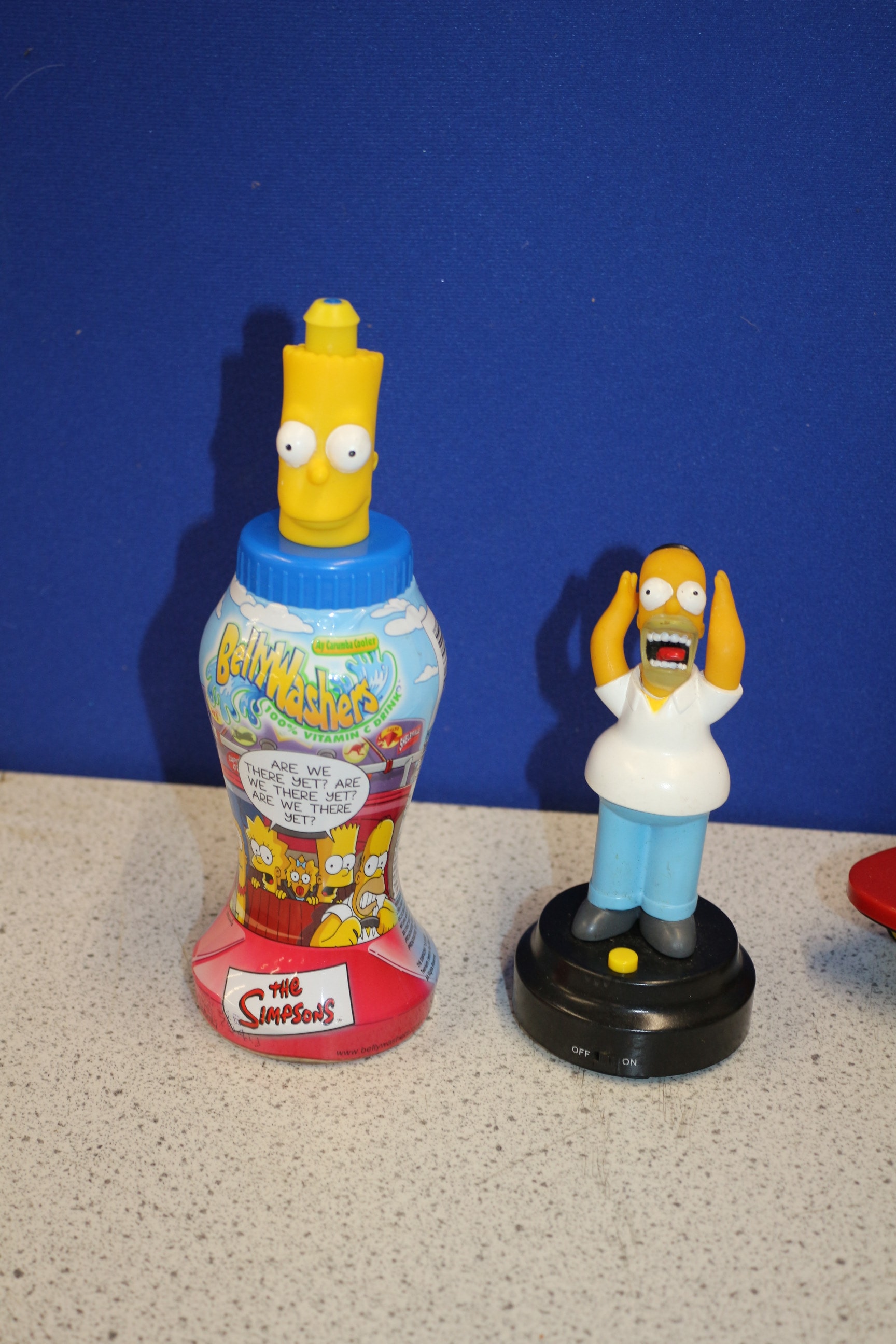 A collection of four plastic The Simpsons items, including a Bell Washer Vitamin Drink bottle with Homer Simpson cap, a Homer Simpson figure on a base, a Bart Simpson skateboarding toy, and a Manic Malibu can.