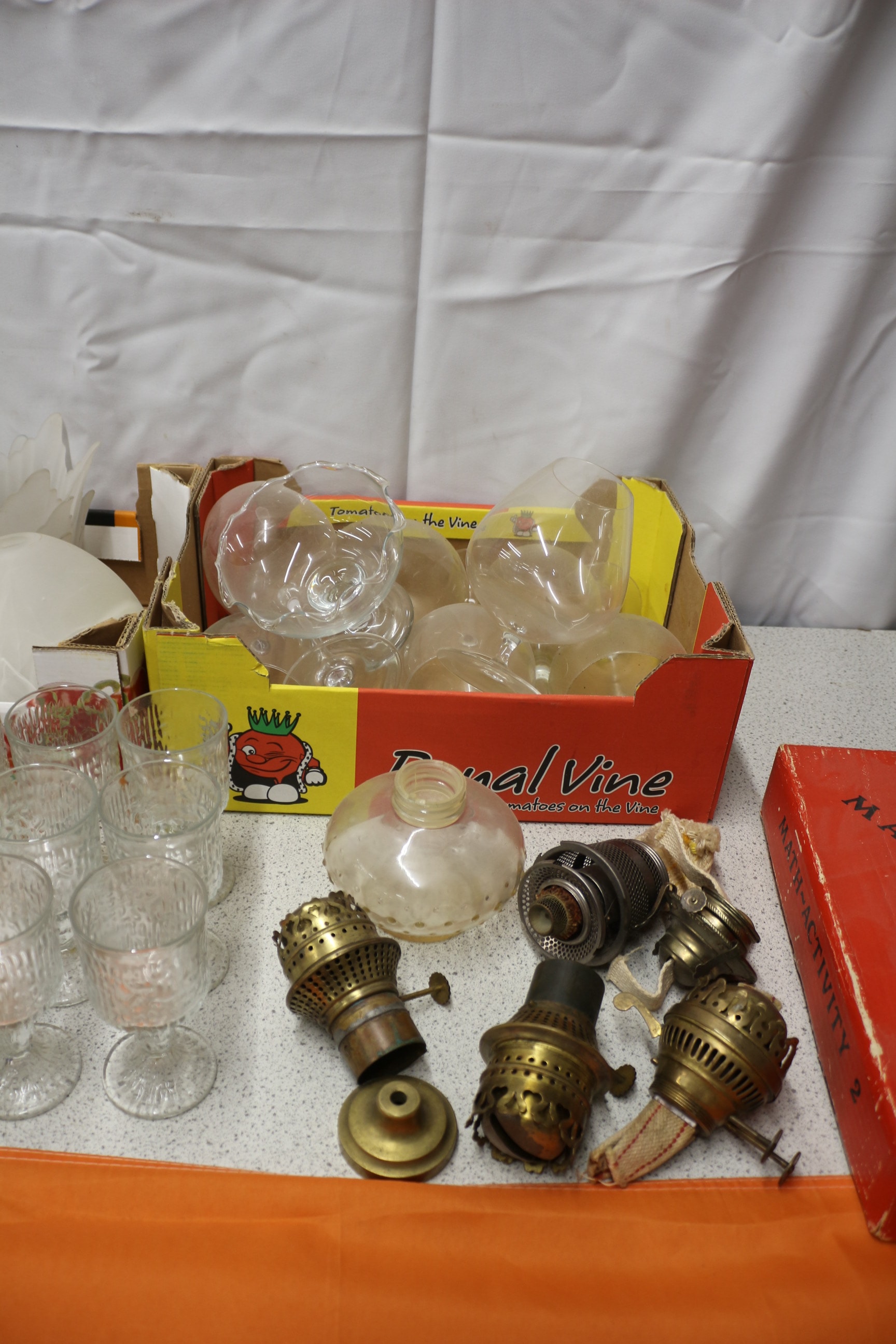 This lot includes a vintage South African flag, two “MATH-ACTIVITY” textbooks, assorted clear and frosted white glassware, and several brass-toned metal lamp burners with a glass oil lamp base.