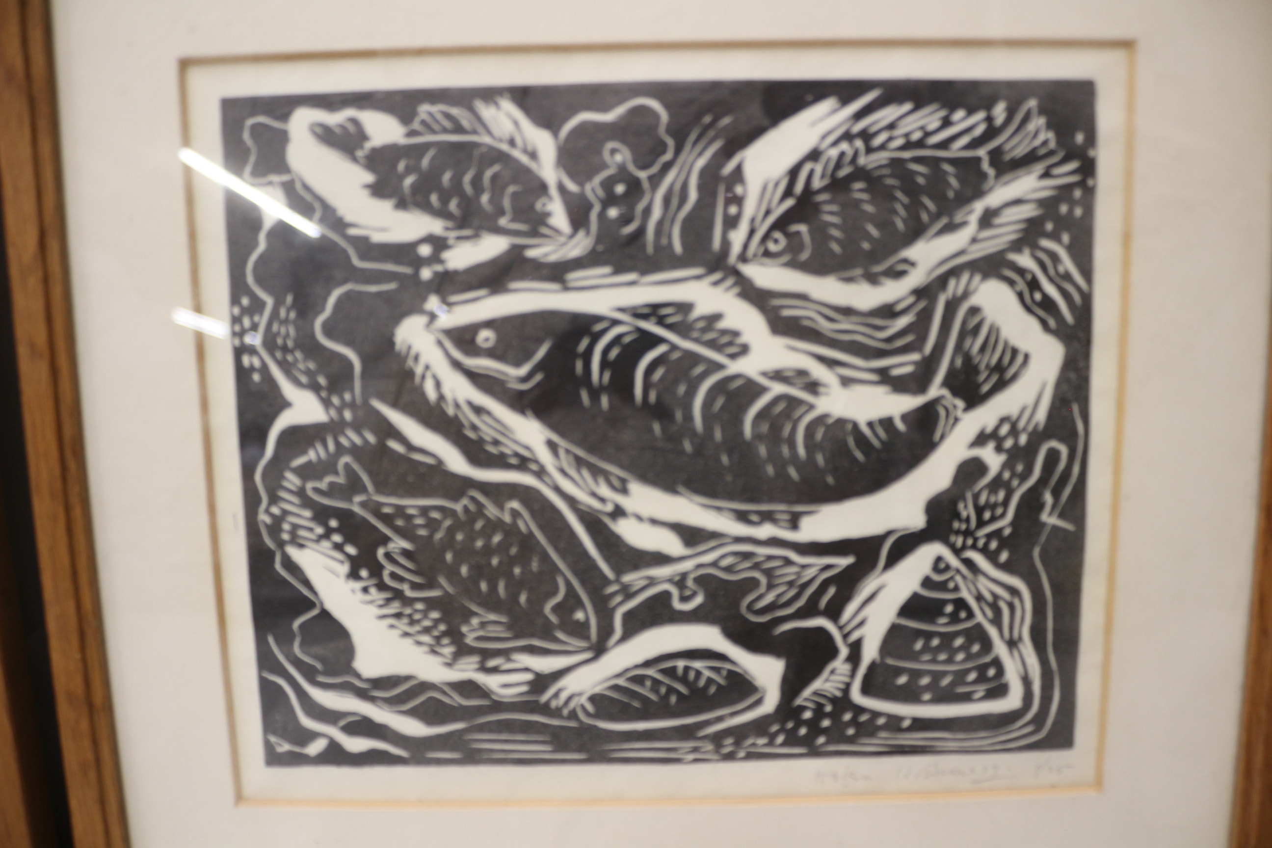 A pair of framed black and white lithograph prints with off-white mats and light brown wooden frames, one depicting a horse and flora 1/25′, the other several fish inscribed 1/25′. 29×30.5cm & 27x33cm