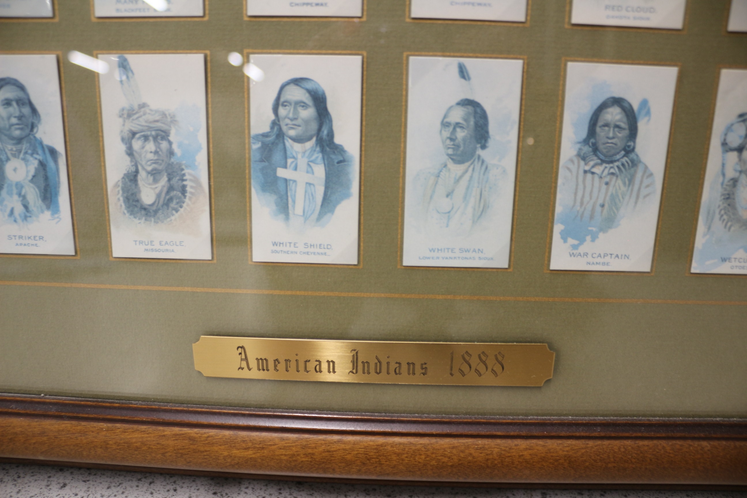 A dark brown framed collection of 50 blue/grey and white cigarette portrait cards of Native American figures, with an ‘American Indians 1888’ plaque, noted as an authorized re-issue set. 68.5x58cm