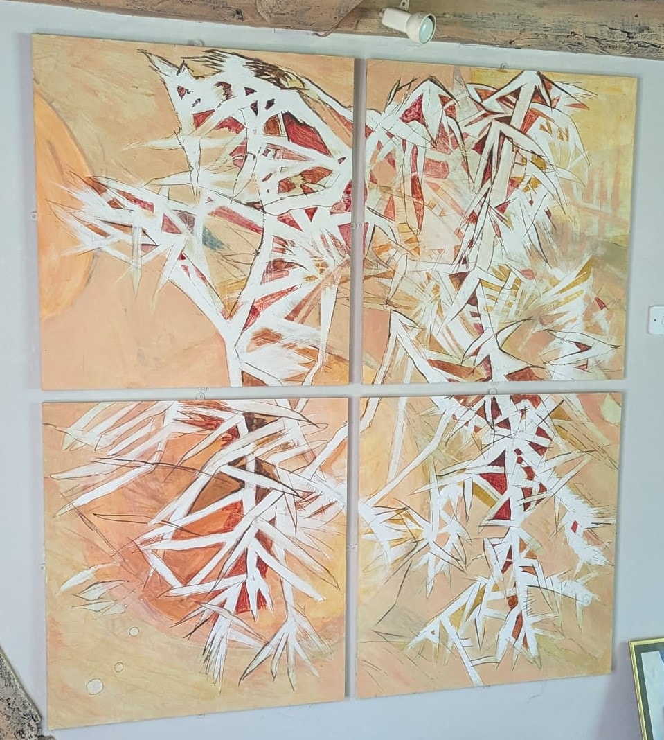 A quadriptych of abstract paintings on wood, featuring white, red, orange, and brown geometric and organic shapes against peach, orange, and light yellow hues. By Internationally Exhibited Carole Andrews. Each piece measures 81x81cm